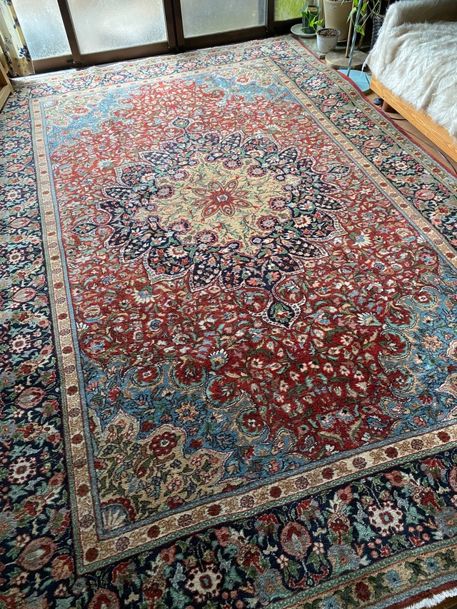 125×175 約2.2平米 すばらしいギャッベ絨毯を一枚ご紹介します。 ペルシャ絨毯です。 あるコレクターの方からゆずっていただいたのですが やっぱり2㎡はちょっと小さいかなと思い、価値がわかる方に お譲りさせていただきます。 新品未使用品ですが、搬送中にちぎれてしまったのか端がちぎれています。 絨毯には関係ないです。絨毯自体は新品未使用の為 新品未使用とさせて頂きます。 またグレーぽい房の色はオリジナルのもので汚れではありません。 へレケの様に真っ白ではございません。 人や、動物、ライオン等びっしりと本当に絵画のように織り込まれている見事なギャッベ 是非一枚良いものを如何でしょうか? 本当に質の高いギャッベはこの半分以下のものでも10万以上しますので、こちら2㎡ですのでお値段以上のものだと思います。 またこちら特にタグなどはついていませんが、1㎝に約6目の大変細かい織りで、柄も本当に細かい素晴らしいものですので、ギャッベのランクとしてはかなり上だと思います。 確証はありませんが、いまままでギャッベを扱ってきた経験としては(トルコ絨毯専門なので、へレケ絨毯ほどの知識はありませんが)端のかがり方や柄のち密さ、織りの引き締まりなどから ゾランヴァリのものではないかと思います。 保障はありませんので、お求めいただいてからほかのペルシャ絨毯屋にゾランヴァリではないといわれたなどの返品は固くお断りいたします。というか誰もわかりません。 万が一ゾランヴァリの新品のもので質のよいものですと、お店により違いますが、1平米20万以上はします。お調べ下さい。 絨毯屋さんはほかの店を悪く言う人が多く、以前もお話ししたと思いますが、 私もシュメル工房の倉庫から買った正真正銘のへレケ絨毯を家に積んで置いたら 他の絨毯屋さんが家にほかの絨毯を持ってきたときに、これは本当ではなく中国の模倣品だ。 気を付けた方がよいと言っていたので驚きました。 少なからずそういうこともありましたので絨毯屋さんは嫉妬深いのかなと思った時も多かったです。 やはり誰に何を言われようとご自分の目で確かめて、判断されることをお勧めいたします。 そして自分が選んだものには責任を持つことも大切だと思います。 いくら画像上とはいえ、(コロナ過以来ほとんどのものを私は画像のみで トルコから買い付けています)やはり慧眼があれば、良いものを選ぶことが出来ると思います。