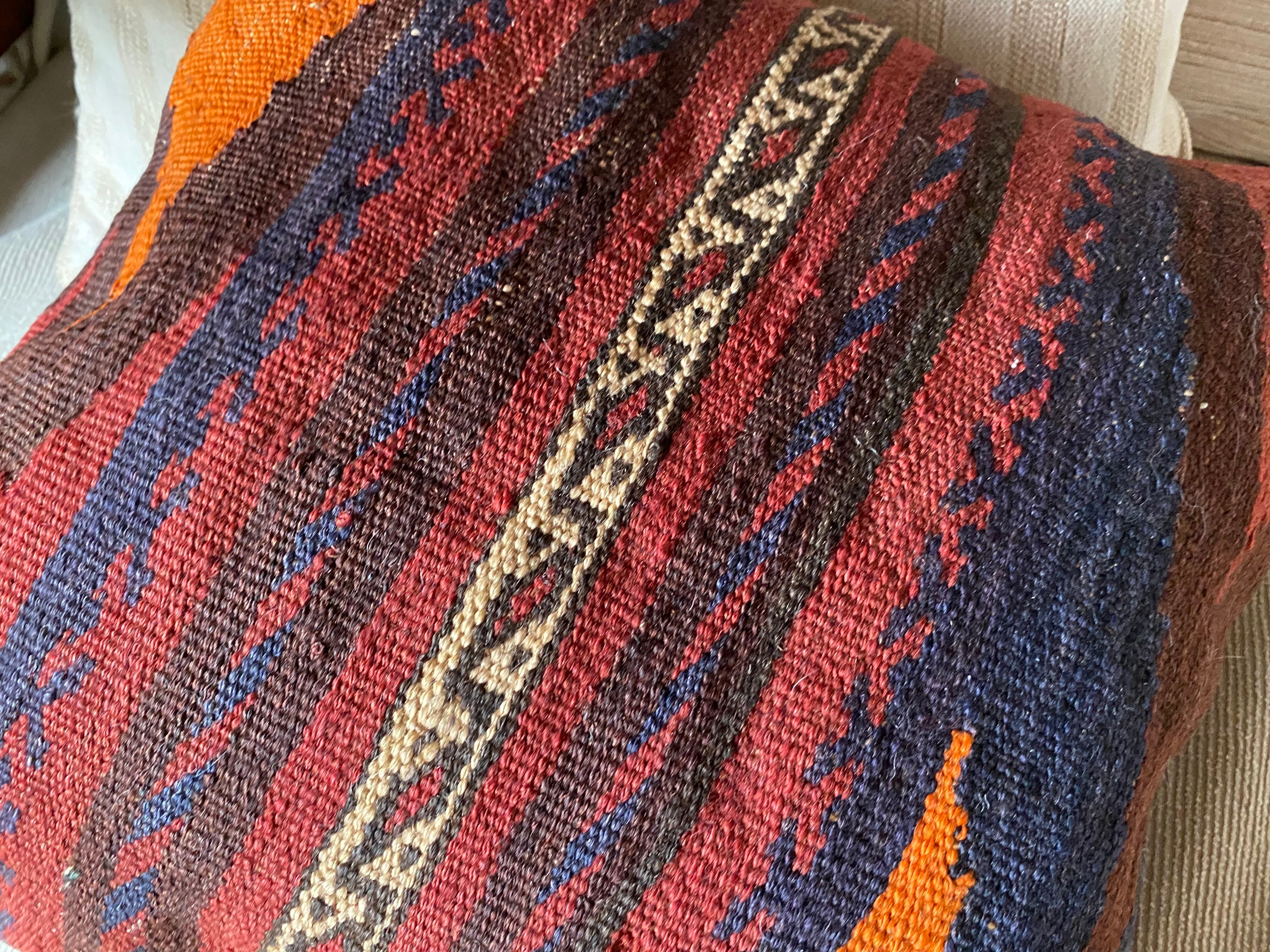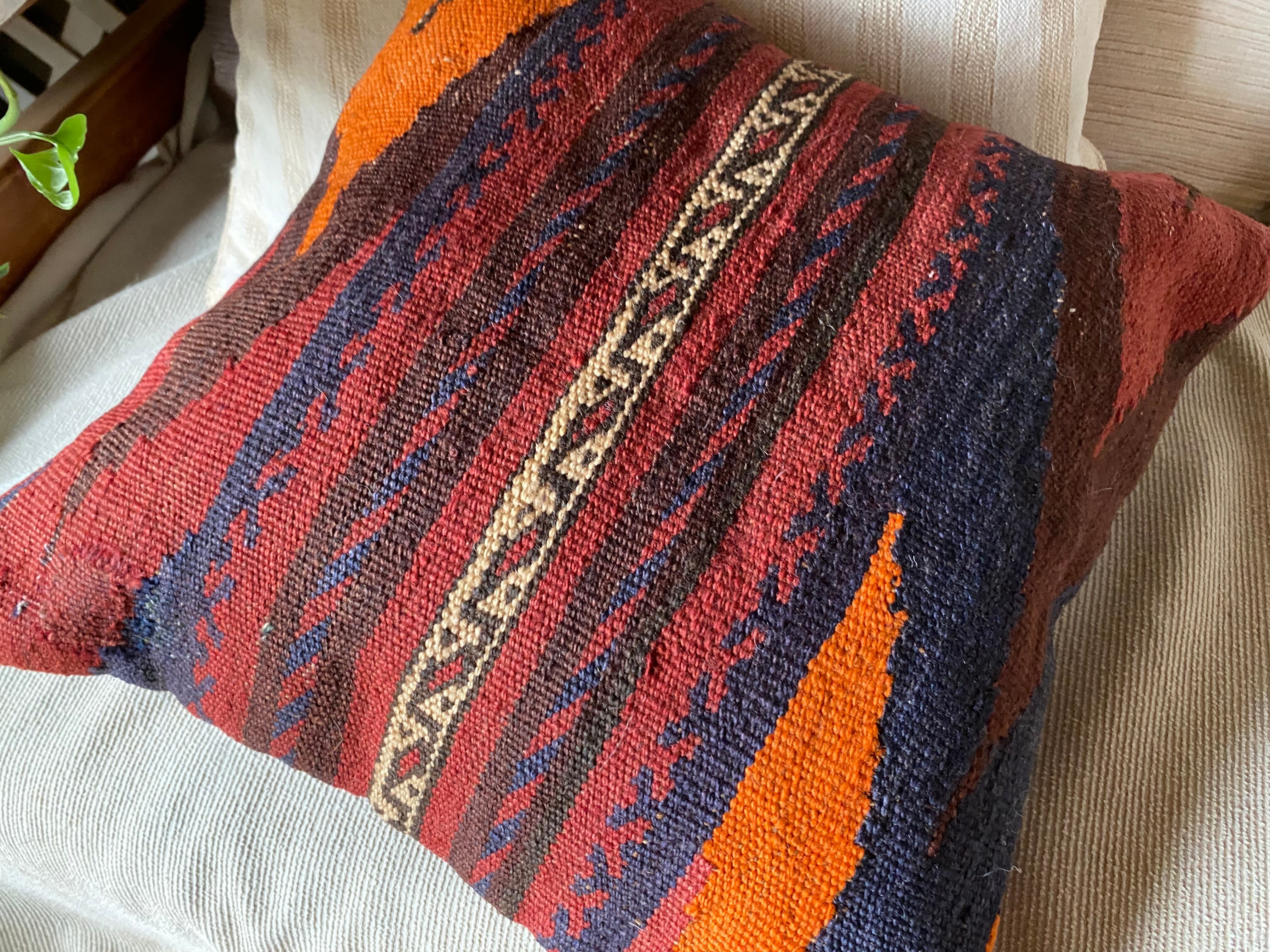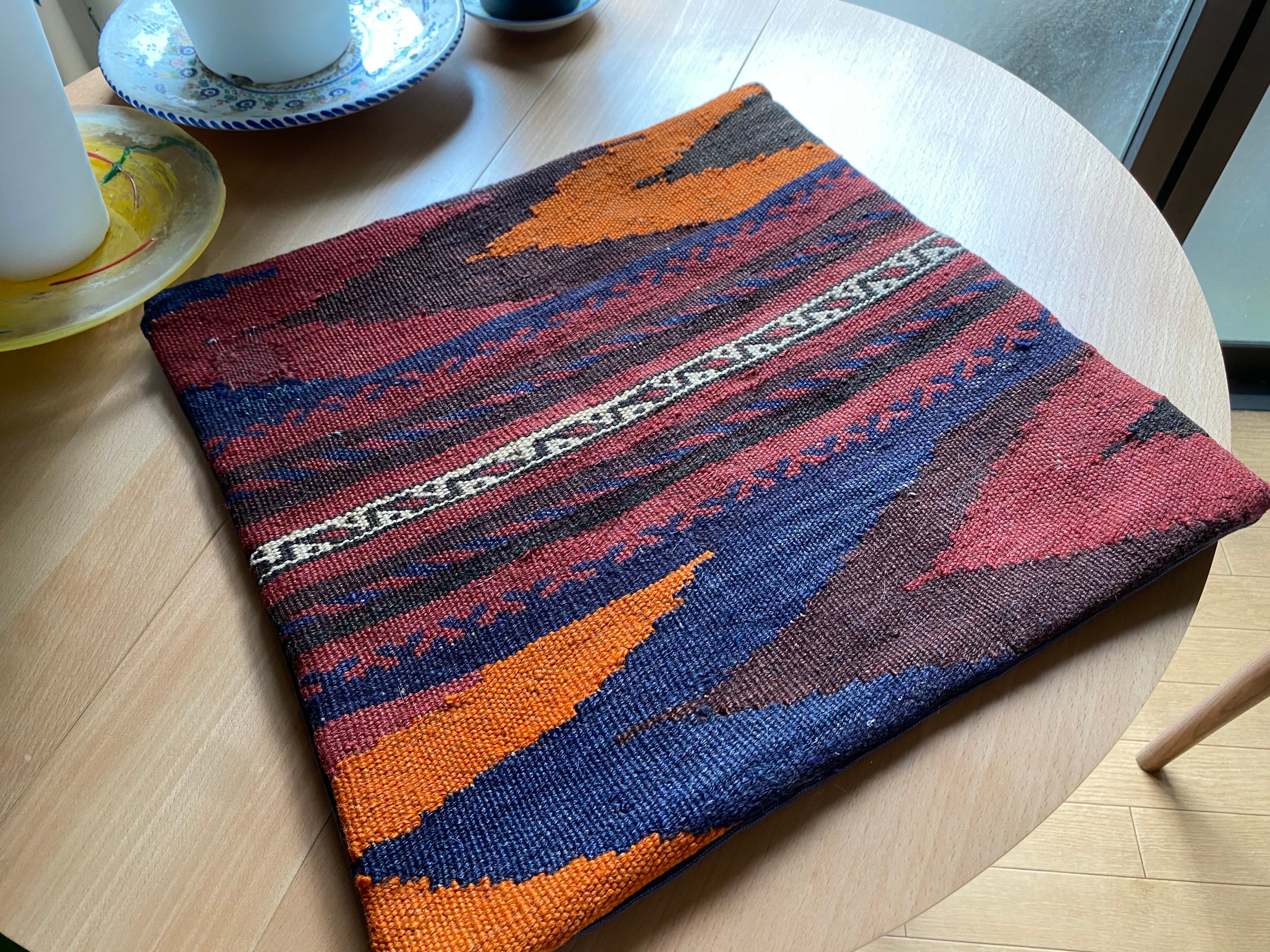 オールドキリム~アンティークキリムから作ったカバーには多少の色染みや、修理跡のあるもの、セミアンティークなどは縦糸 が見えているものもございます。
