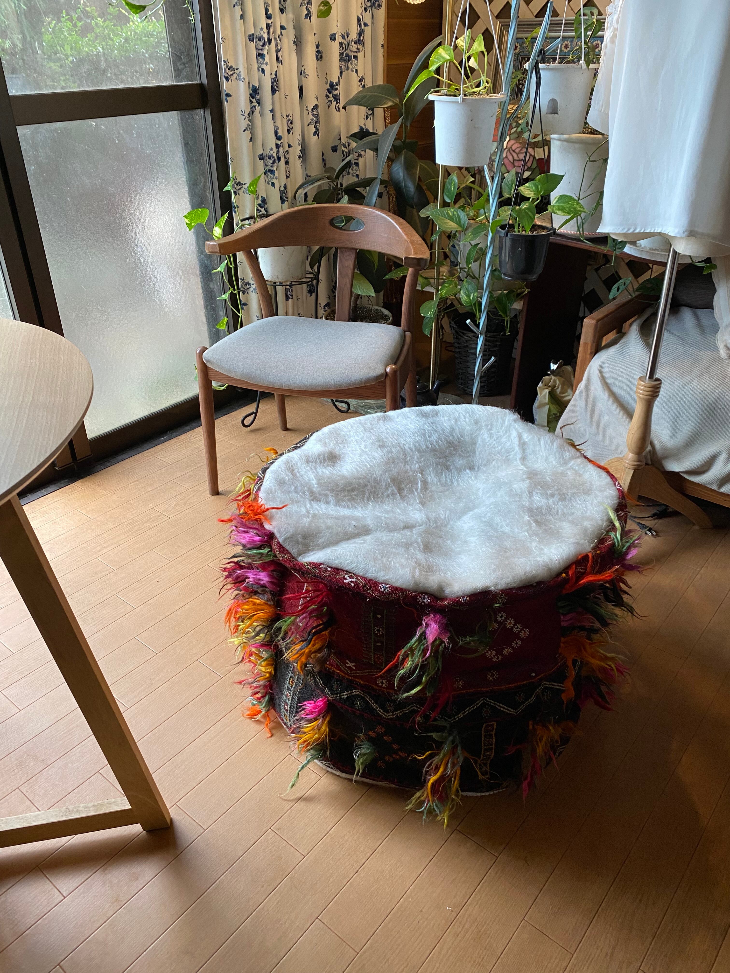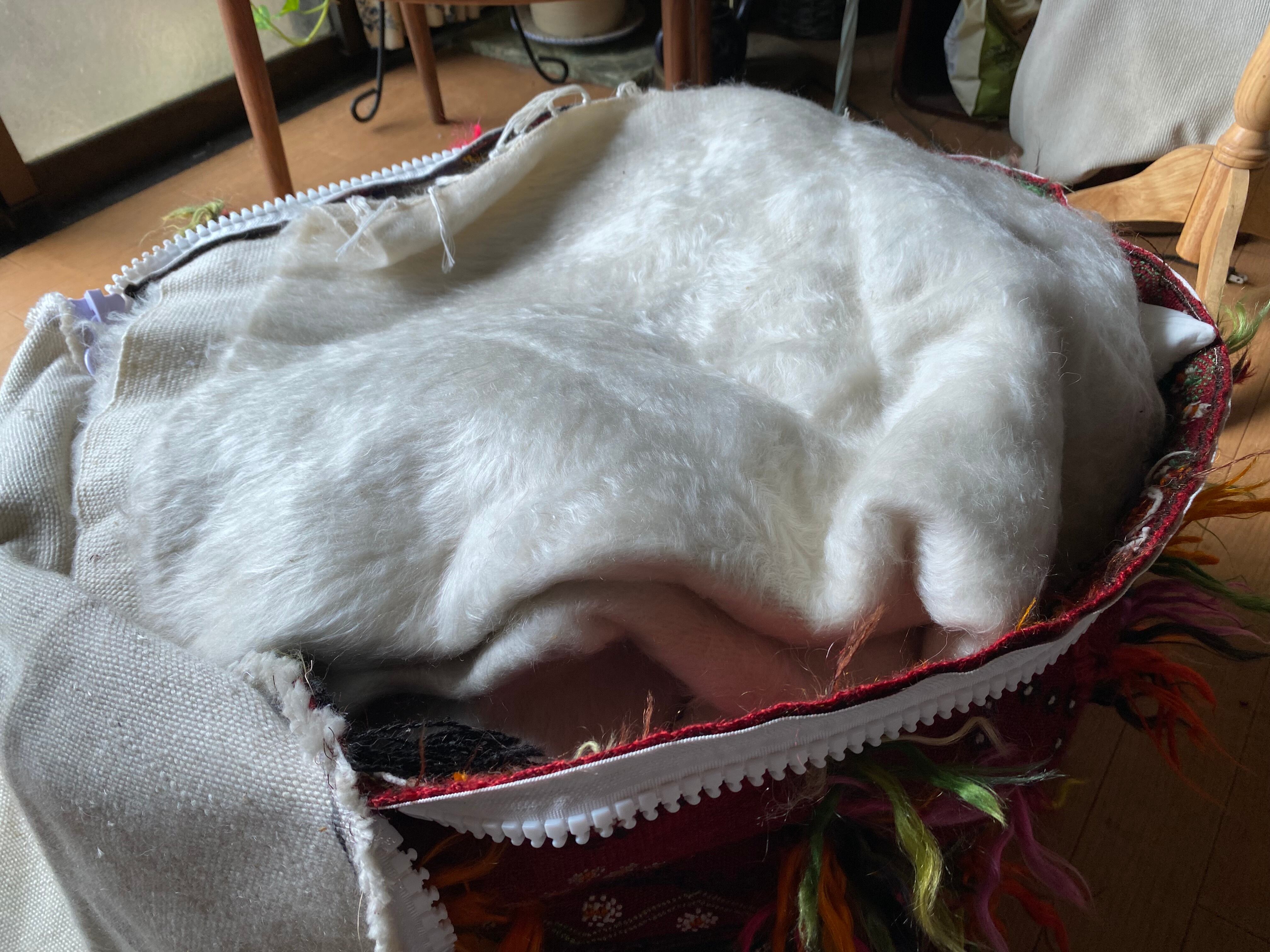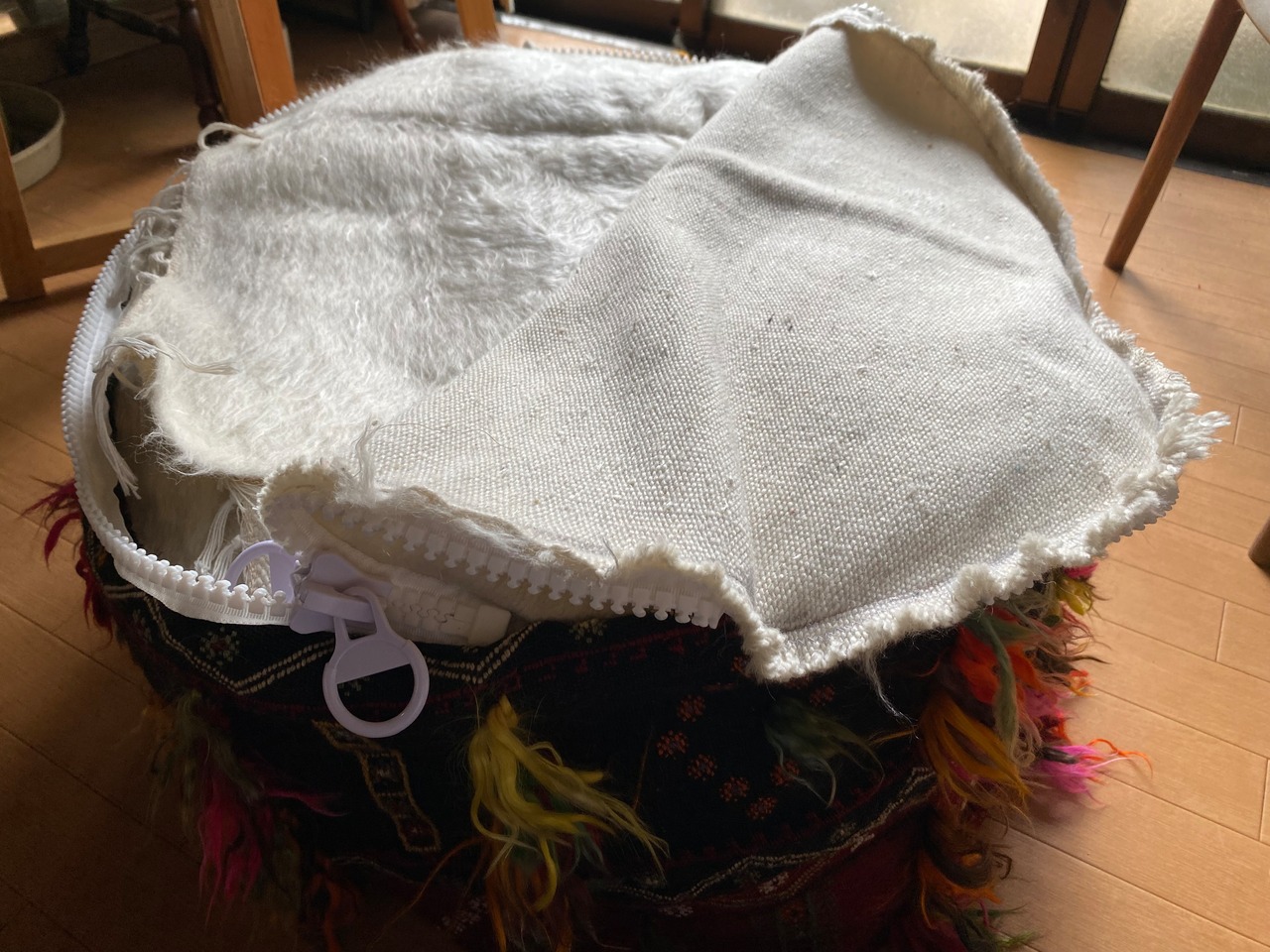 白いシイルトバッタニイェと レイハンルのジジムで かなり大きなプフを製作してみました。 中身を入れずに潰して使っても厚みがありクッションカバーになりますし、 今回は45×45のヌードクッション4つ、同じくらいの大きさのぬいぐるみ1つと昨日ご紹介のシイルトバッタニイェとさらに大きな 120×180のシイルトバッタニイェを入れましたがまだかなり入る感じです。 太鼓のようで、座るととふわふわで快適です。 もちろんわんちゃん猫ちゃんにも大人気であるのは間違いないです。 アンティークのレイハンルを約2m使ってますので ゴージャスで素敵!世界に一つのみです。 レイハンルジジムだけでも3万以上ですが 今回初めての製作ですので お安くお譲りさせていただきます。 2年くらい前にいくつか作ったプフは直径40センチくらいのもので24800円で出しておりました。 ファスナーはかなり巨大ですが その分開けやすいです。ファスナーが見えるのがお気になる方は 下にしてしまえば見えません。