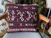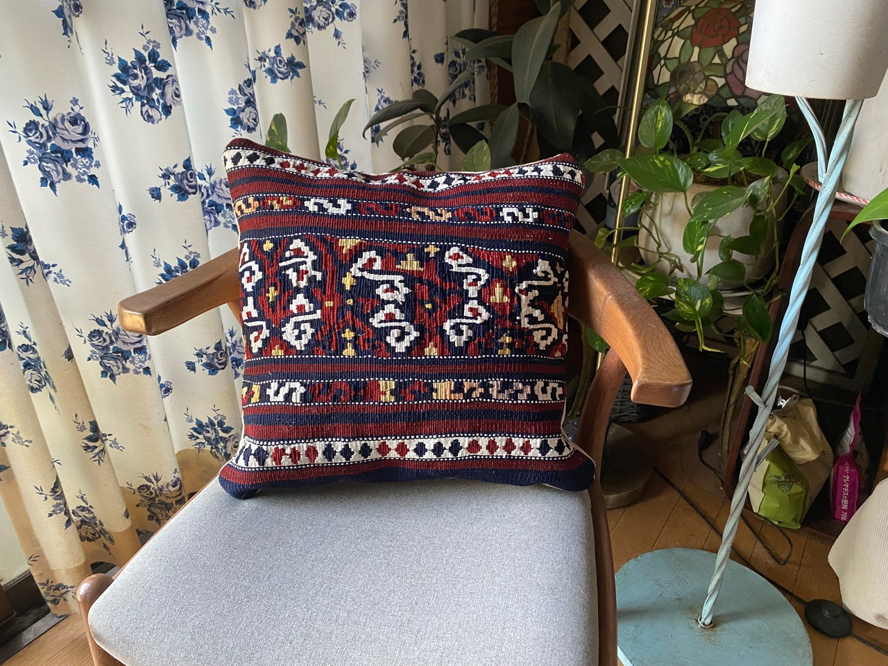 オールドキリム~アンティークキリムから作ったカバーには多少の色染みや、修理跡のあるもの、セミアンティークなどは縦糸 が見えているものもございます。