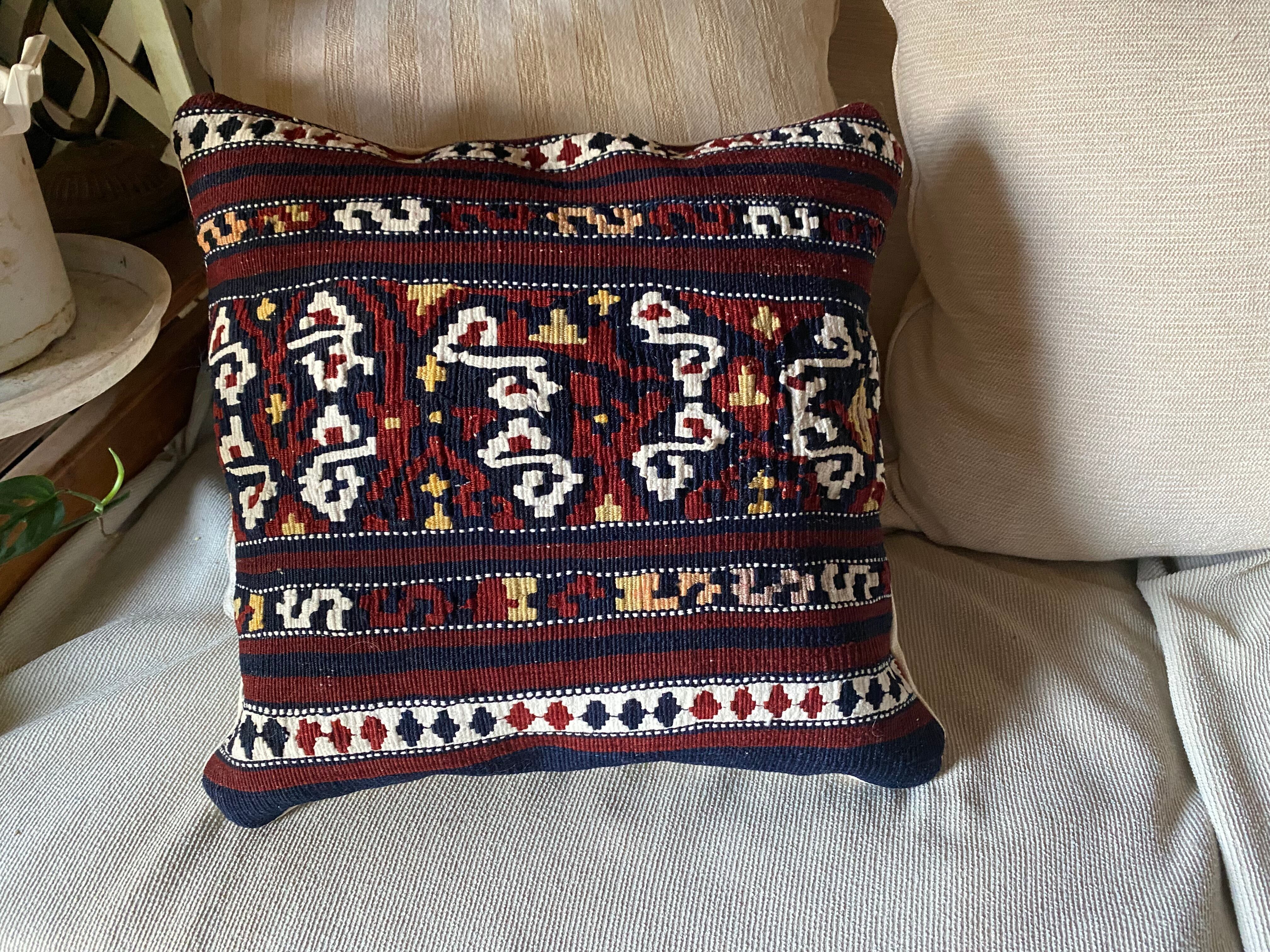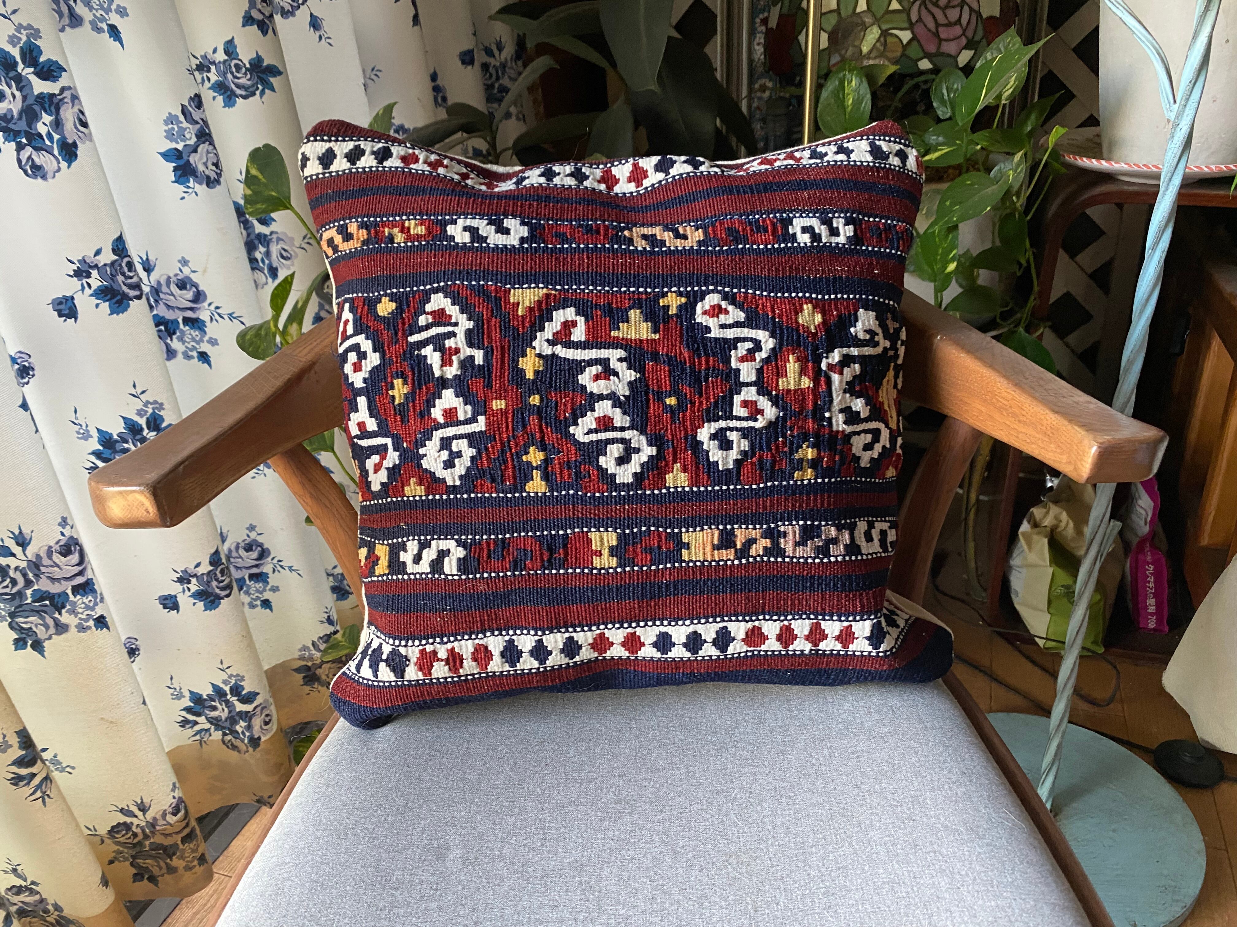厳選したオールドキリムをカットして作ったカバーです。通常観光地などで販売されているカバーはトルコの絨毯屋で、もう捨てるようなはぎれでつく っておりますのでお安く質もあまりよくないものが多いですが、当店のカバーは一つ一つ厳選したキリムをカットして作っております。