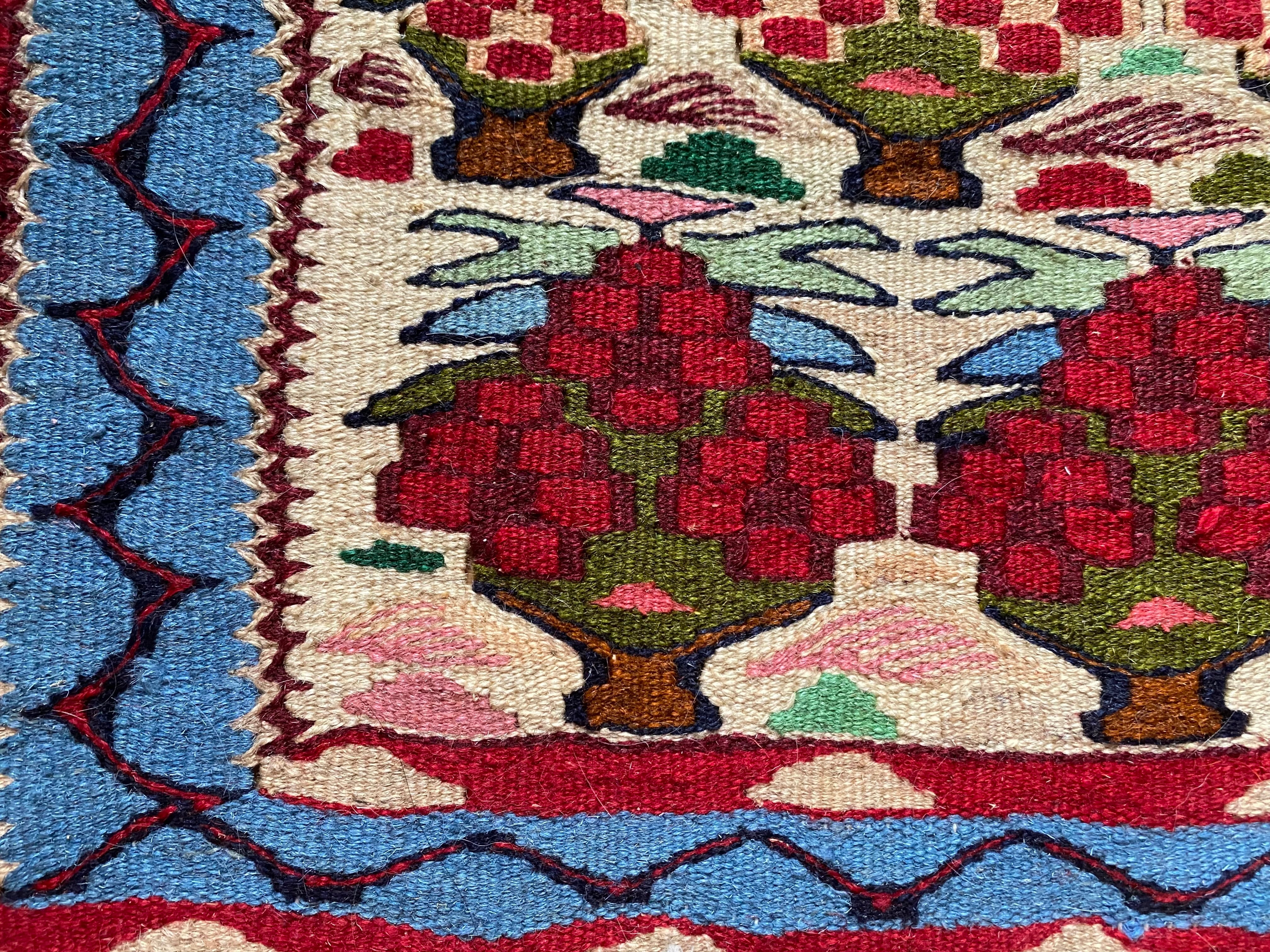 セネキリムは現在のイラン、クルディスタンにのセネ(現在はサナンダジという場所だそうです)で織られたキリムで、とても不思議なヘラティ模様という柄の大変細かいキリムです。