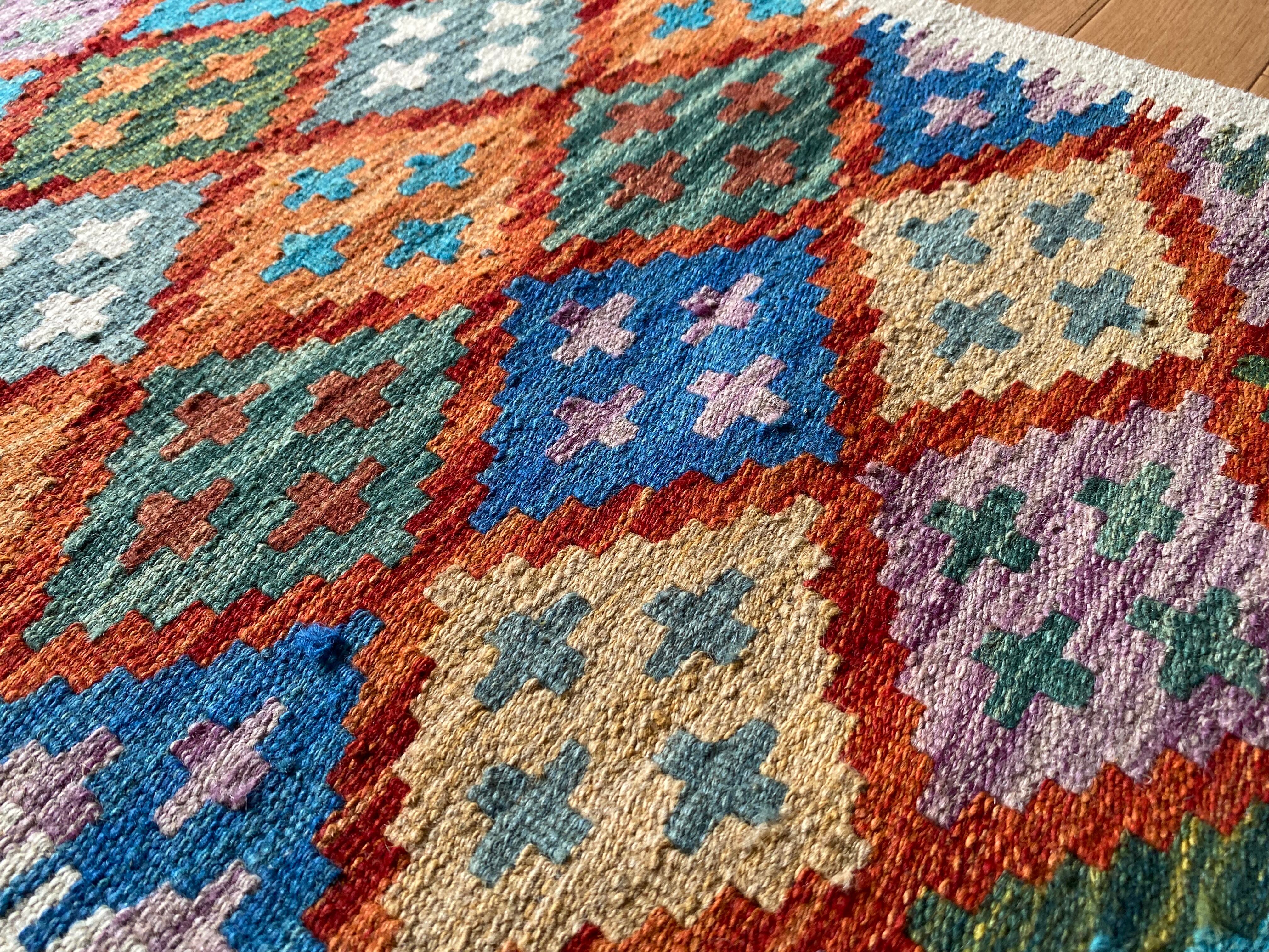 アフガニスタンの素敵なキリムをご紹介させていただきます。 日本ではご紹介されていない当店のみの素敵なキリムです。 新しいキリムになります。 ウールで織られています。 アフガニスタンはバルーチを始め、大変質の良いウールで織られた味のある部族系のキリムや絨毯が多いです。 こちらは、新しいニューキリムと呼ばれるキリムで、もちろん100%ウールです。 草木染をつかい、カラフルで、とても素敵なキリムで、観葉植物にもあう素敵なキリムです。是非お部屋のアクセントに 手に入れませんか?織りも細かくリバーシブルで使える素敵なキリム。 今回お試しで仕入れましたのでかなりリーズナブルにご紹介しております。在庫は数枚のみの為、ぜひ手に入れてください。 素敵なキリム、絨毯は、30年近いトルコ在住経験があり、25年の販売実績のある当店で手に入れてください!
