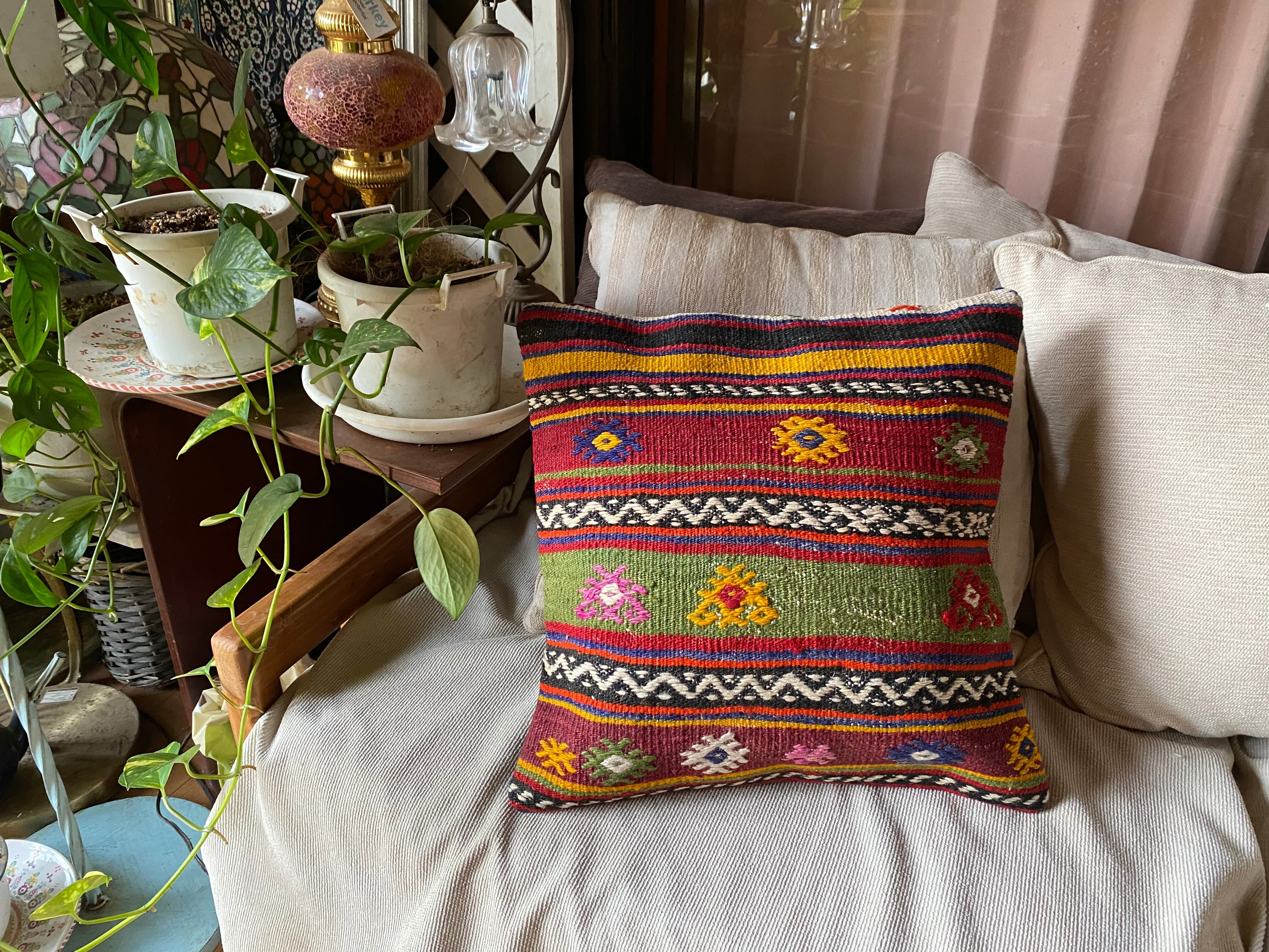 厳選したオールドキリムをカットして作ったカバーです。通常観光地などで販売されているカバーはトルコの絨毯屋で、もう捨てるようなはぎれでつく っておりますのでお安く質もあまりよくないものが多いですが、当店のカバーは一つ一つ厳選したキリムをカットして作っております。