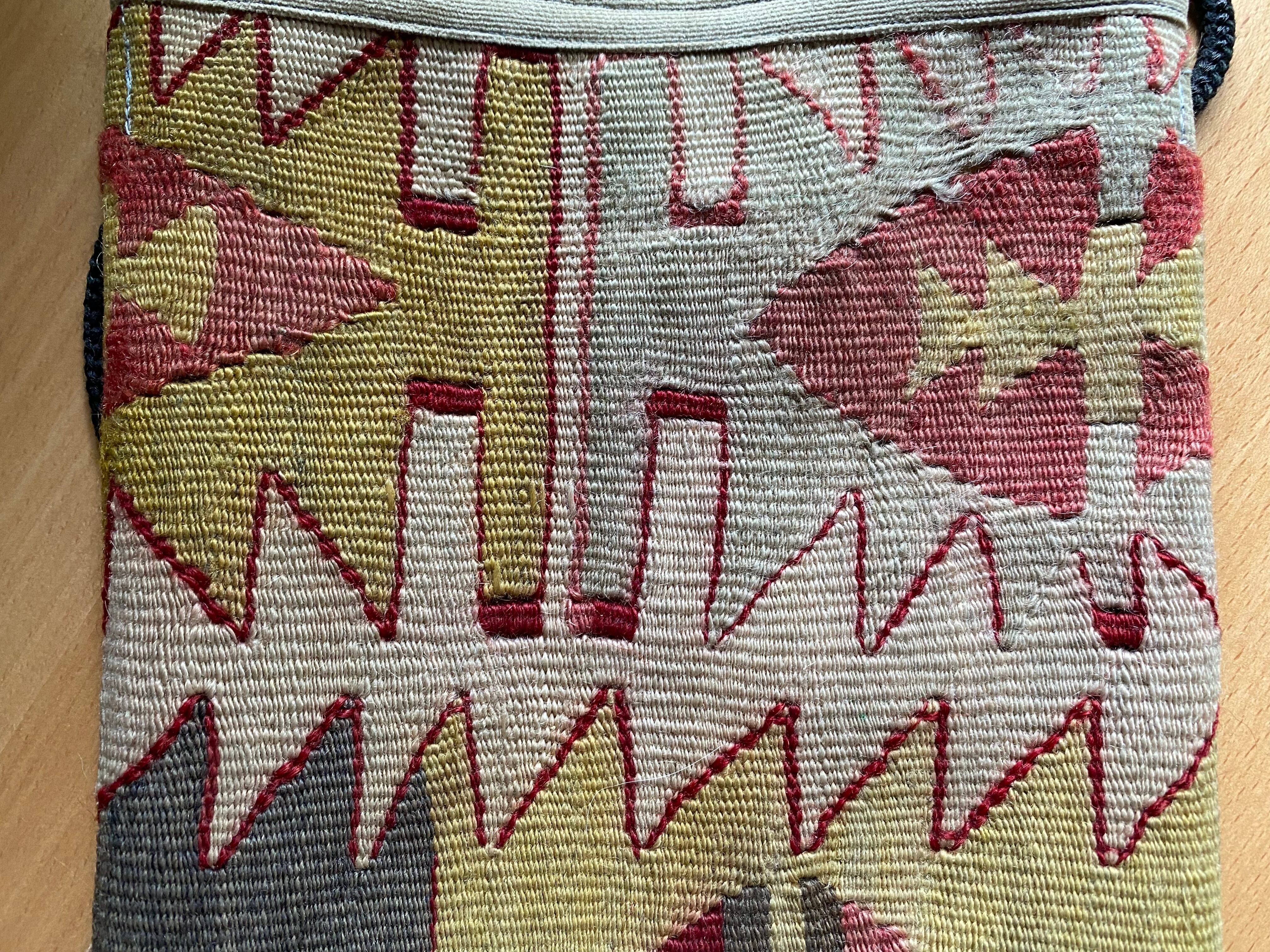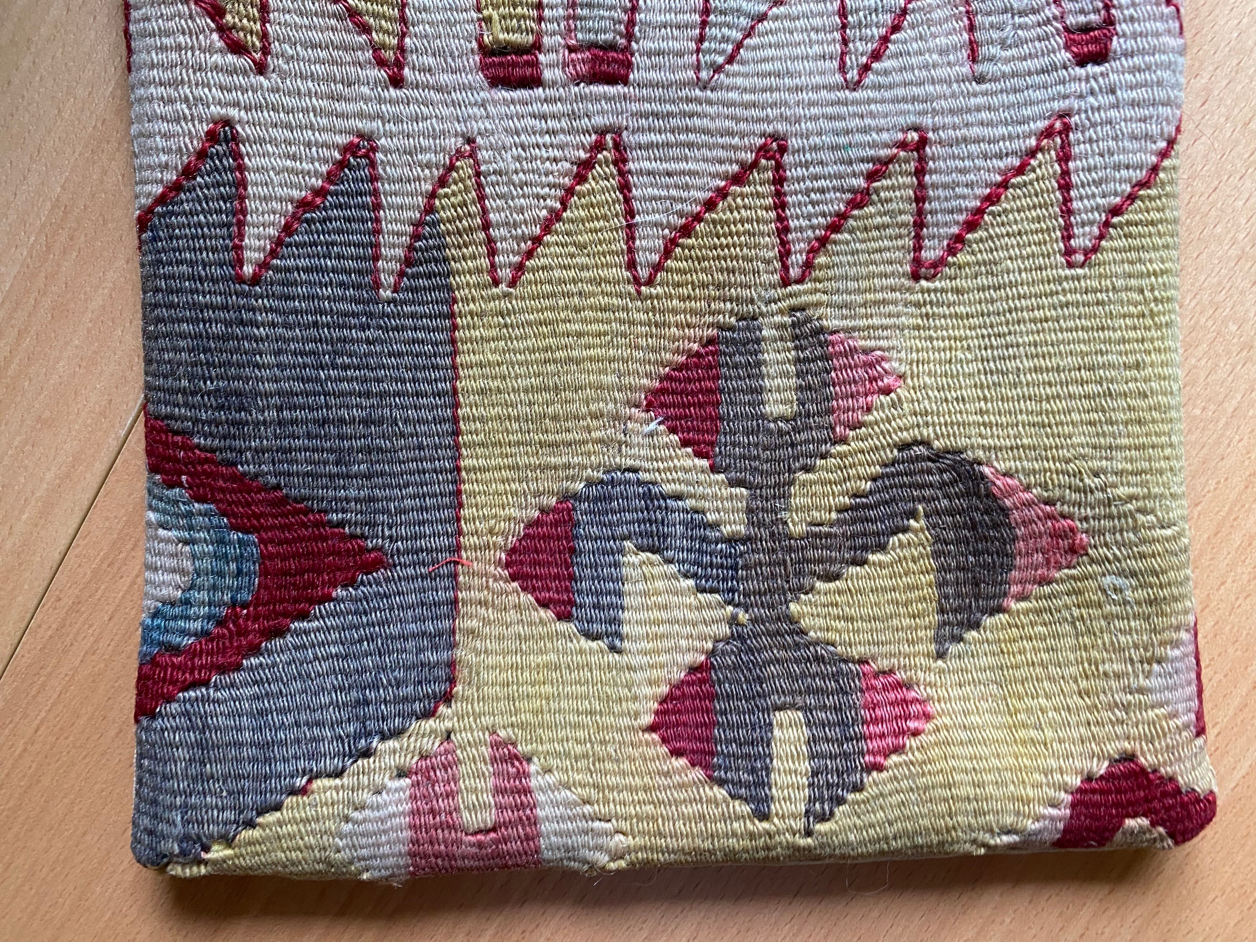 オールドキリム~アンティークキリムから作ったカバーやサコッシュには多少の色染みや、修理跡のあるもの、セミアンティークなどは縦糸 が見えているものもございます。また小さな穴がある場合もございます。アンティークの特性として