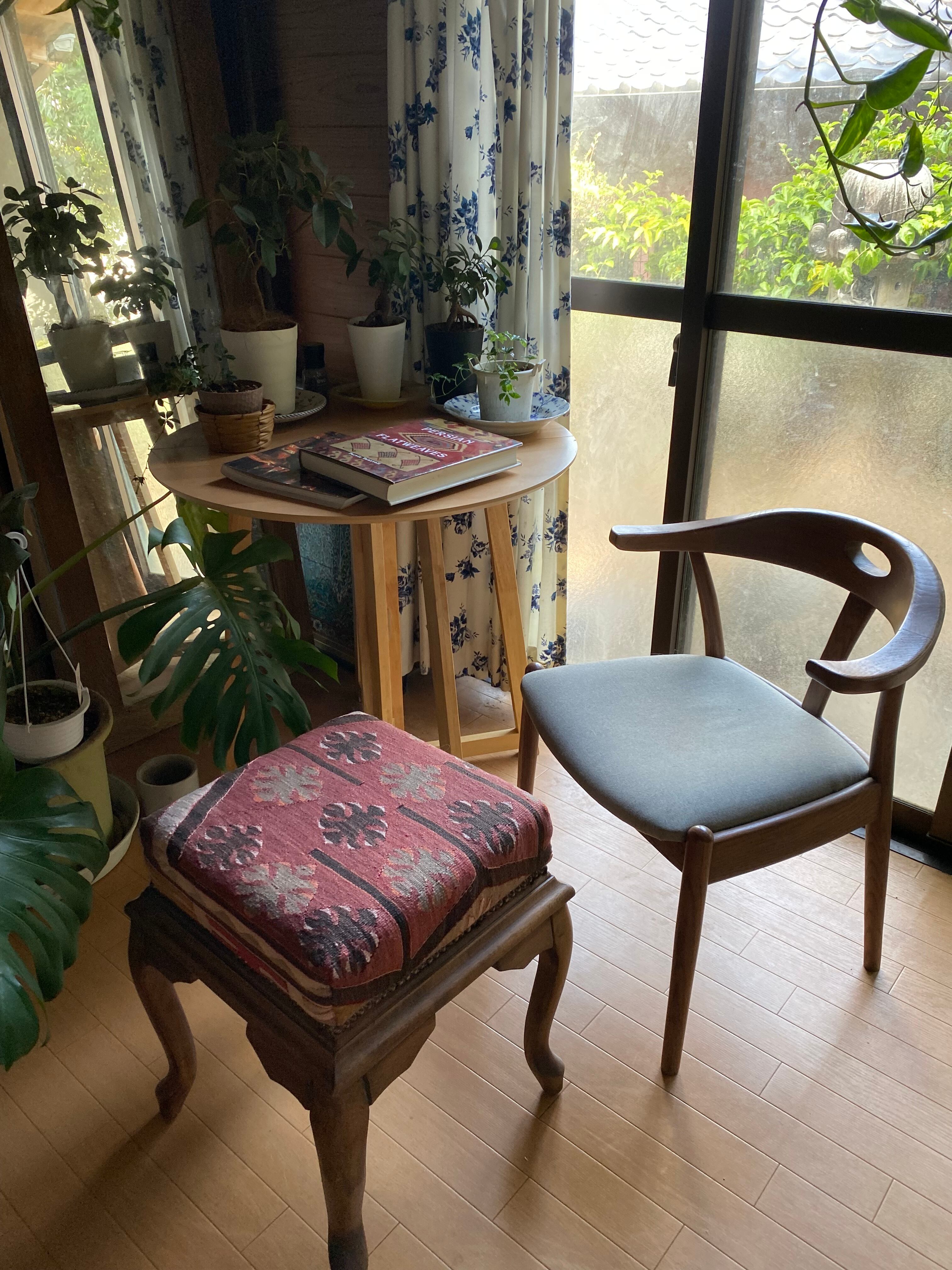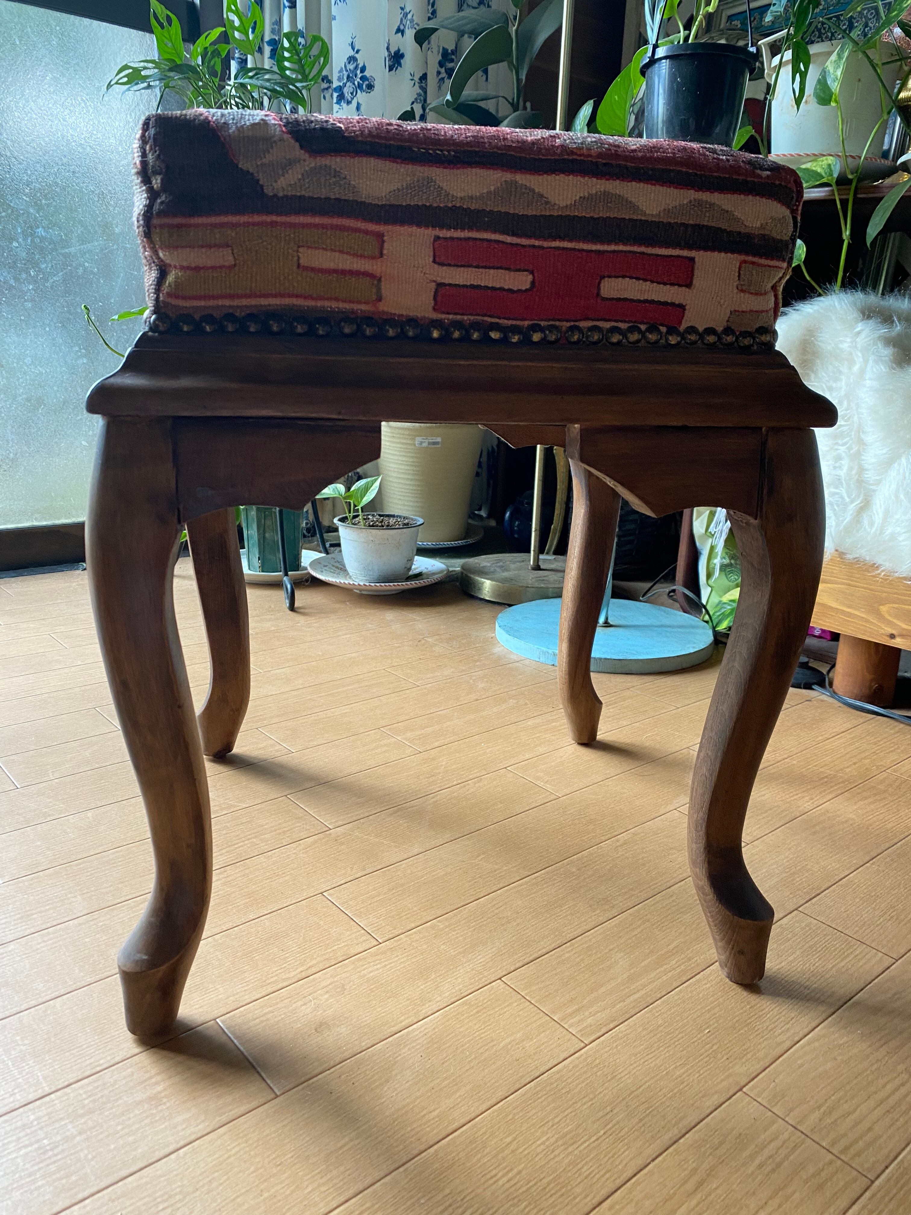 贅沢に素敵なキリムをつか っています。重さは4.6キロあります。 送料に5000円以上かかりますが送料込みの金額です。日本に送ってから日本からの発送です。 すぐにとどきます 椅子自体は、アンティークではなく、新しいものですが無垢材をつかっているもので、高級になります。 しっかりしてひとつひとつてづくりものです。 キリムを鋲で留めた形になりますのでとても丈夫です。 キリムの下は堅めのスポンジのようになっていますので、足を置いても座っても大変心地よいです