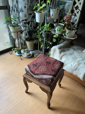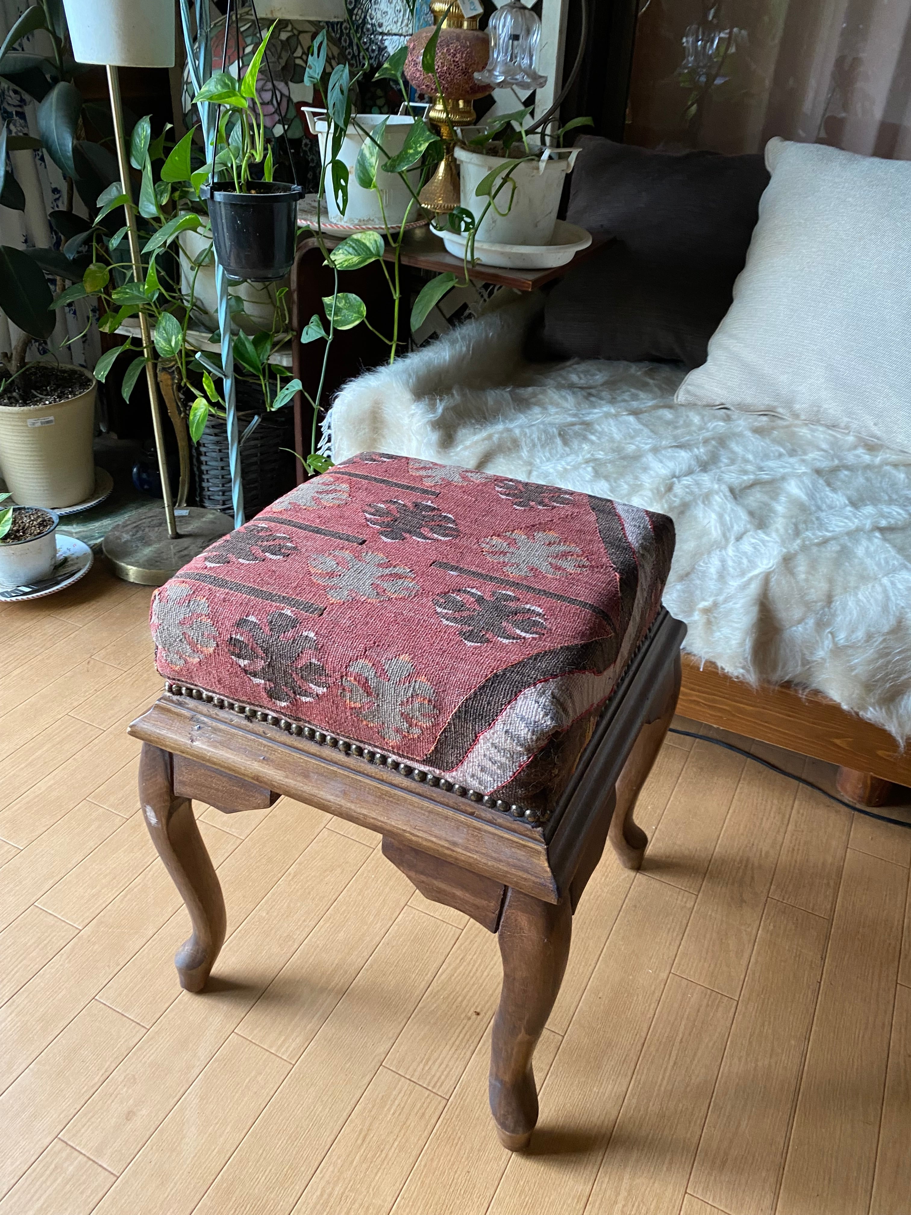 草木染めの貴重なカイセリアンティークキリムでオットマンをつくってみました。 収納袋のタイプではなく木をつかった椅子のタイプのオットマンです。オールドキリムをつかっておりますので、通常日本ではこれより小さなものでも、 40000円以上しているものだとおもいます。トルコ現地より卸売りでご紹介いたします。 モロッコではプフと呼ばれているそうでが、こちらトルコでもプフとかオットマンともいいます。 。 ソファに座った時の足置きのことです。 贅沢ですね。もちろん椅子としてもお使い頂けます。私は椅子として使っています。木はシデの木をつかっています。シデの木はとても丈夫で 堅いそうです