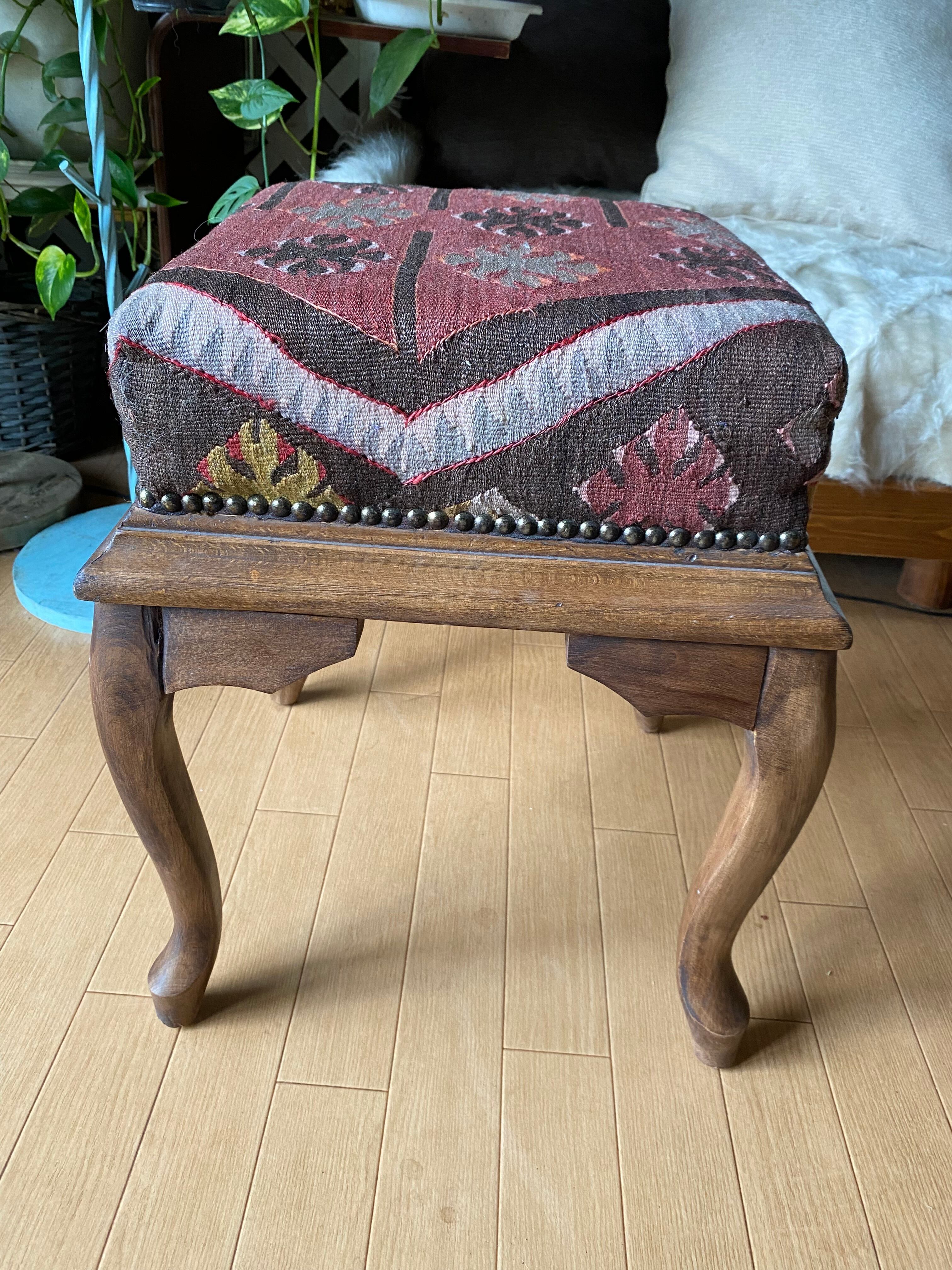 秋の模様替えに!オールドカイセリキリムと無垢の木のお洒落なオットマン!トルコから直輸入通関済些細な訳有アウトレット価格即決送料込み