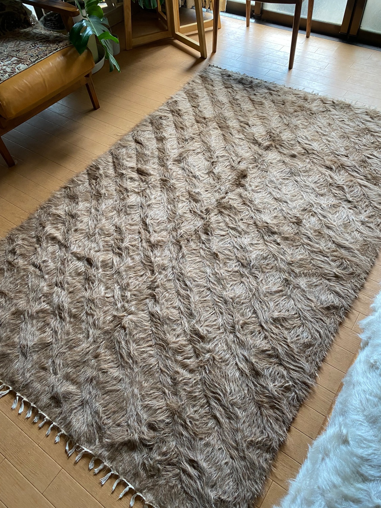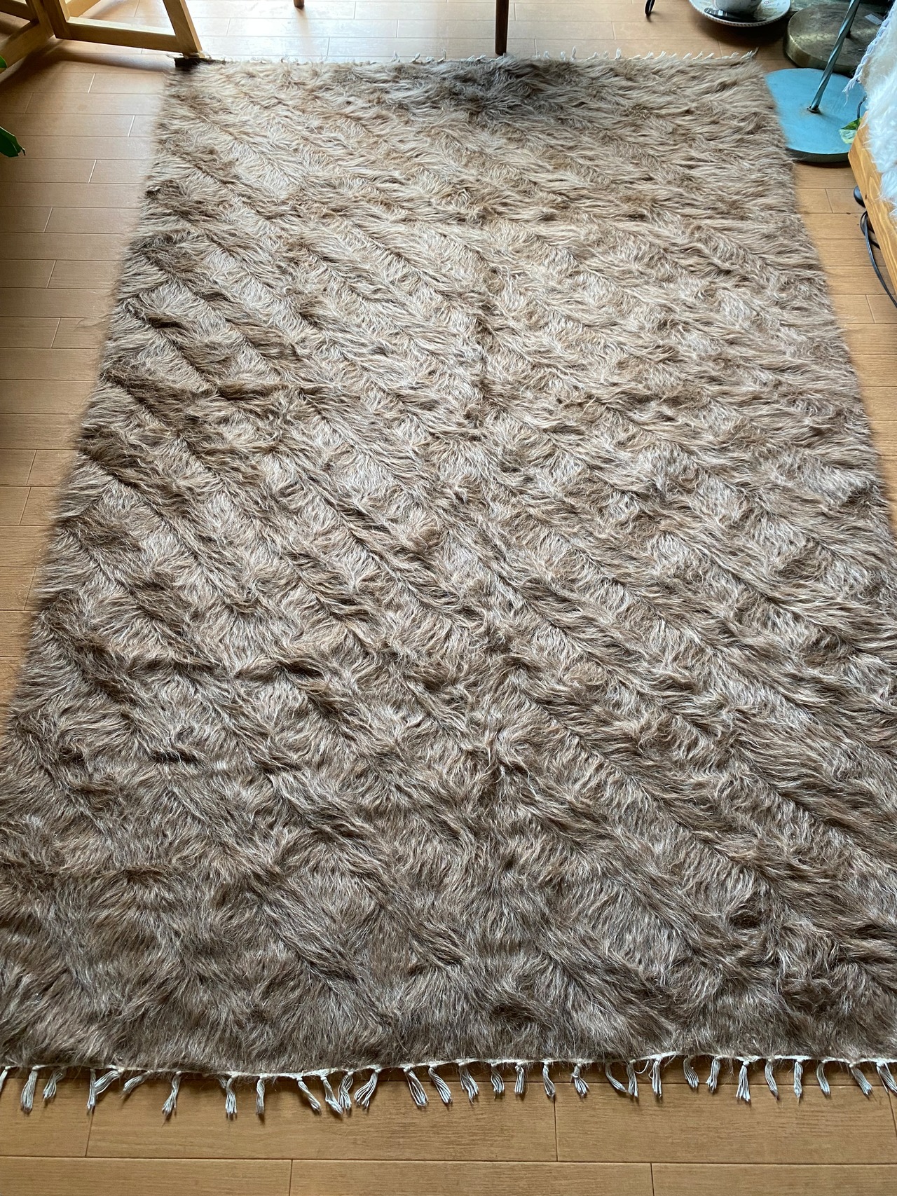 今の新しいものにくらべ、アンティークのバッタ二エと同じくらい密度が濃く、毛の艶がさらに良い山羊の毛で織られています。 未使用ですが、 ご覧いただけますように毛足も眺めでつやつやです。30〜40年ほど前に織られていますが、ほぼ未使用のヴィンテージ未使用品になります。