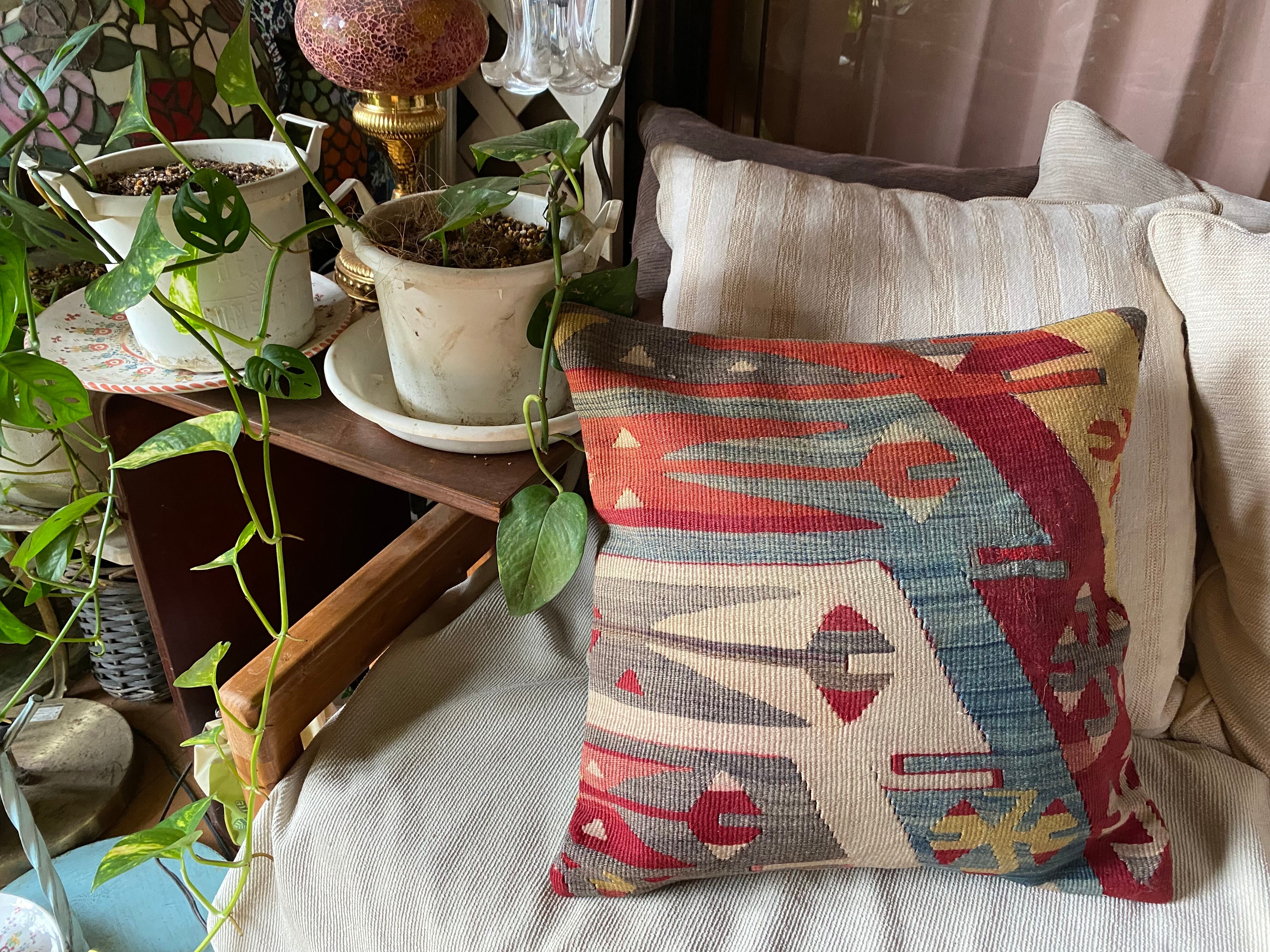 トルコキリムクッションカバーは25年キリム、絨毯販売の当店で!濃淡が素敵な良い織りウシャックキリムクッションカバー!お部屋の模様替え