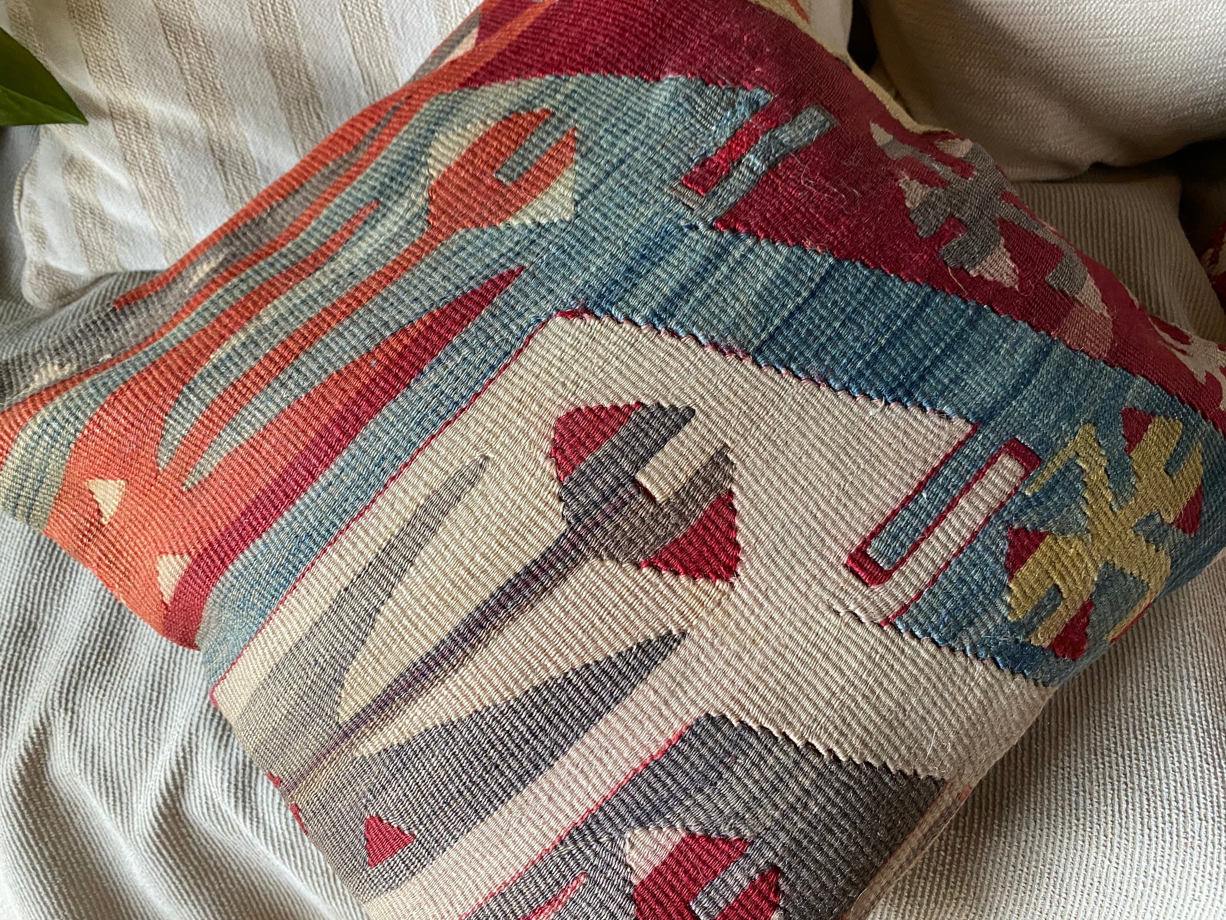 オールドキリム~アンティークキリムから作ったカバーには多少の色染みや、修理跡のあるもの、セミアンティークなどは縦糸 が見えているものもございます。