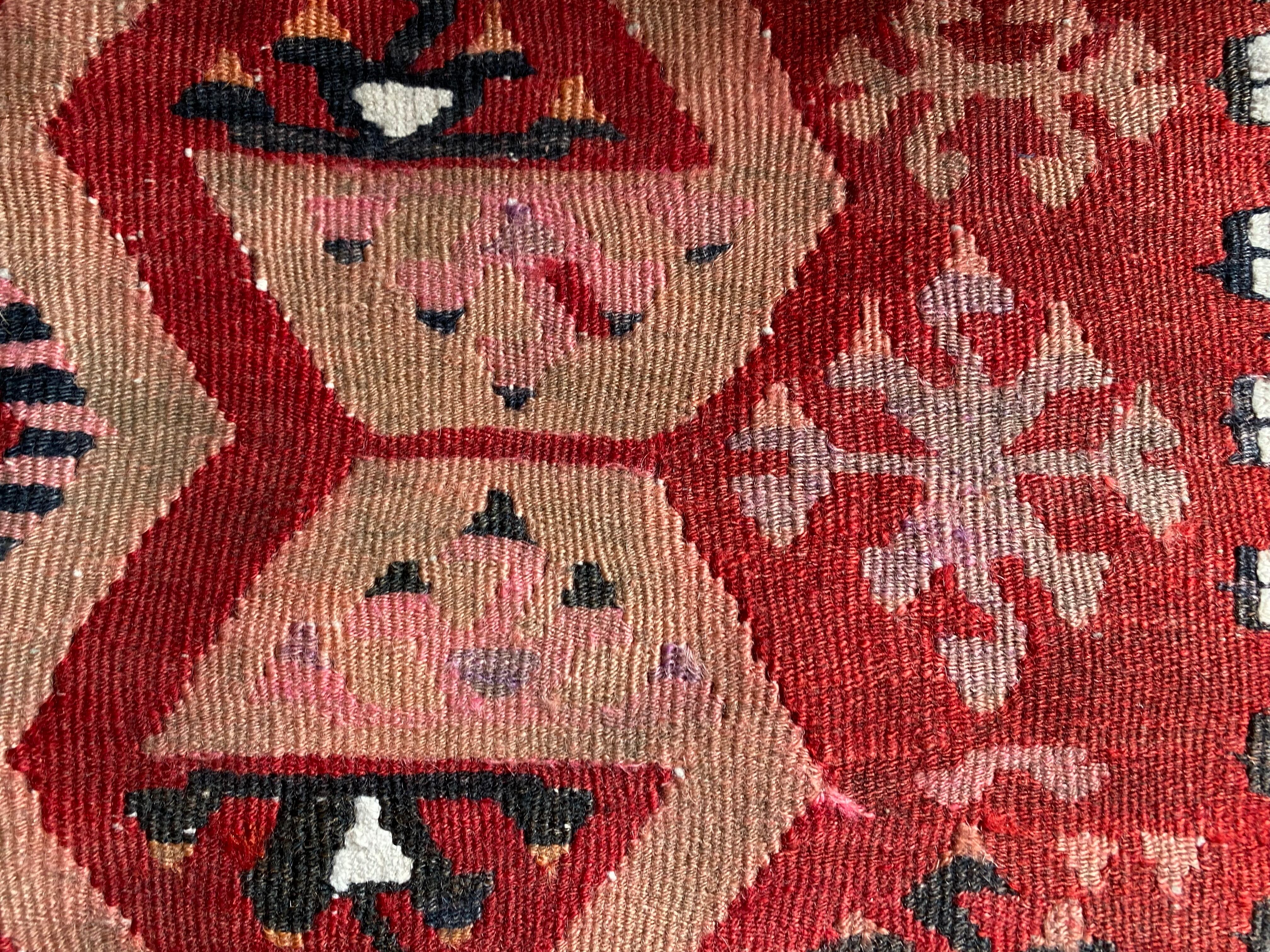 オールドキリム~アンティークキリムから作ったカバーには多少の色染みや、修理跡のあるもの、セミアンティークなどは縦糸 が見えているものもございます。
