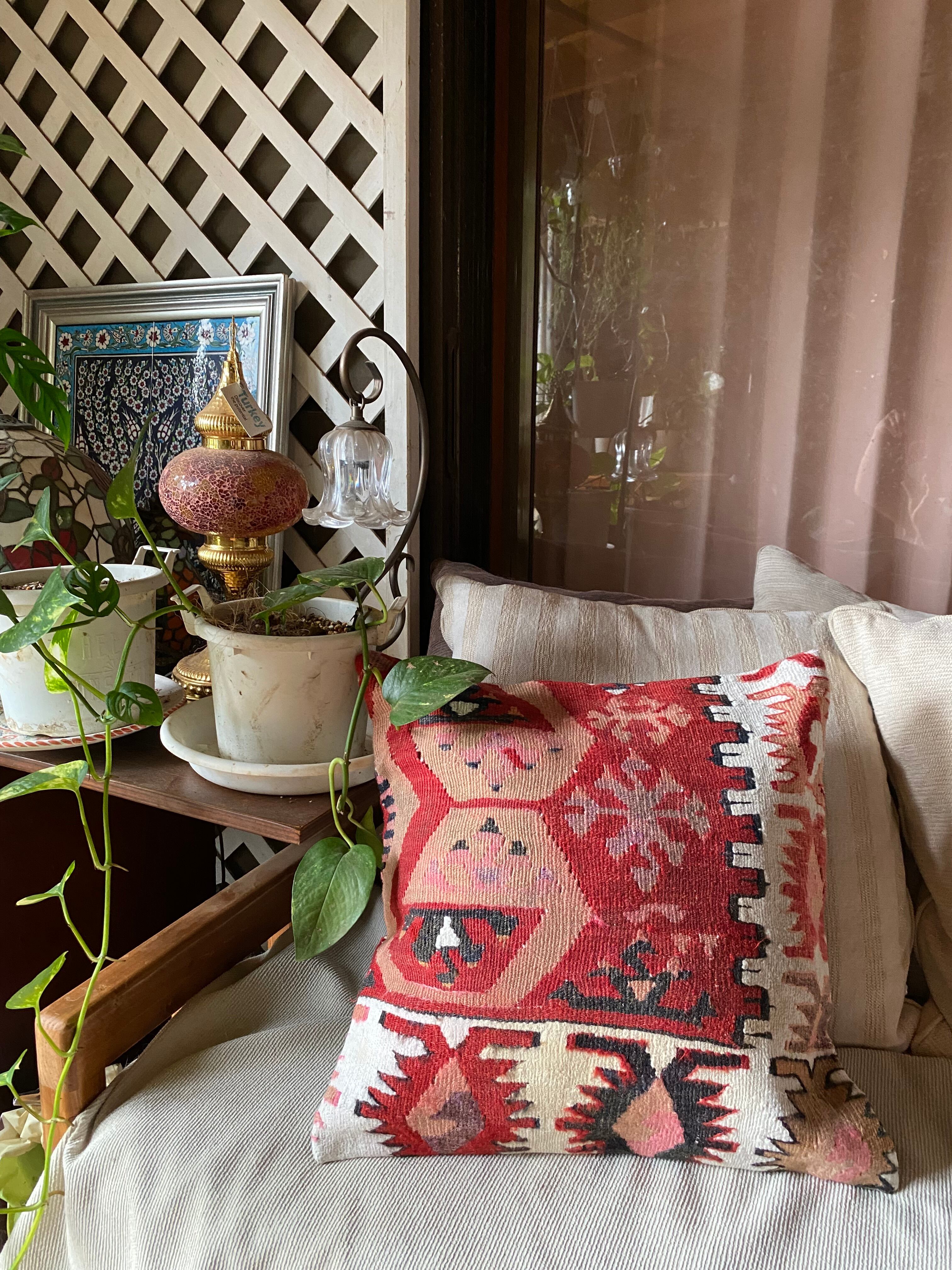 厳選したオールドキリムをカットして作ったカバーです。通常観光地などで販売されているカバーはトルコの絨毯屋で、もう捨てるようなはぎれでつく っておりますのでお安く質もあまりよくないものが多いですが、当店のカバーは一つ一つ厳選したキリムをカットして作っております。