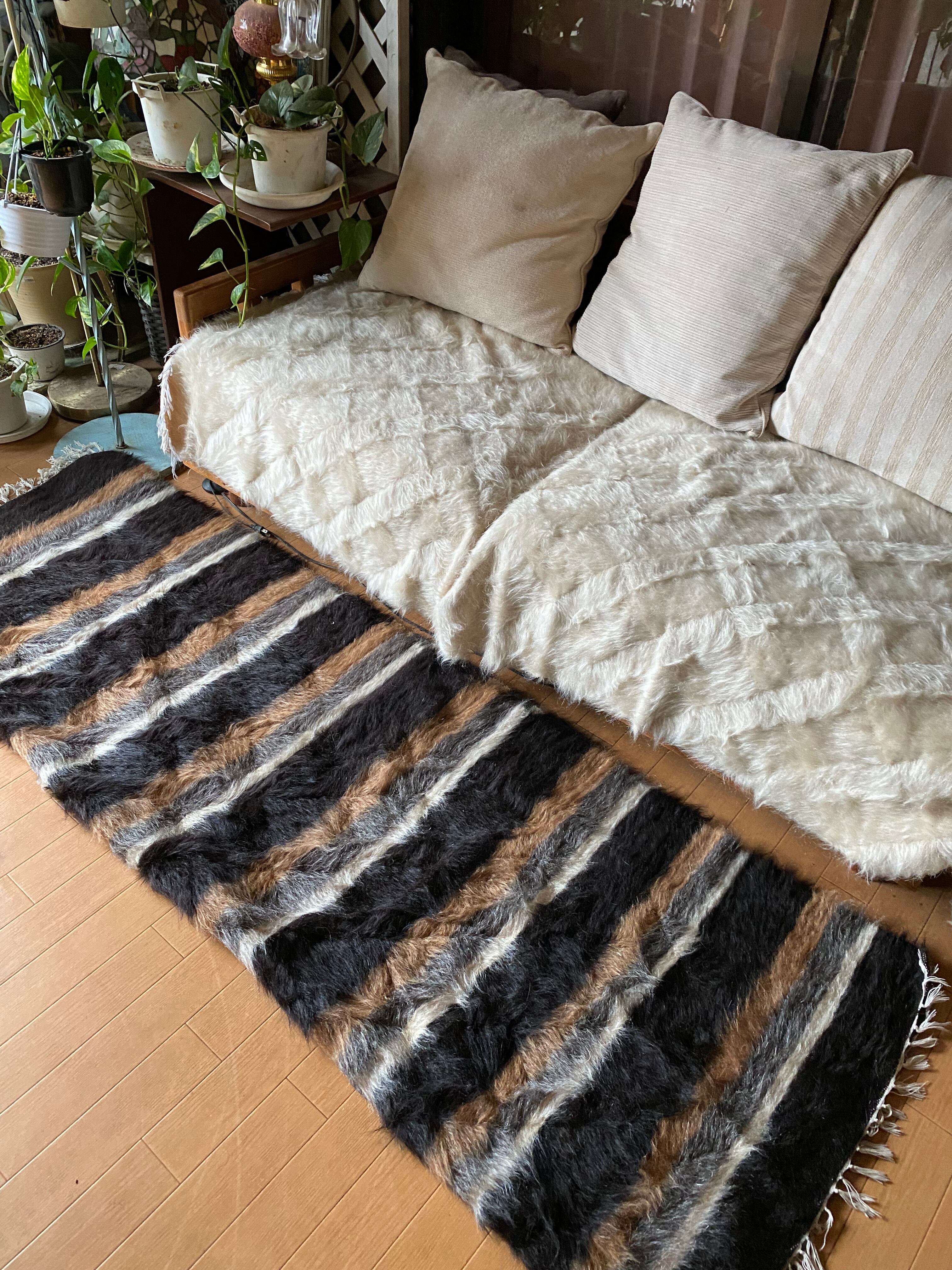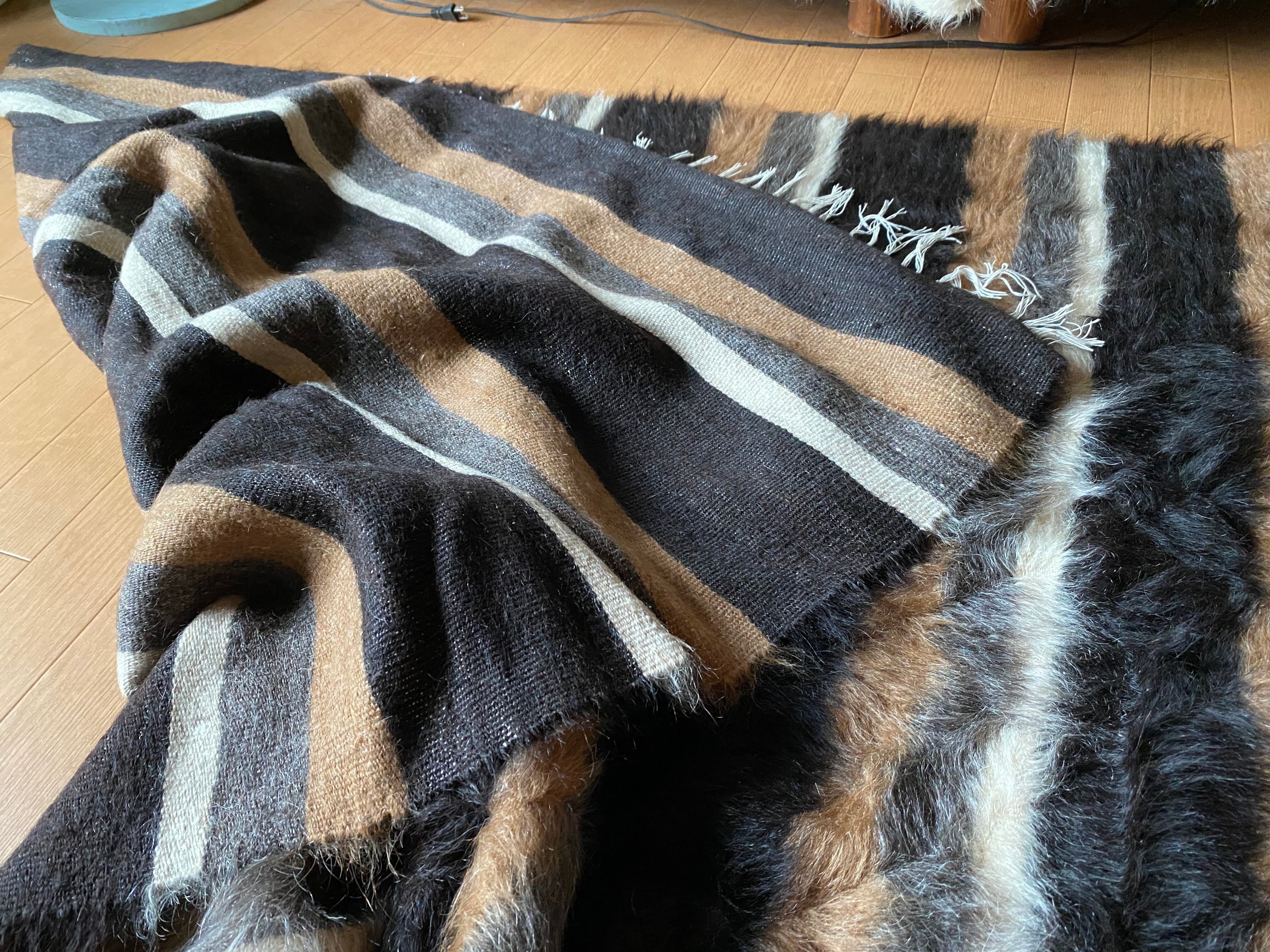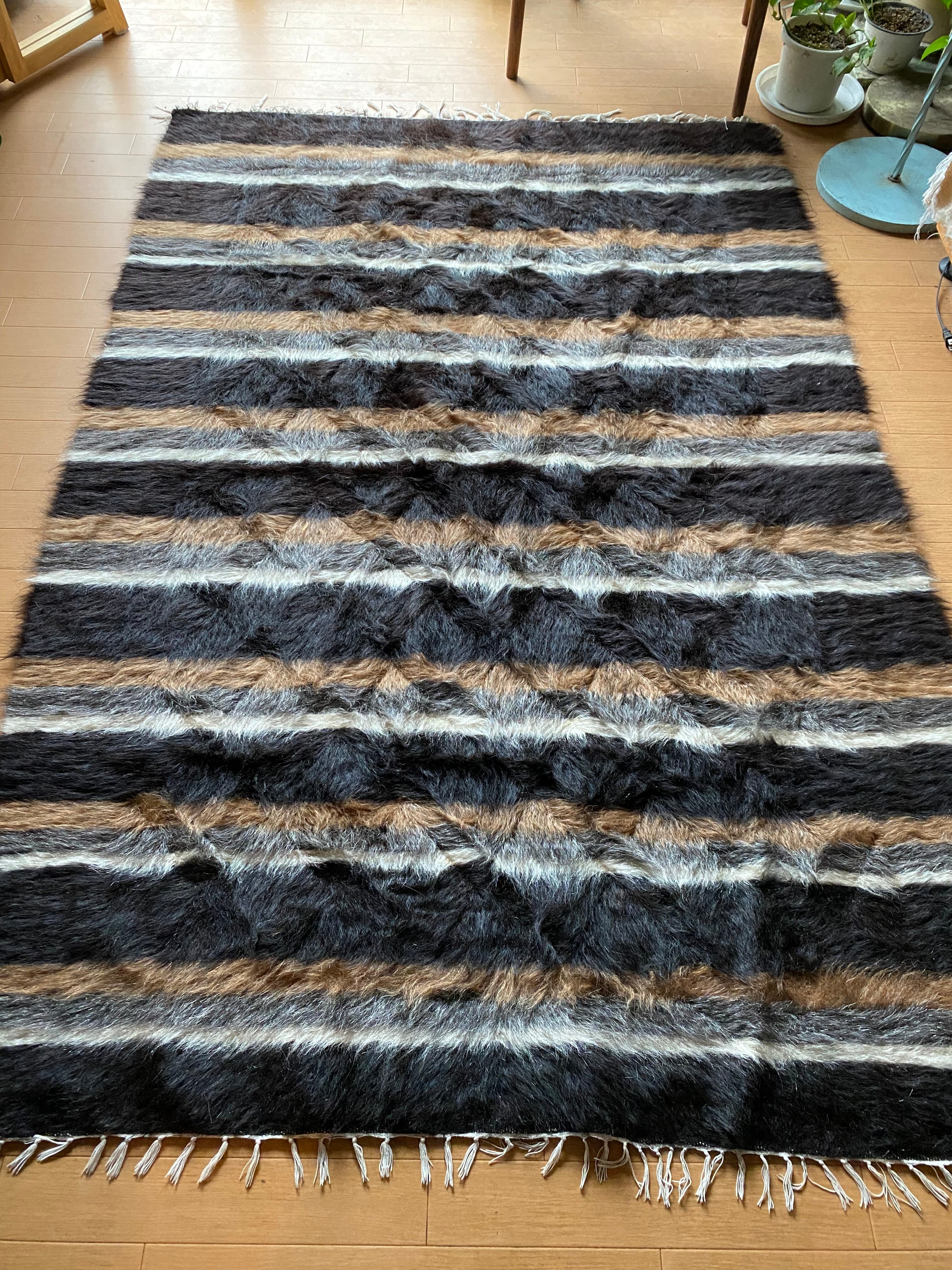 今の新しいものにくらべ、アンティークのバッタ二エと同じくらい密度が濃く、毛の艶がさらに良い山羊の毛で織られています。 未使用ですが、 ご覧いただけますように毛足も眺めでつやつやです。30〜40年ほど前に織られていますが、ほぼ未使用のヴィンテージ未使用品になります。