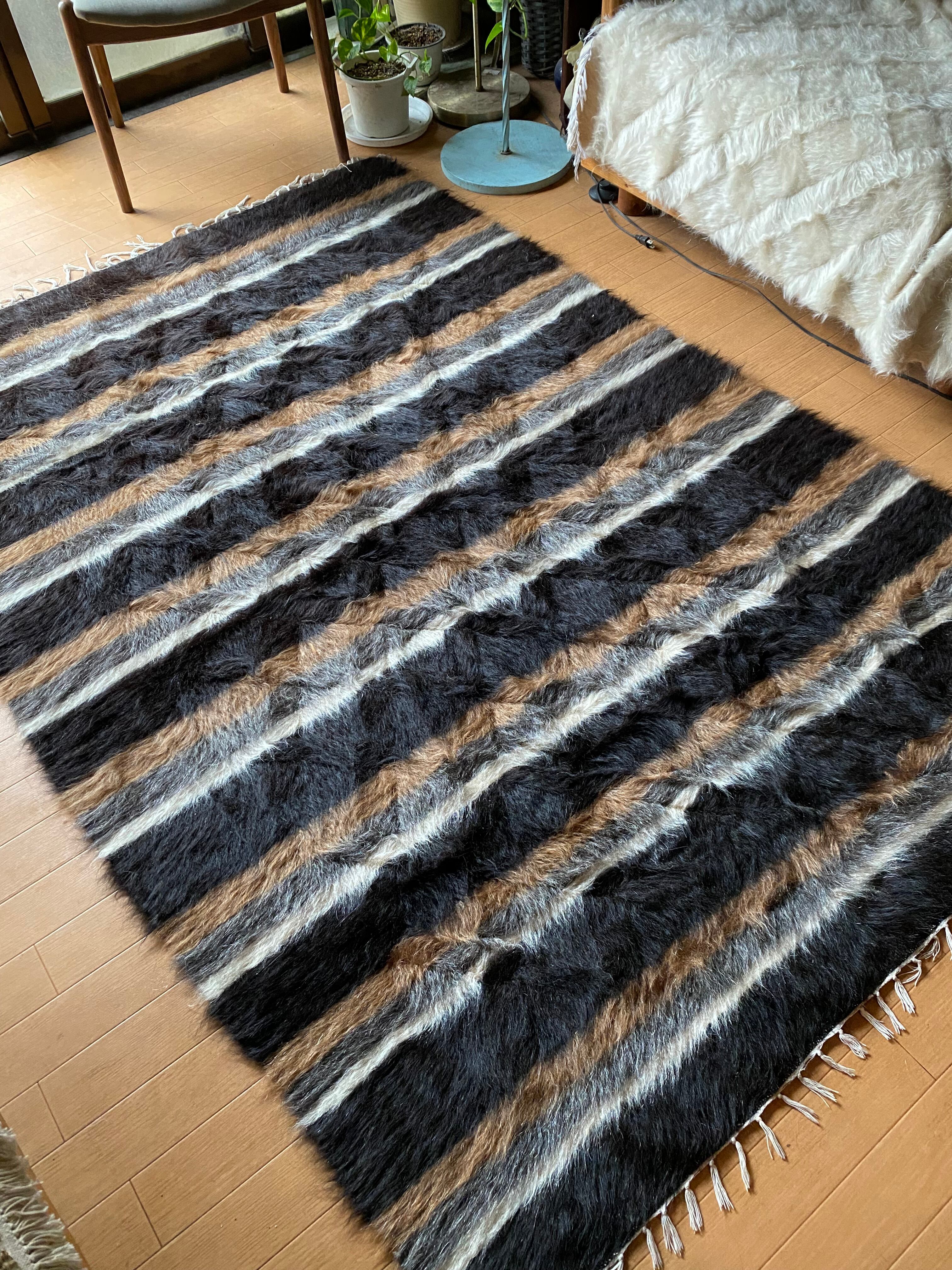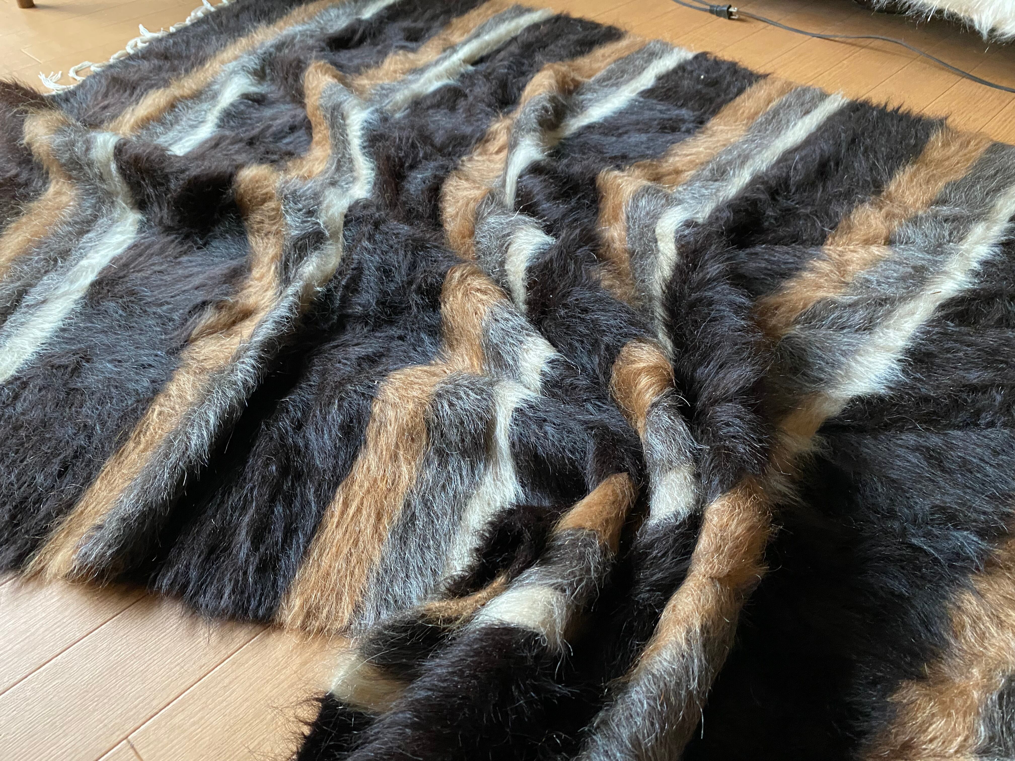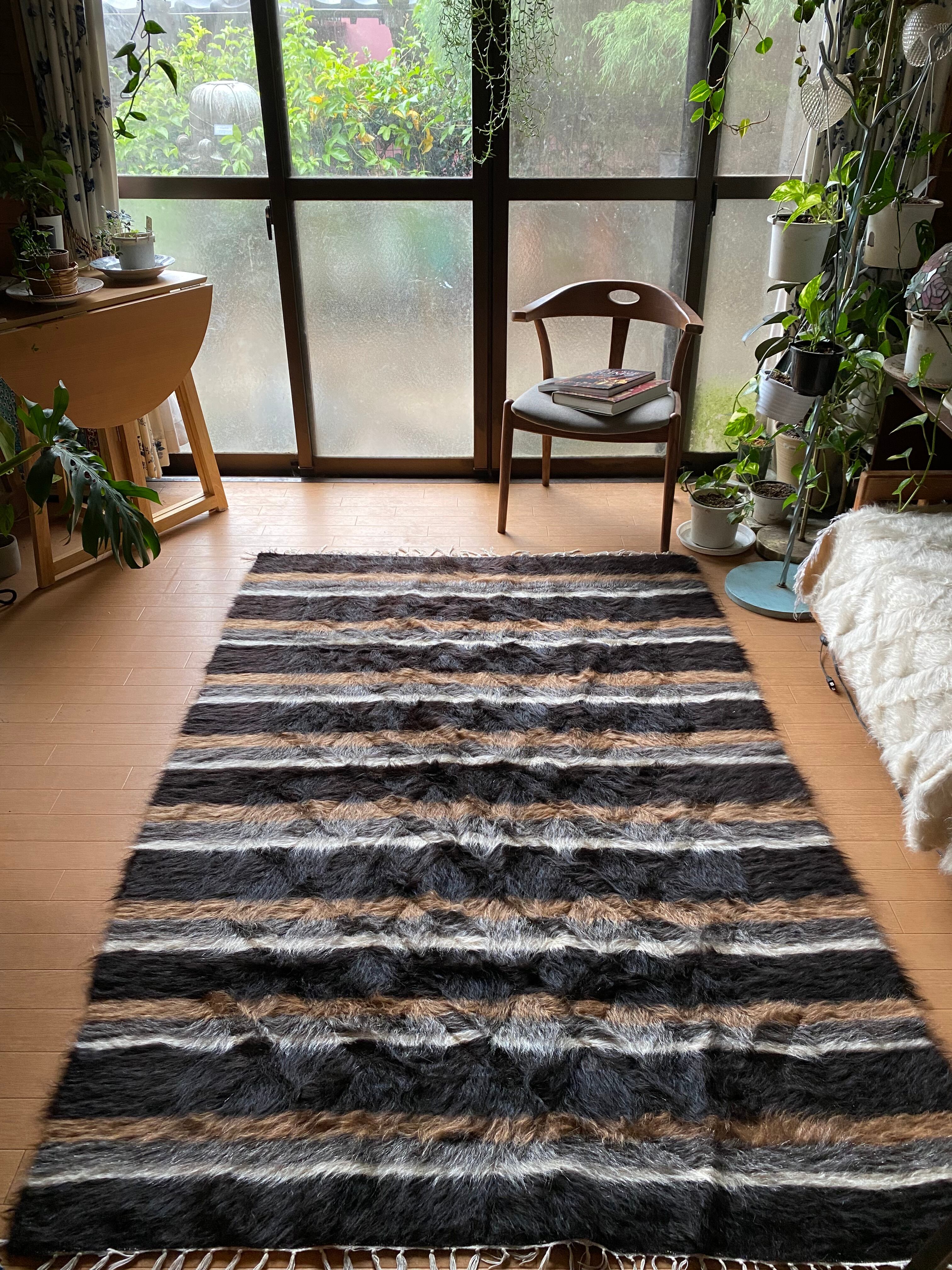 今の新しいものにくらべ、アンティークのバッタ二エと同じくらい密度が濃く、毛の艶がさらに良い山羊の毛で織られています。 未使用ですが、 ご覧いただけますように毛足も眺めでつやつやです。30〜40年ほど前に織られていますが、ほぼ未使用のヴィンテージ未使用品になります。
