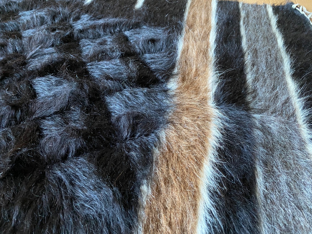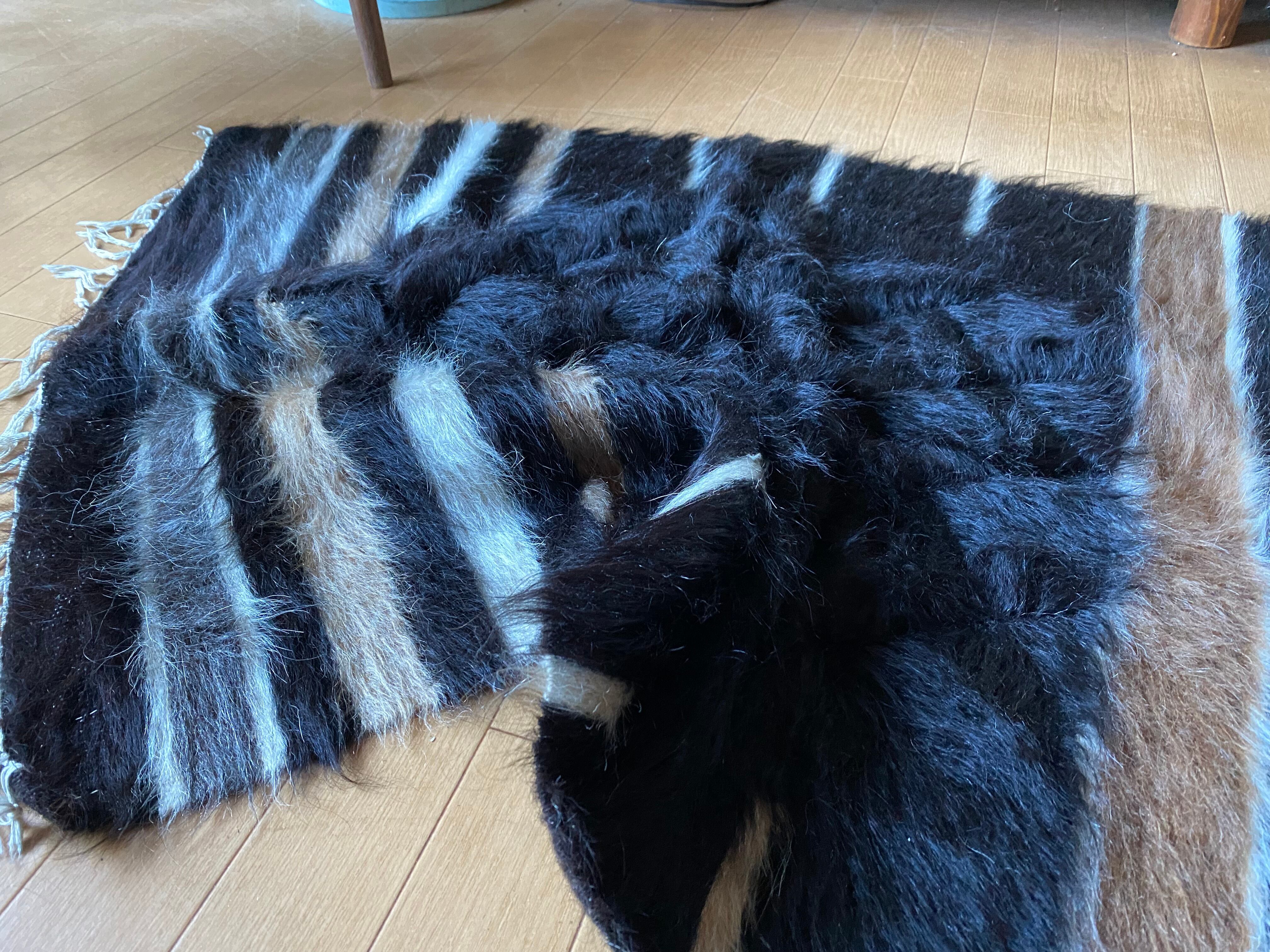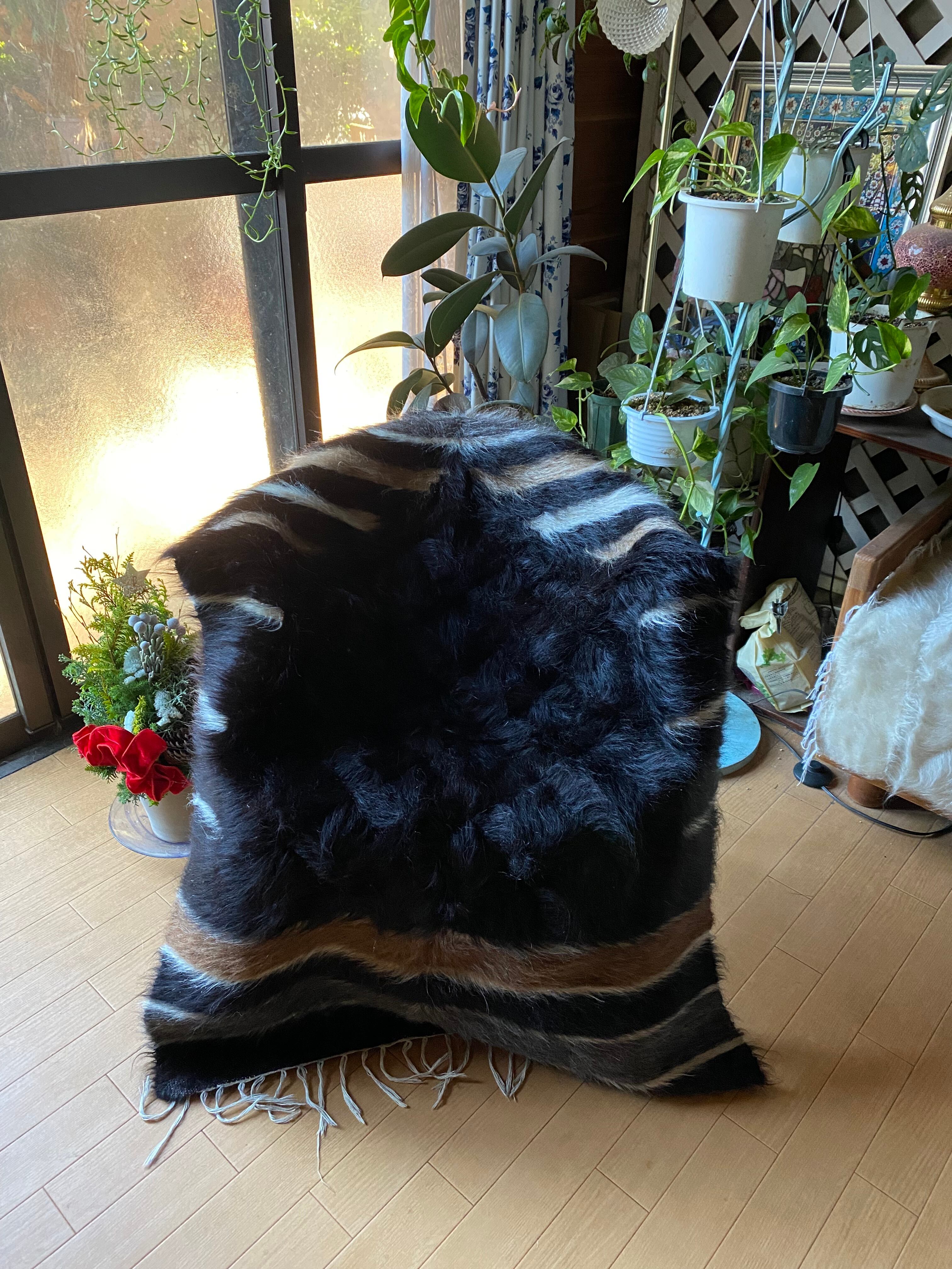 艶々の黒!艶々ヴィンテージのシイルトバッタニイェ!モフモフアンゴラヤギの中でも貴重で贅沢な黒山羊さんのモヘアで織り機で手織の毛布!厚みあり1キロ超え!ラグや膝掛け椅子にも!色々使える便利なシイルトバッタニイェ!当店現地直輸入厳選毛量が大きなものを揃えています