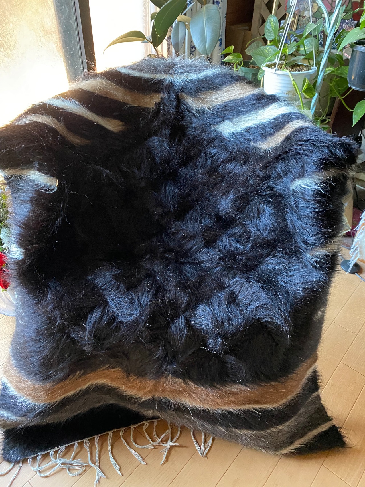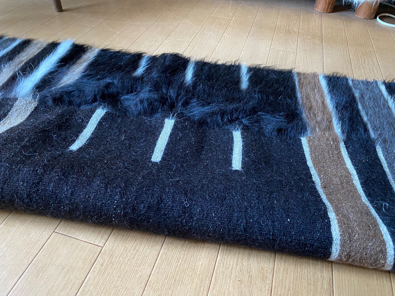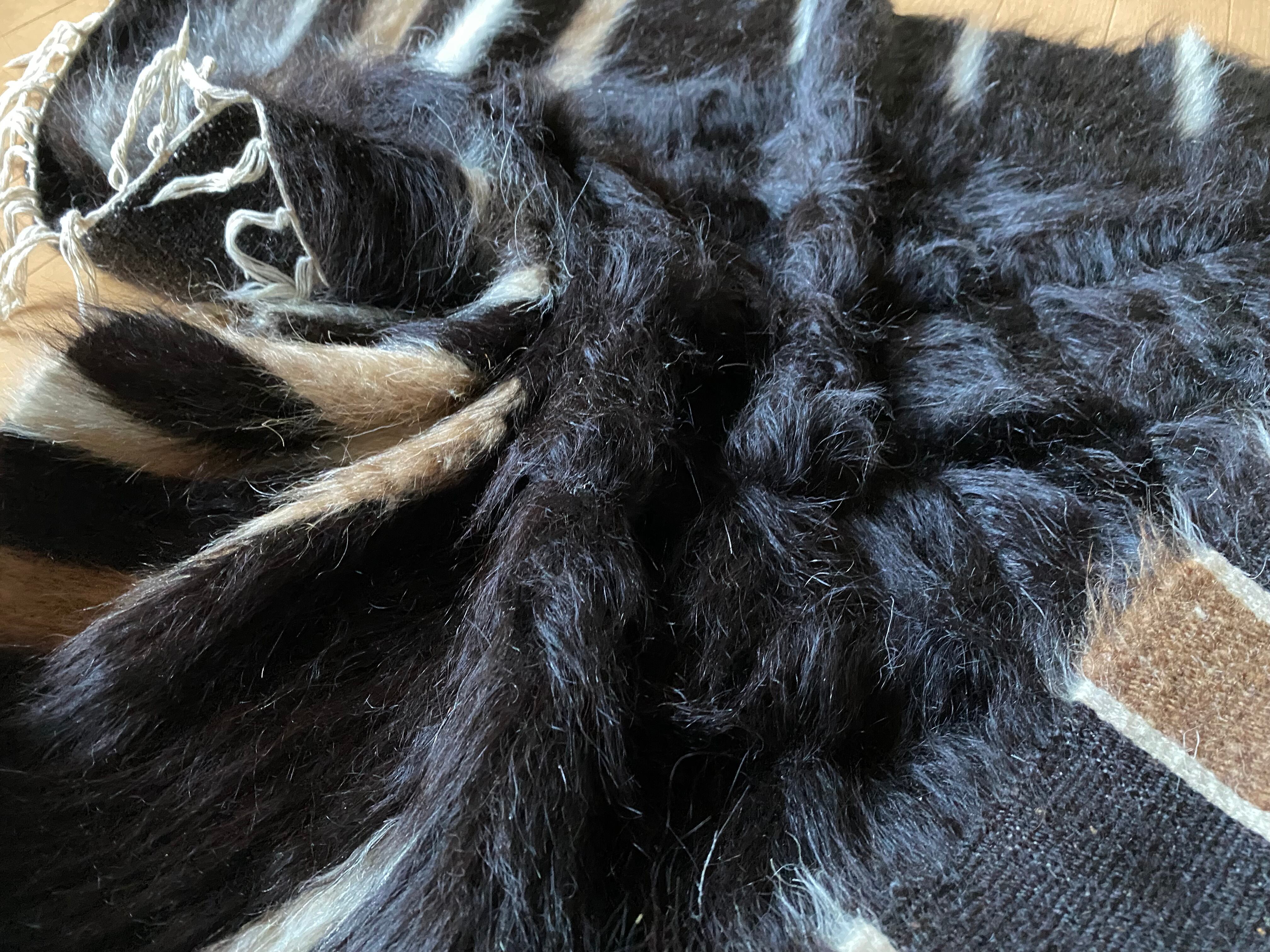 艶々の黒!艶々ヴィンテージのシイルトバッタニイェ!モフモフアンゴラヤギの中でも貴重で贅沢な黒山羊さんのモヘアで織り機で手織の毛布!厚みあり1キロ超え!ラグや膝掛け椅子にも!色々使える便利なシイルトバッタニイェ!当店現地直輸入厳選毛量が大きなものを揃えています