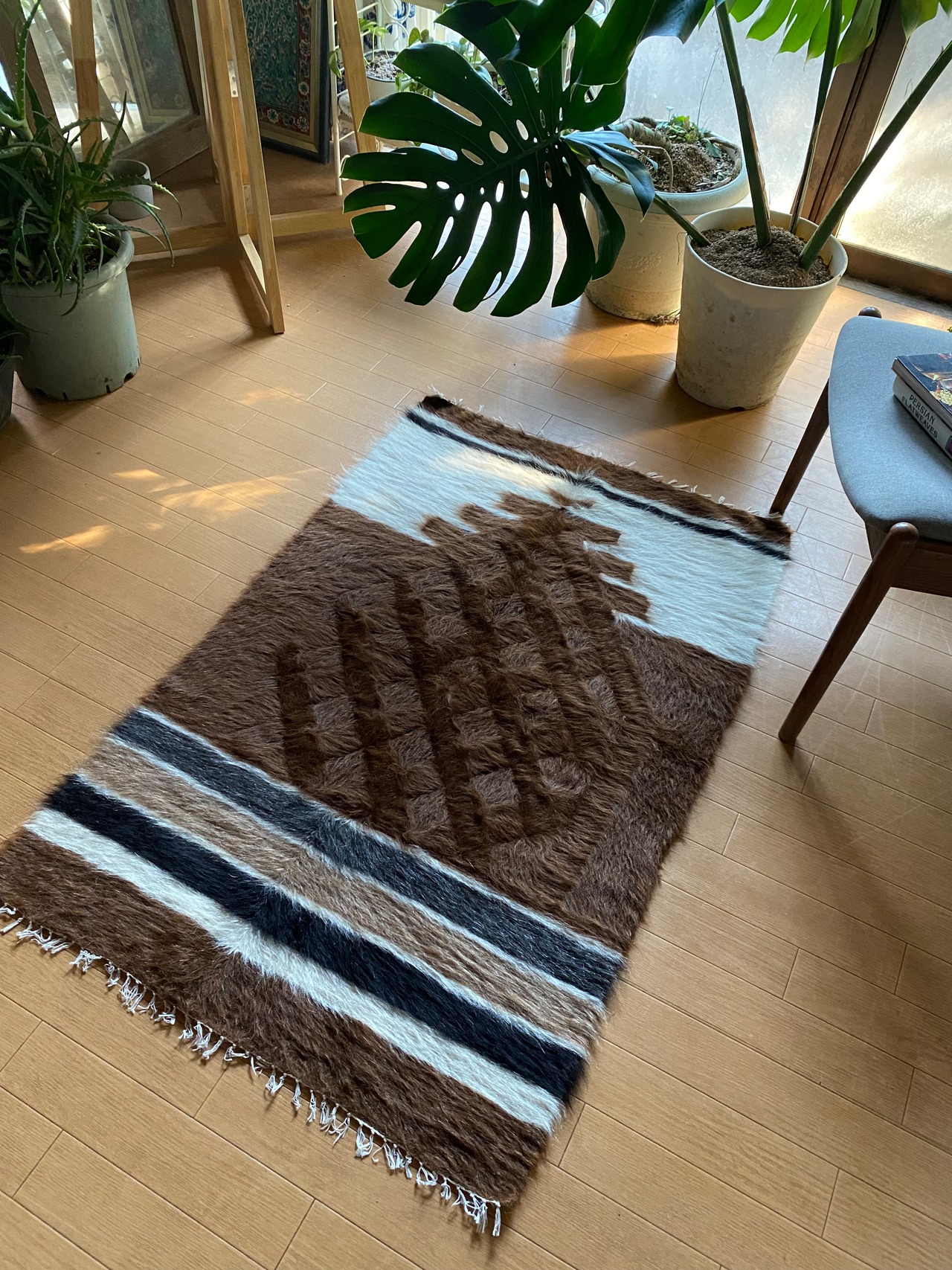 また、毛をけば立てて幾何学模様が入っておりますが、ウールではこのような毛羽立ちの模様はできないそうです。山羊ならではの模様をお楽しみください。 裏面でお使いいただければ、普通のキリムとして も使えます。