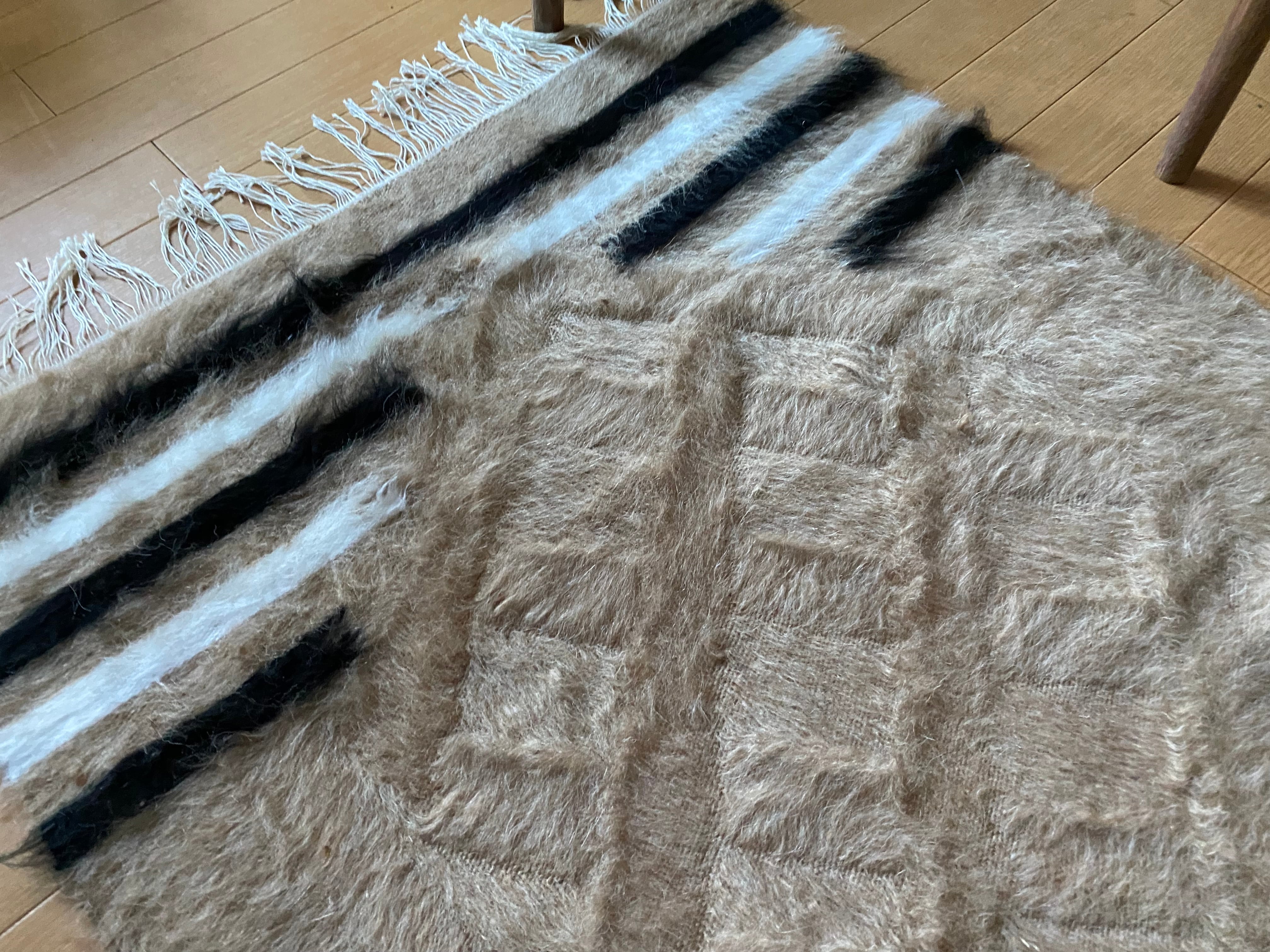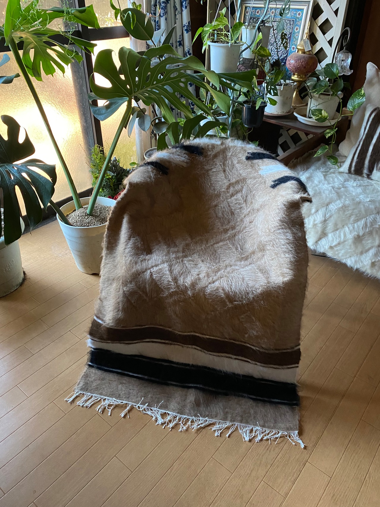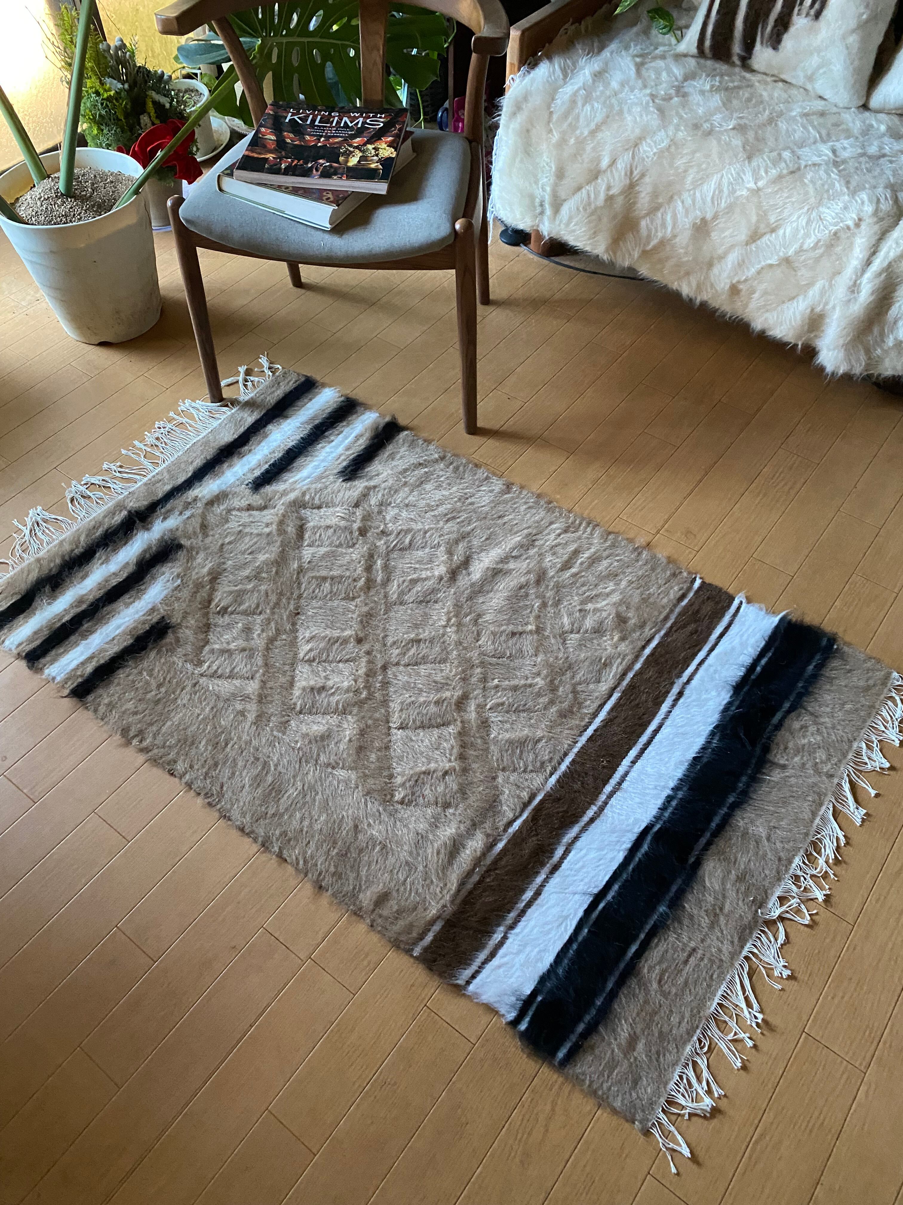山羊ならではの模様をお楽しみください。 片面だけ毛が出ていて裏は毛がとってあるのだとおもいますので、裏面でお使いいただければ、普通のキリムとして も使えます。 冬は毛がある面で、夏は裏面でキリムとしてお使いいただける優れものです。 また毛のある表は毛をけばだたせて、模様も作っていますのでとてもおしゃれ度が高いです。 新品未使用品です。
