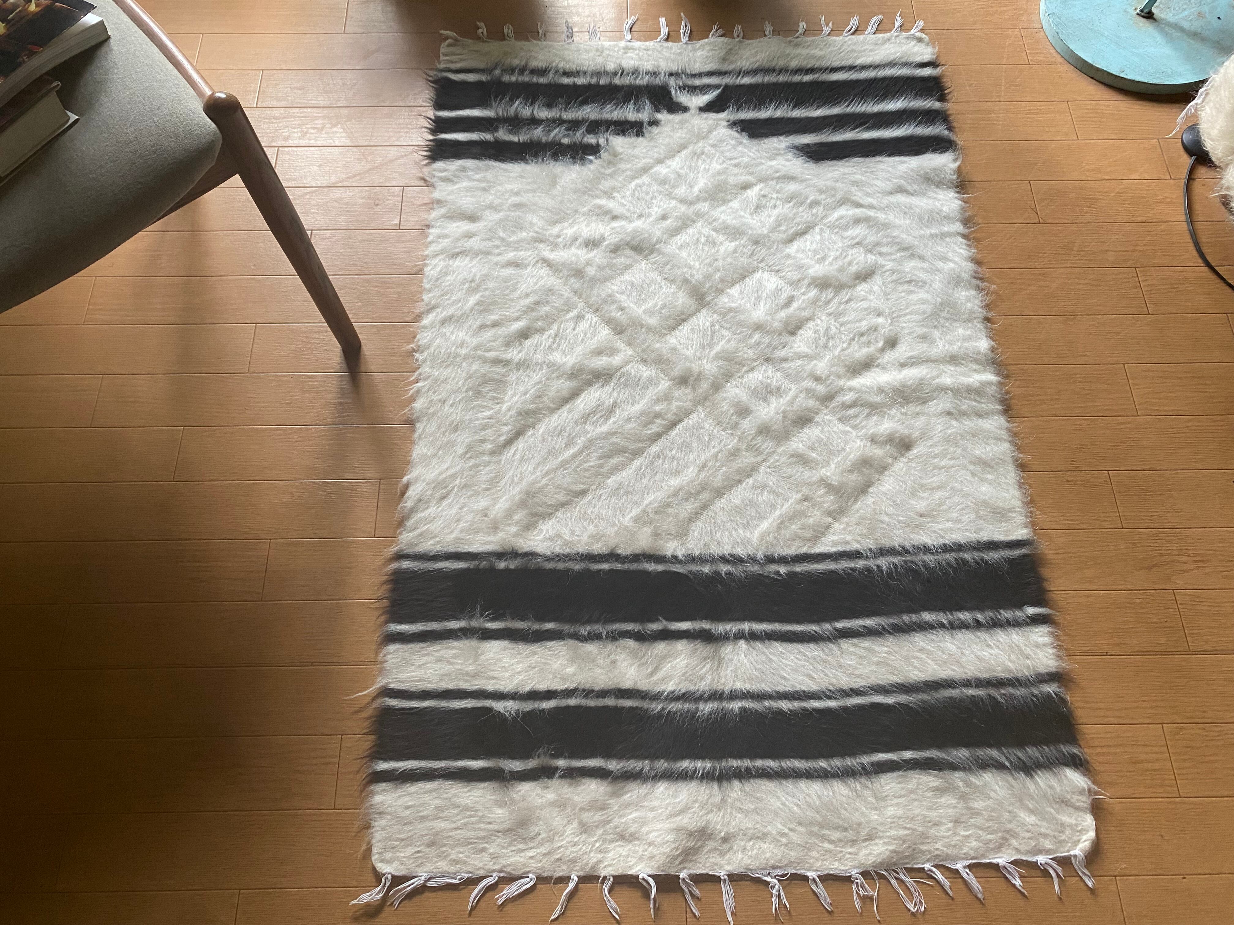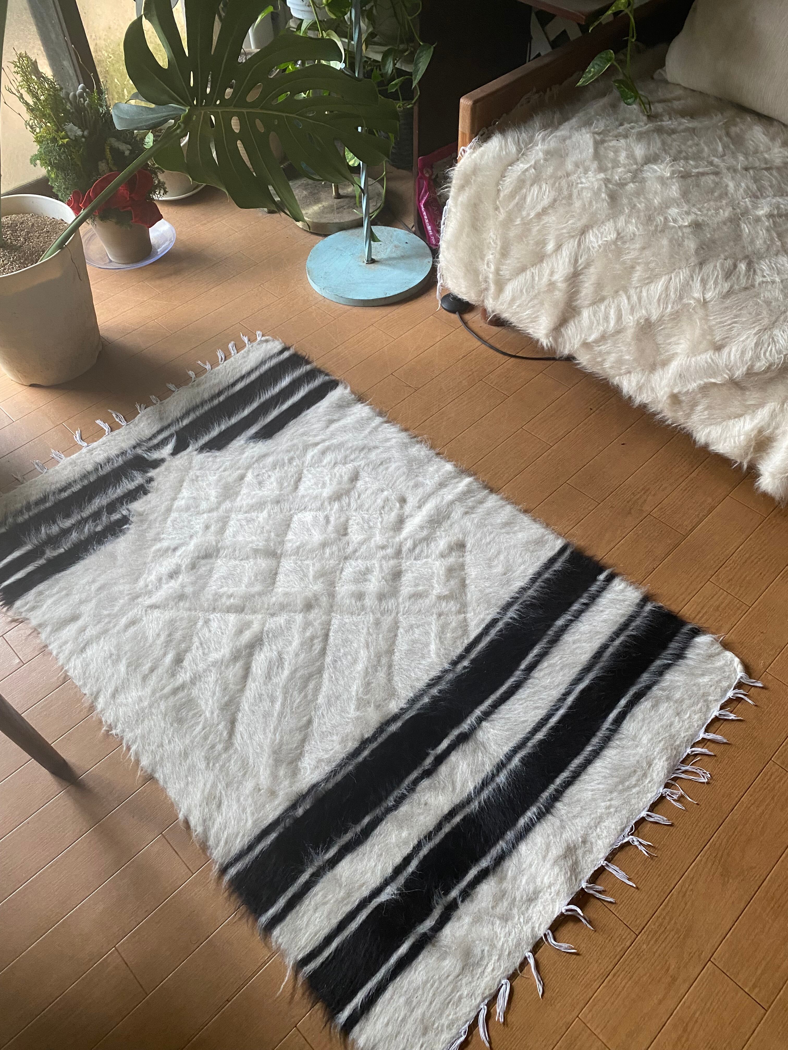 今の新しいものにくらべ、アンティークのバッタ二エと同じくらい密度が濃く、毛の艶がさらに良い山羊の毛で織られています。 未使用ですが、 ご覧いただけますように毛足も長めでつやつやです。30〜40年ほど前に織られていますが、ほぼ未使用のヴィンテージ未使用品になります。