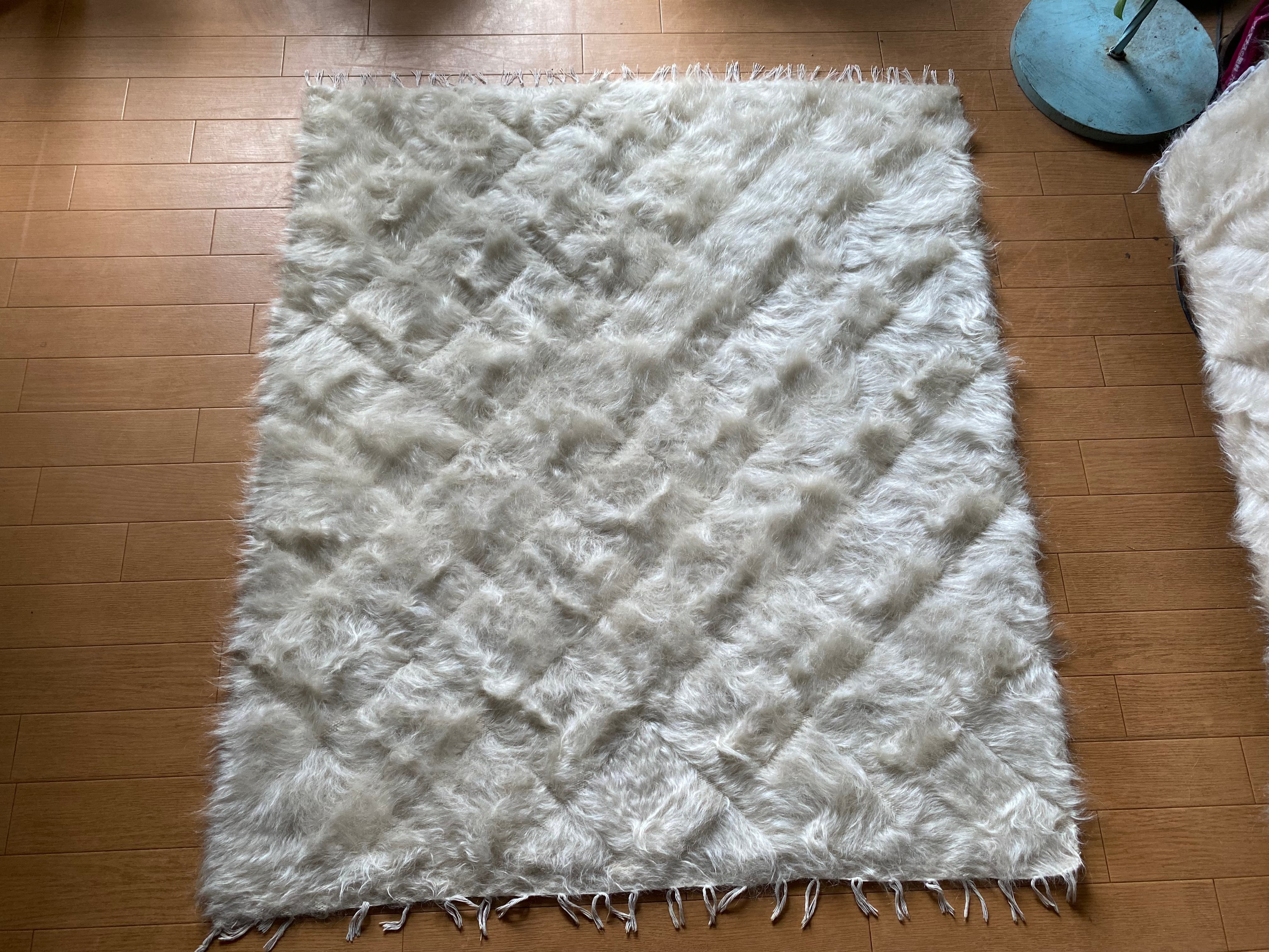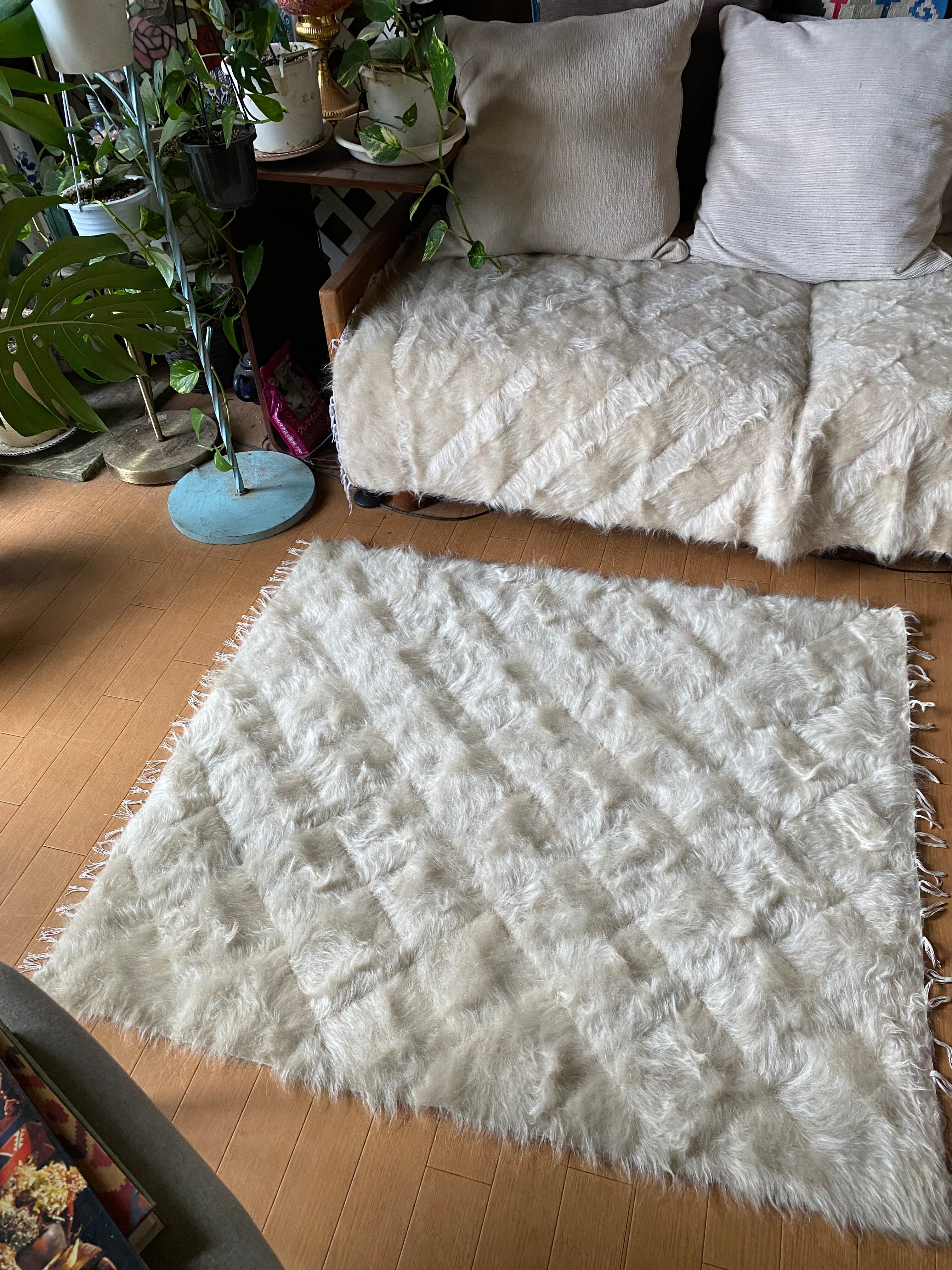今の新しいものにくらべ、アンティークのバッタ二エと同じくらい密度が濃く、毛の艶がさらに良い山羊の毛で織られています。 未使用ですが、 ご覧いただけますように毛足も長めでつやつやです。30〜40年ほど前に織られていますが、ほぼ未使用のヴィンテージ未使用品になります。
