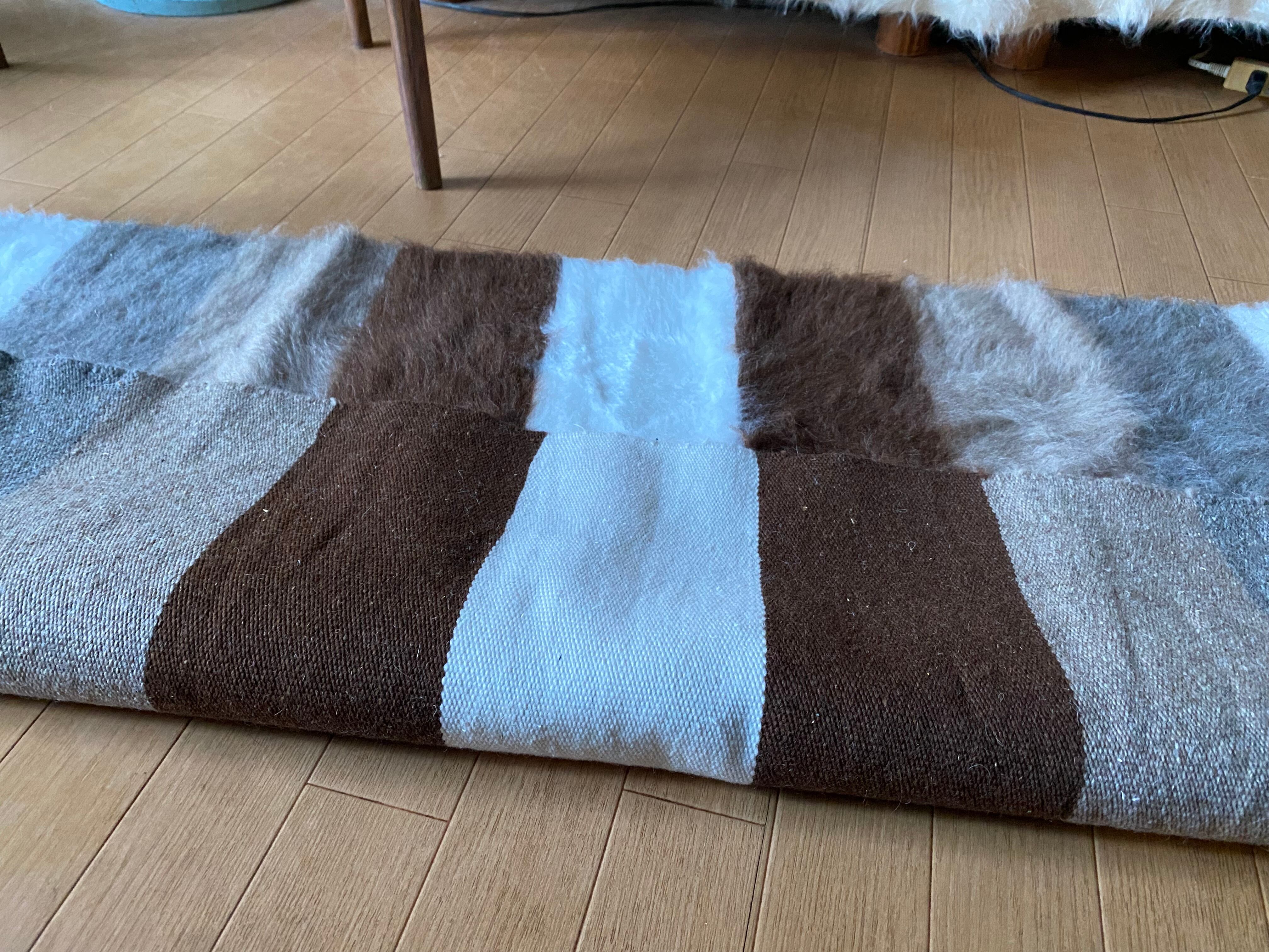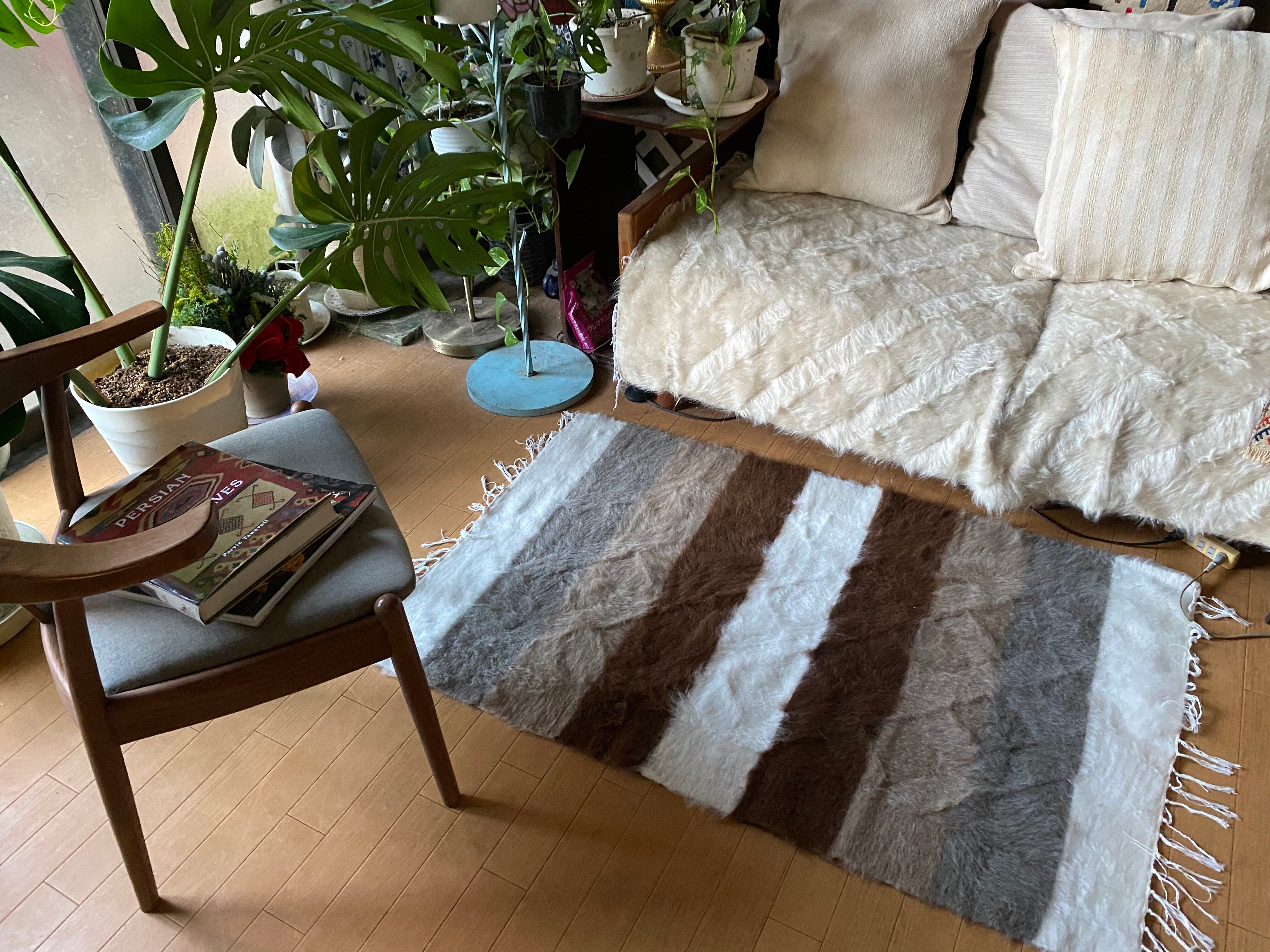山羊ならではの模様をお楽しみください。 片面だけ毛が出ていて裏は毛がとってあるのだとおもいますので、裏面でお使いいただければ、普通のキリムとして も使えます。 冬は毛がある面で、夏は裏面でキリムとしてお使いいただける優れものです。 また毛のある表は毛をけばだたせて、模様も作っていますのでとてもおしゃれ度が高いです。 新品未使用品です。