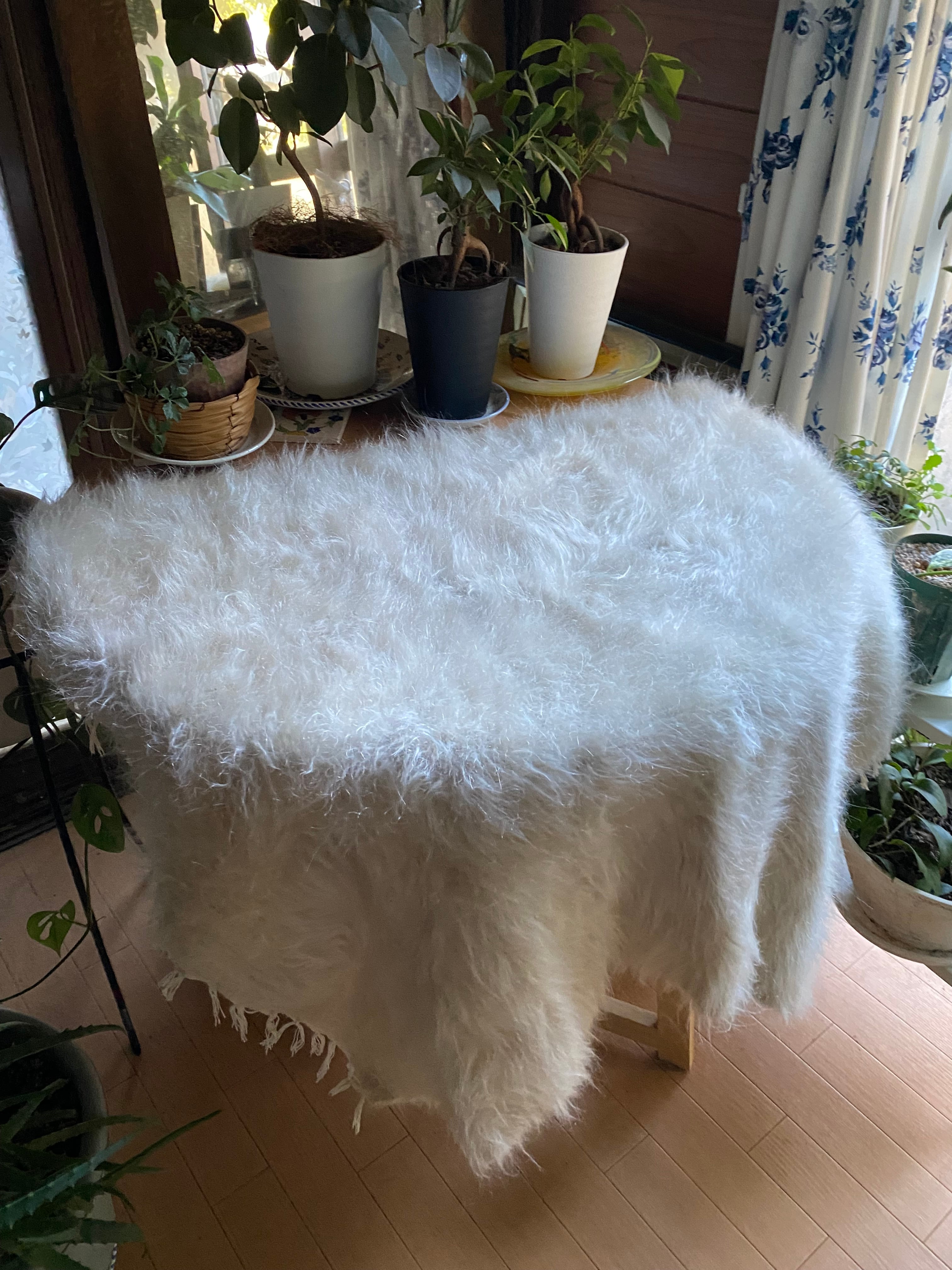 アンゴラヤギのモヘアで織られたほぼ新品未使用ですが、40年ほど織られたもので今織られたものよりさらに密でモヘアの質が大変良いです。新古品になります。
