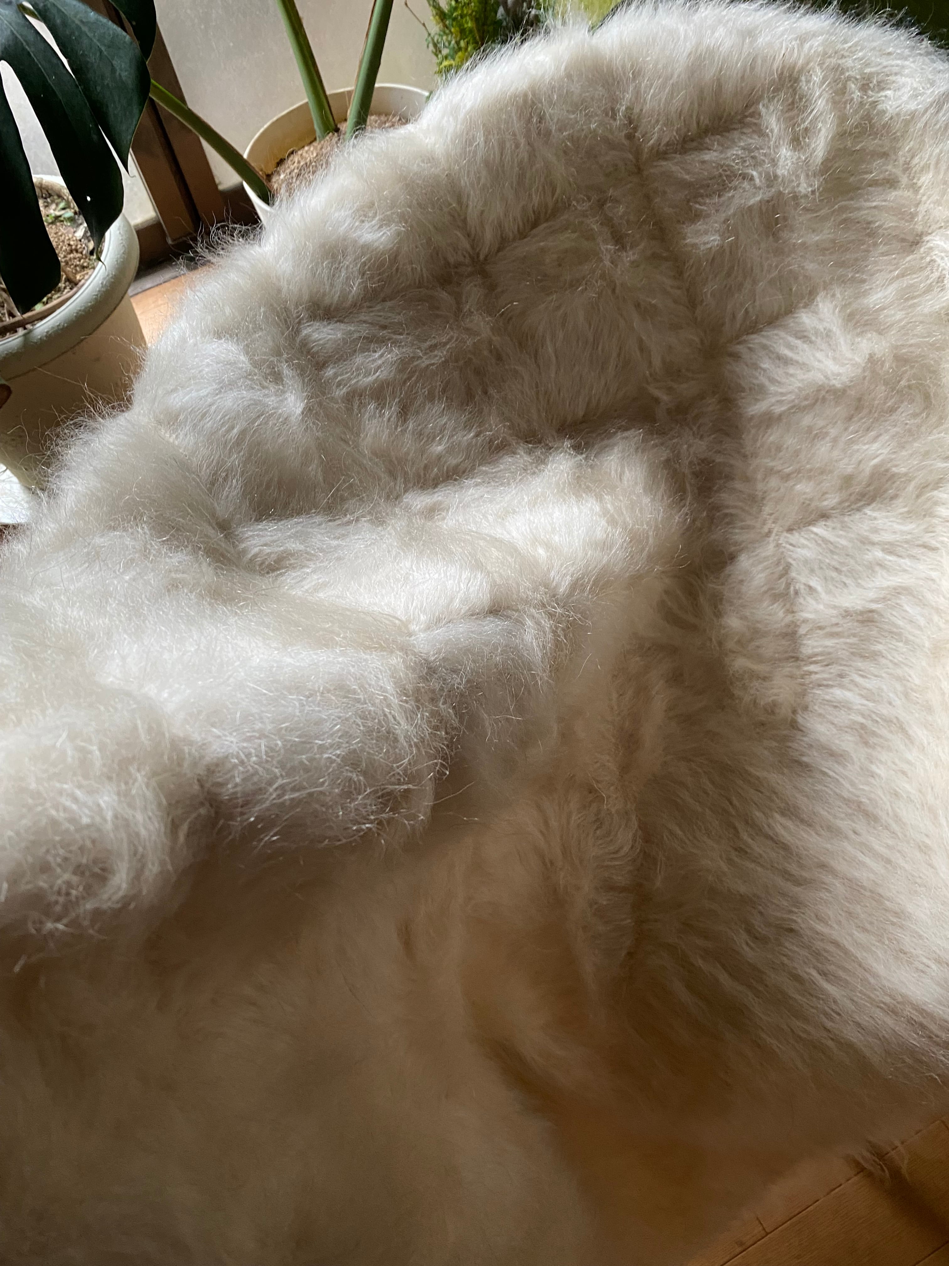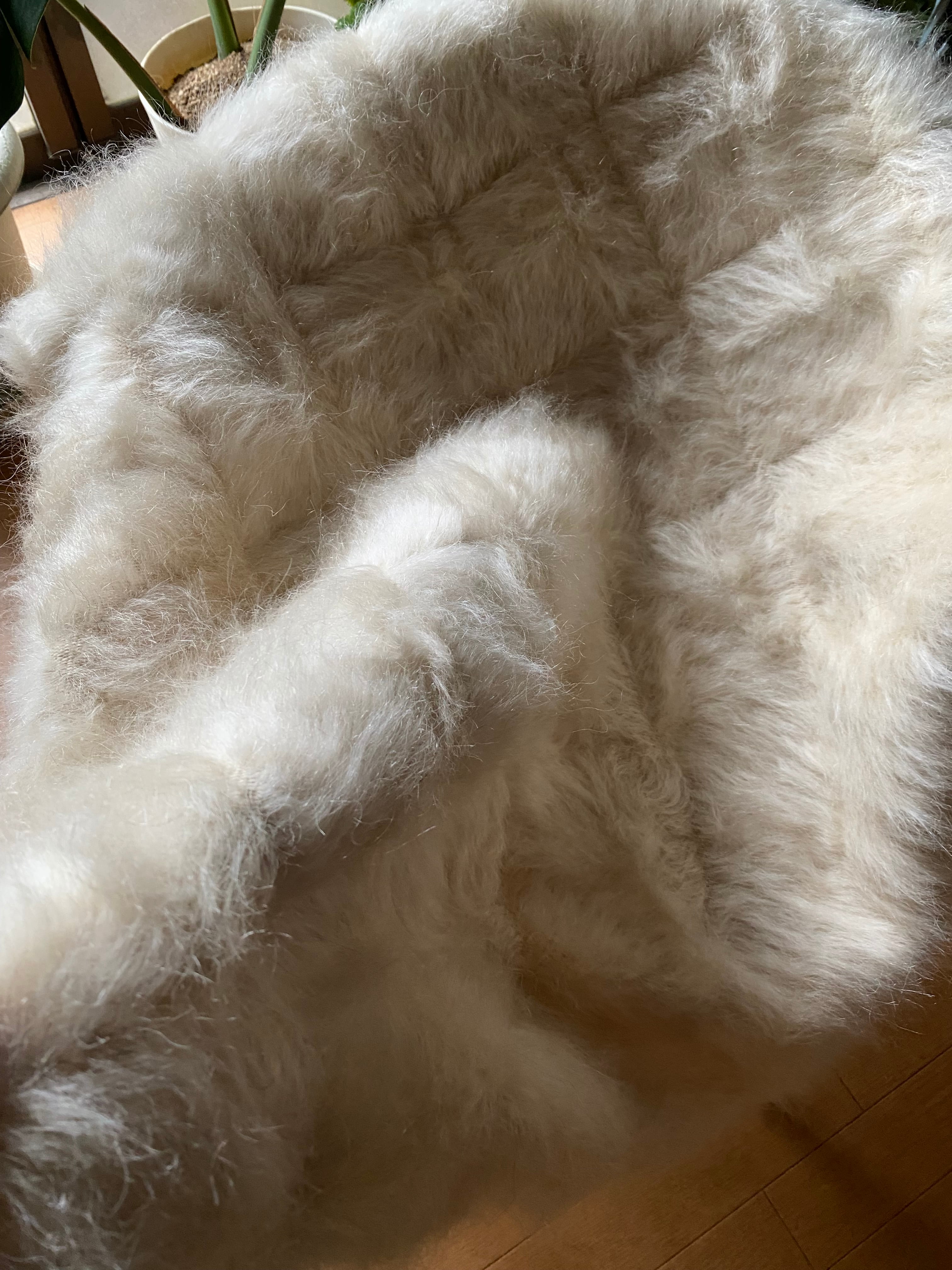 こちら通常の新しいシイルトバッタ二エにくらべ、毛量が多めの素晴らしいアンゴラ山羊100%のシイルトです。