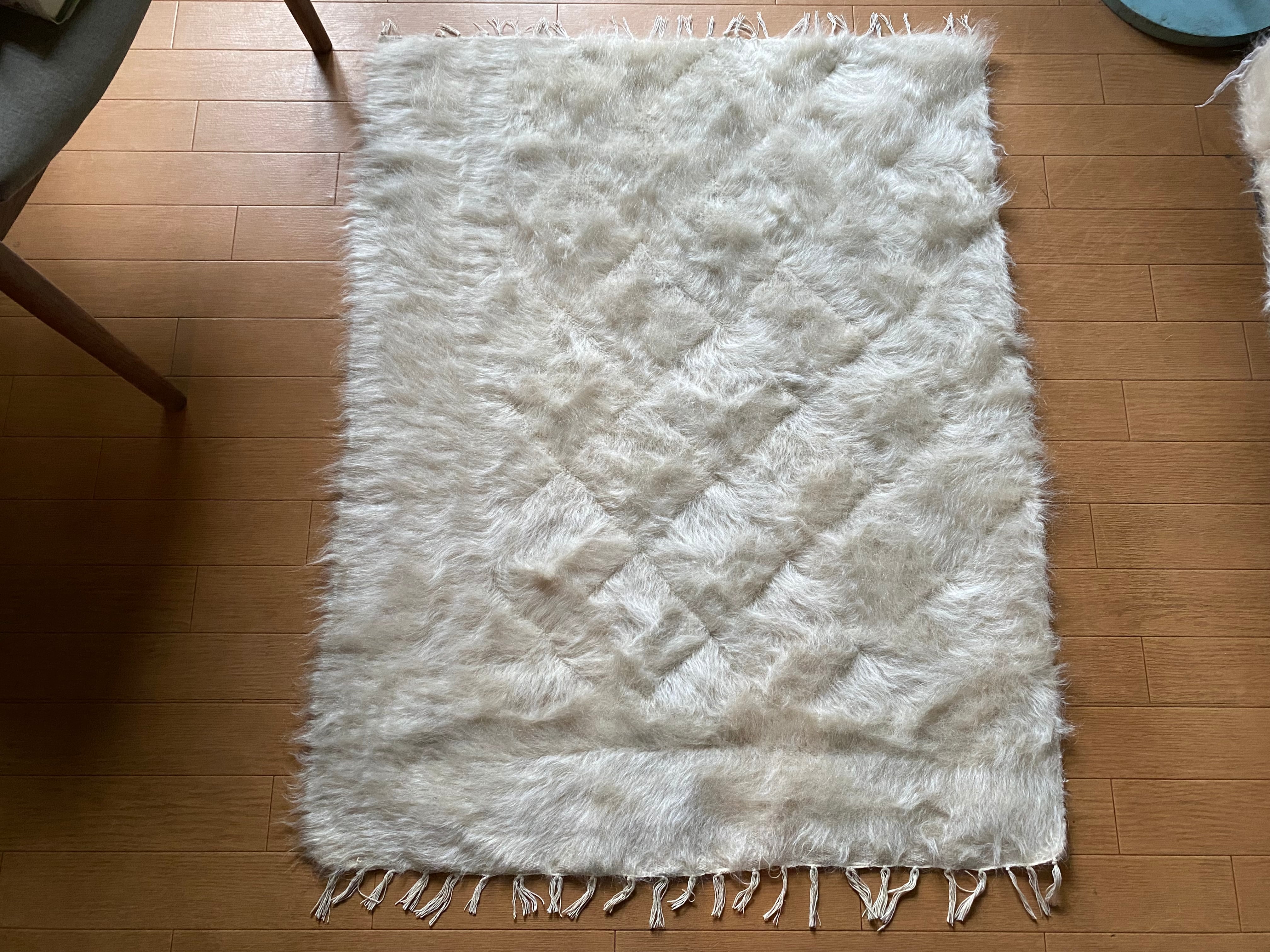今の新しいものにくらべ、アンティークのバッタ二エと同じくらい密度が濃く、毛の艶がさらに良い山羊の毛で織られています。 未使用ですが、 ご覧いただけますように毛足も長めでつやつやです。30〜40年ほど前に織られていますが、ほぼ未使用のヴィンテージ未使用品になります。