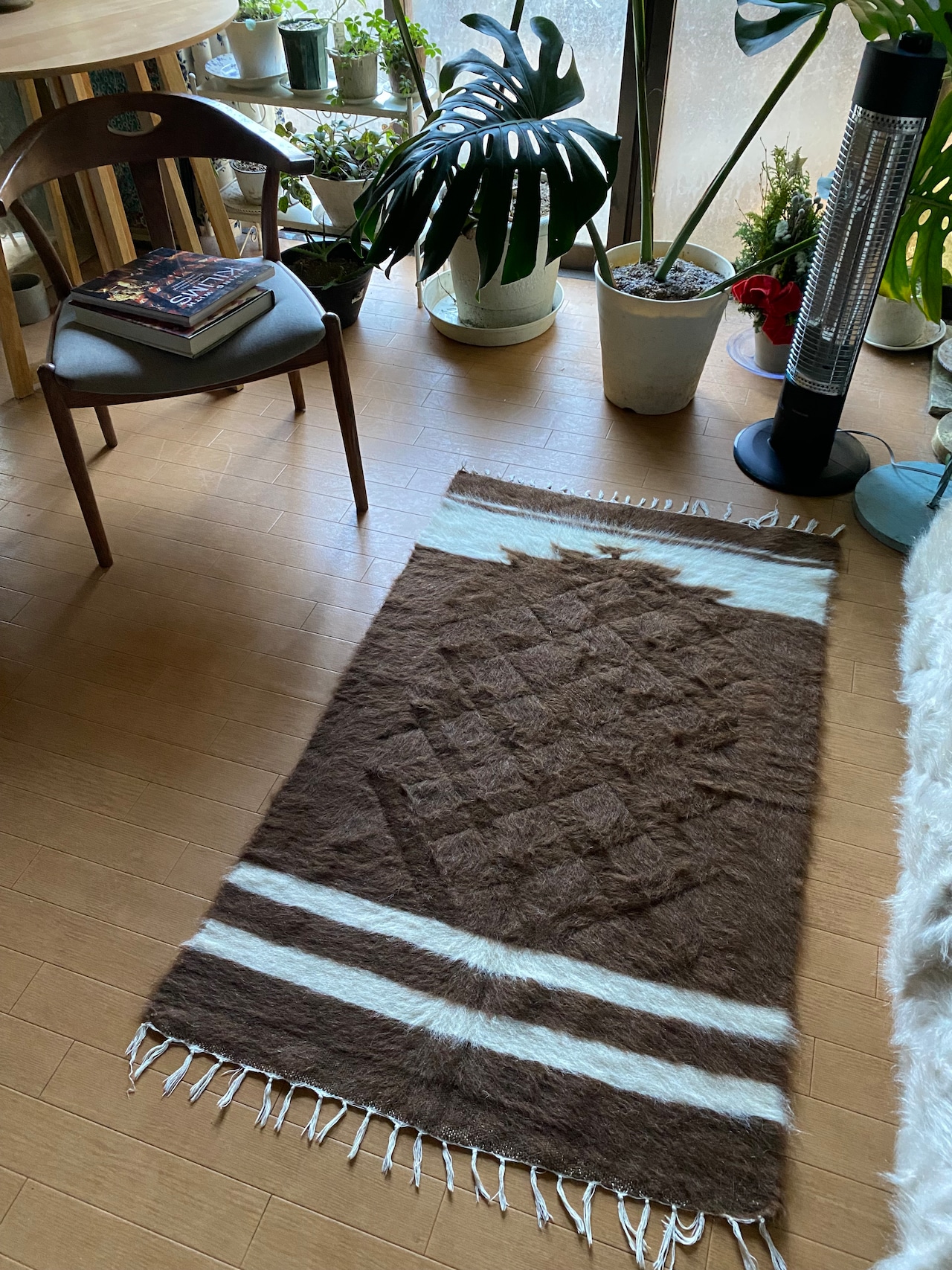 また、毛をけば立てて幾何学模様が入っておりますが、ウールではこのような毛羽立ちの模様はできないそうです。山羊ならではの模様をお楽しみください。 裏面でお使いいただければ、普通のキリムとして も使えます。