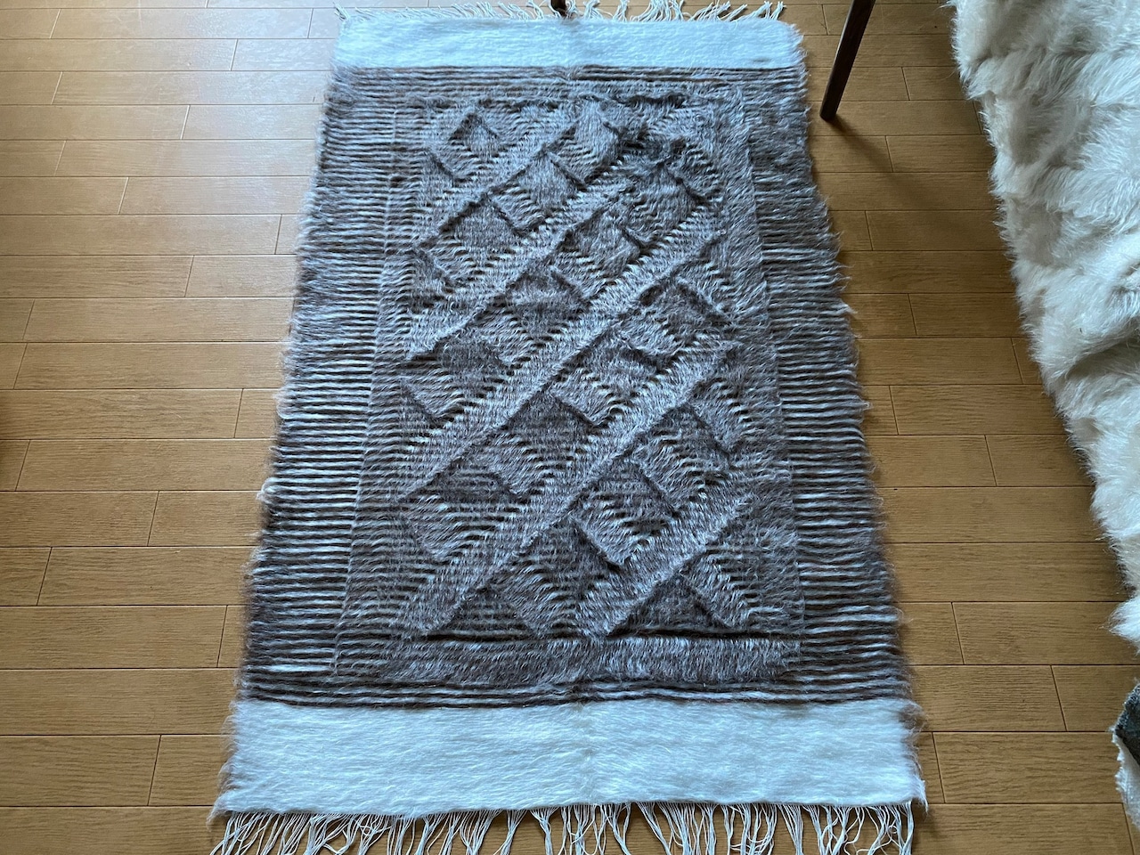 山羊ならではの模様をお楽しみください。 片面だけ毛が出ていて裏は毛がとってあるのだとおもいますので、裏面でお使いいただければ、普通のキリムとして も使えます。 冬は毛がある面で、夏は裏面でキリムとしてお使いいただける優れものです。 また毛のある表は毛をけばだたせて、模様も作っていますのでとてもおしゃれ度が高いです。 新品未使用品です。