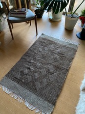 山羊ならではの模様をお楽しみください。 片面だけ毛が出ていて裏は毛がとってあるのだとおもいますので、裏面でお使いいただければ、普通のキリムとして も使えます。 冬は毛がある面で、夏は裏面でキリムとしてお使いいただける優れものです。 また毛のある表は毛をけばだたせて、模様も作っていますのでとてもおしゃれ度が高いです。 新品未使用品です。