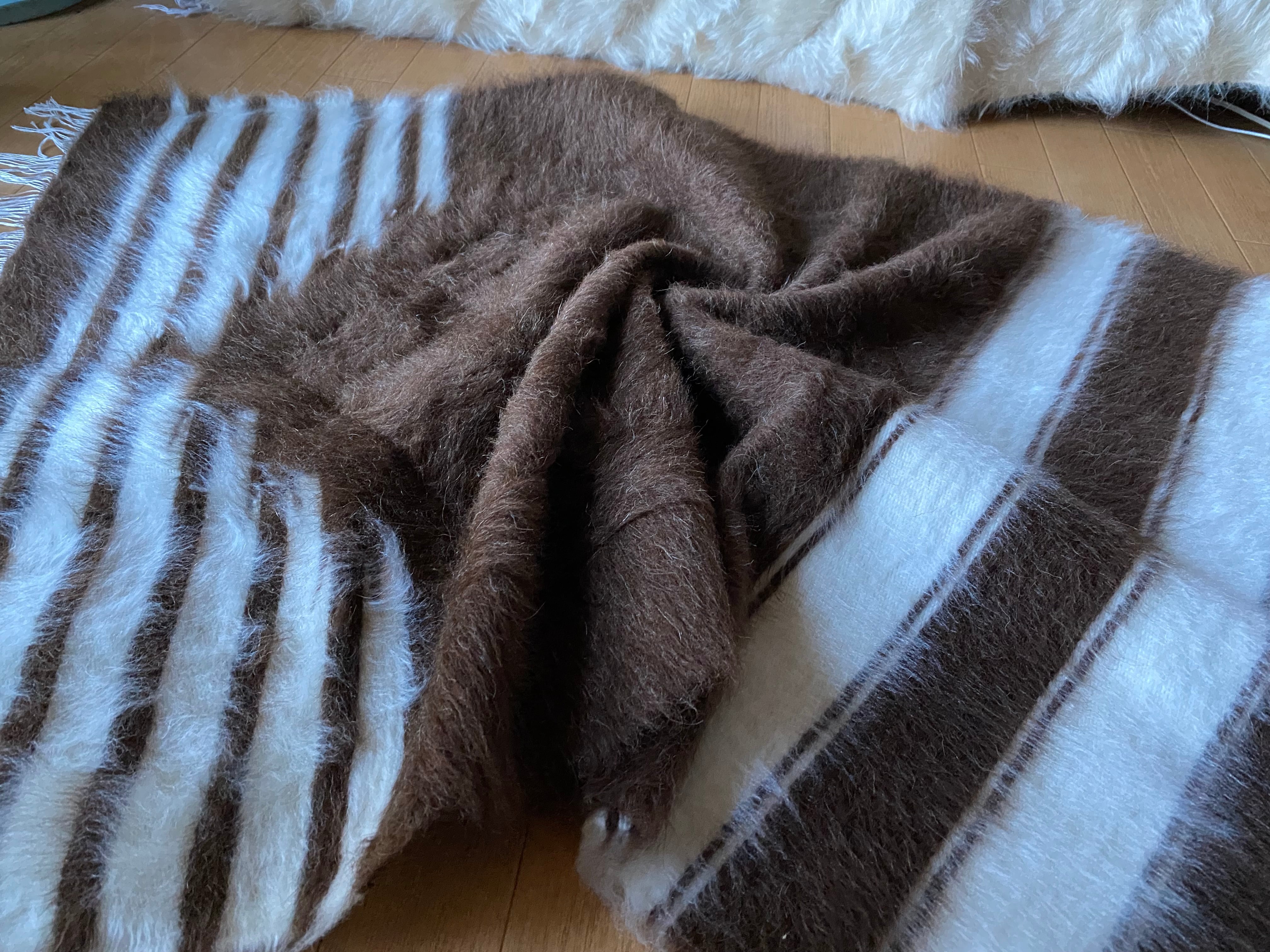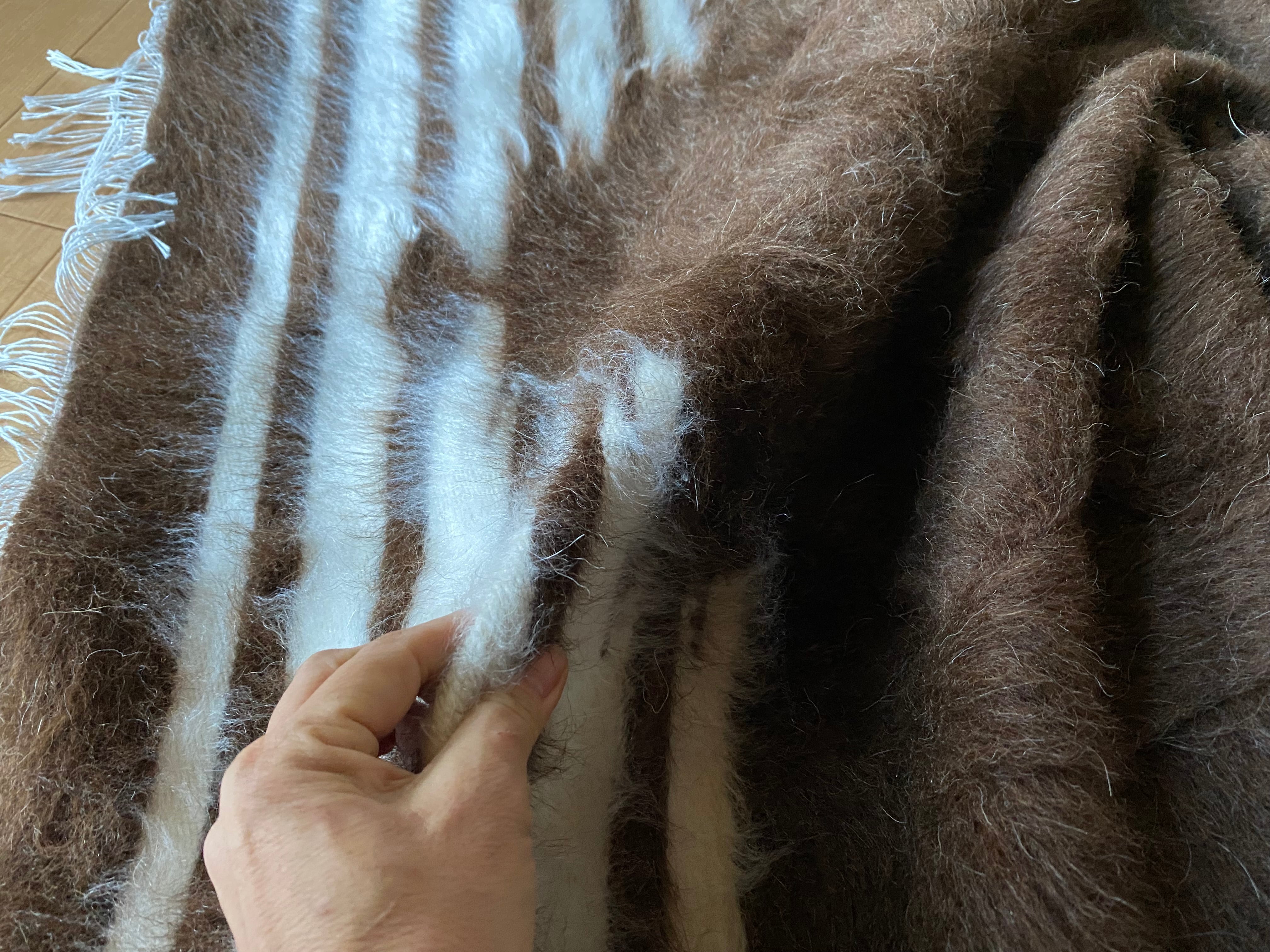 自然のヤギの毛で織られていますので、独特のくるくるとした感じも可愛く、とてもナチュ ラルな感じです。アンゴラ山羊は18世紀の中ごろまでオスマントルコが飼育を独占していたらしいです。 その後改良され、良質のモヘアとして世界的に発展していったそうです。モヘアと言えば、カシミヤと並ぶ素材ですね。山羊の毛ですので、羊より高級で暖かです。