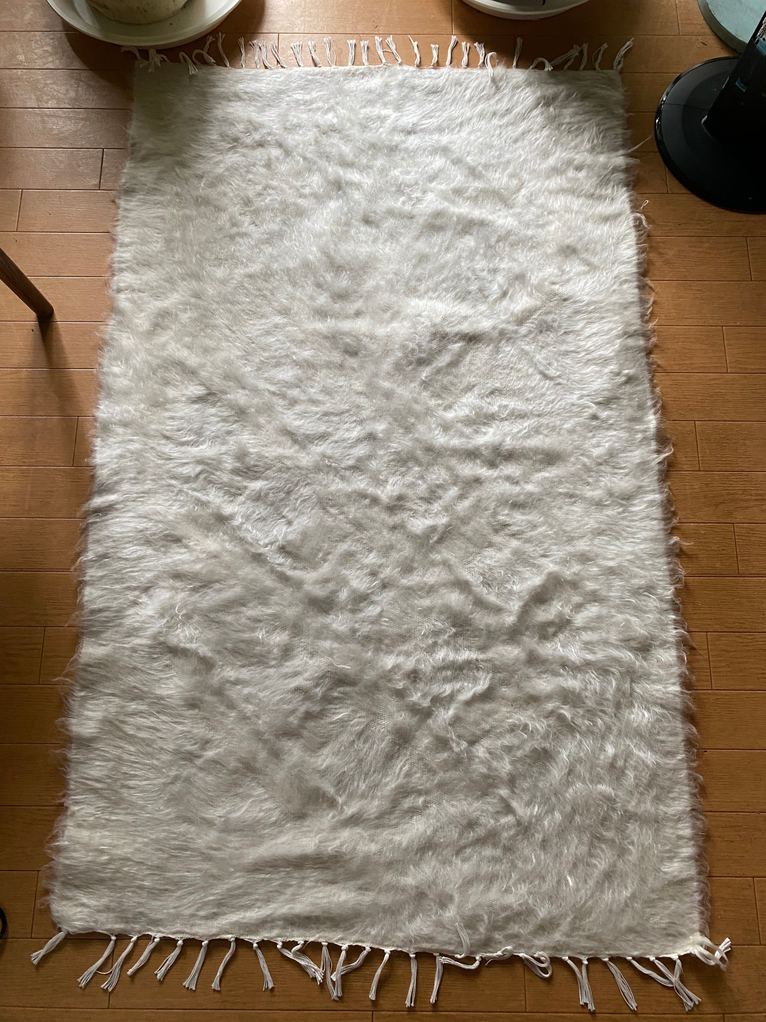 山羊ならではの模様をお楽しみください。 片面だけ毛が出ていて裏は毛がとってあるのだとおもいますので、裏面でお使いいただければ、普通のキリムとして も使えます。 冬は毛がある面で、夏は裏面でキリムとしてお使いいただける優れものです。 また毛のある表は毛をけばだたせて、模様も作っていますのでとてもおしゃれ度が高いです。 新品未使用品です。