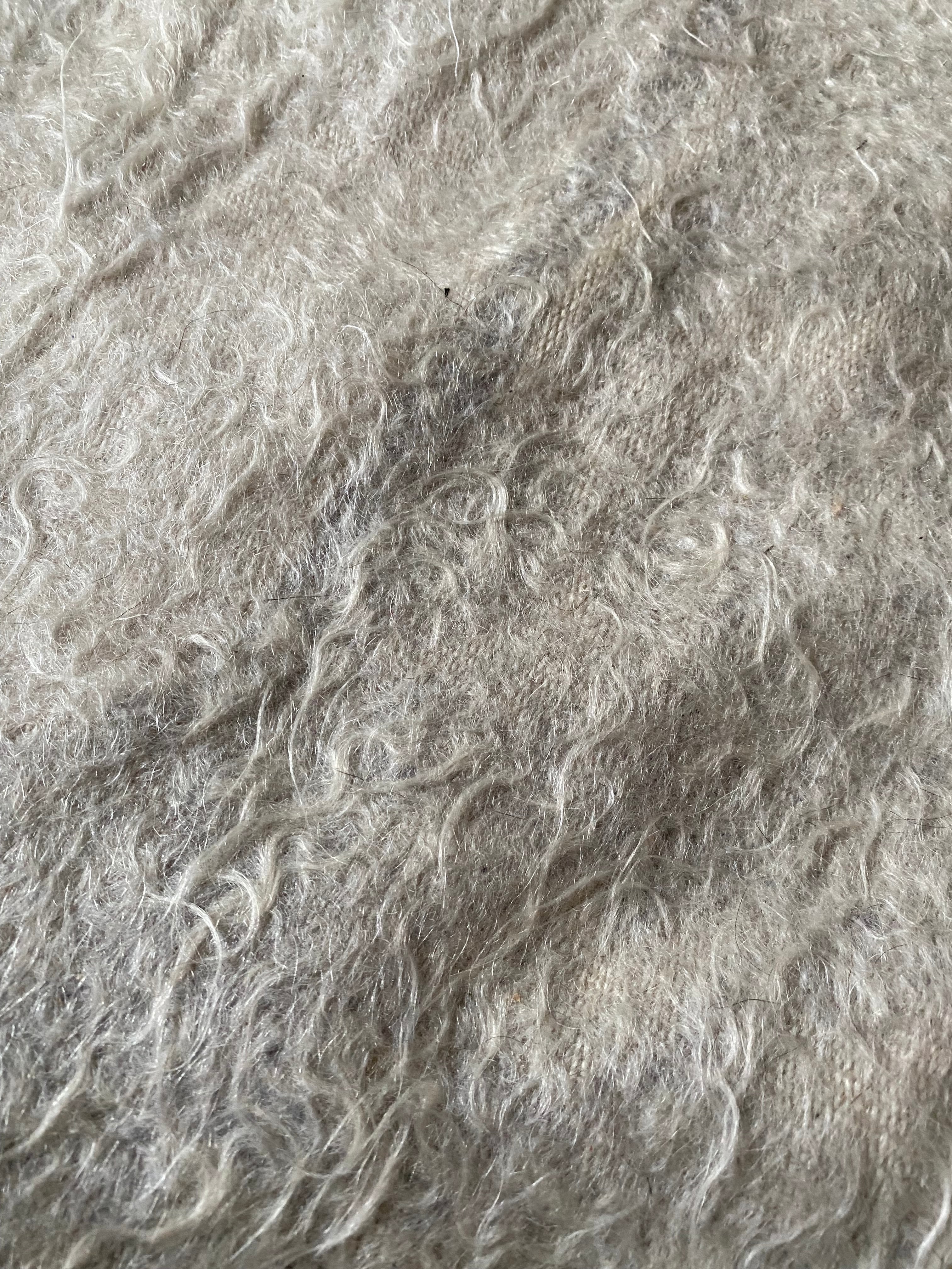 自然のヤギの毛で織られていますので、独特のくるくるとした感じも可愛く、とてもナチュ ラルな感じです。アンゴラ山羊は18世紀の中ごろまでオスマントルコが飼育を独占していたらしいです。 その後改良され、良質のモヘアとして世界的に発展していったそうです。モヘアと言えば、カシミヤと並ぶ素材ですね。山羊の毛ですので、羊より高級で暖かです。