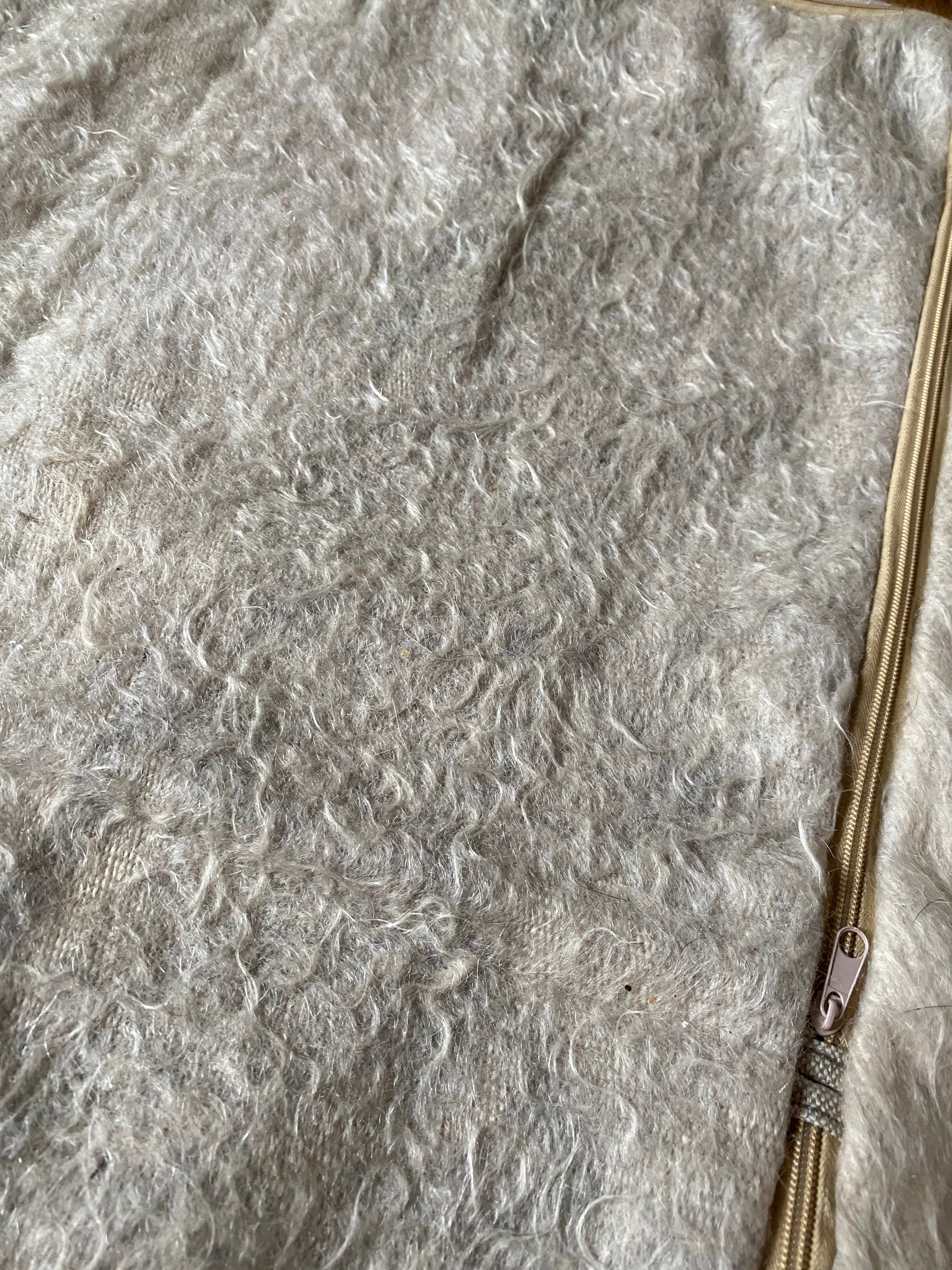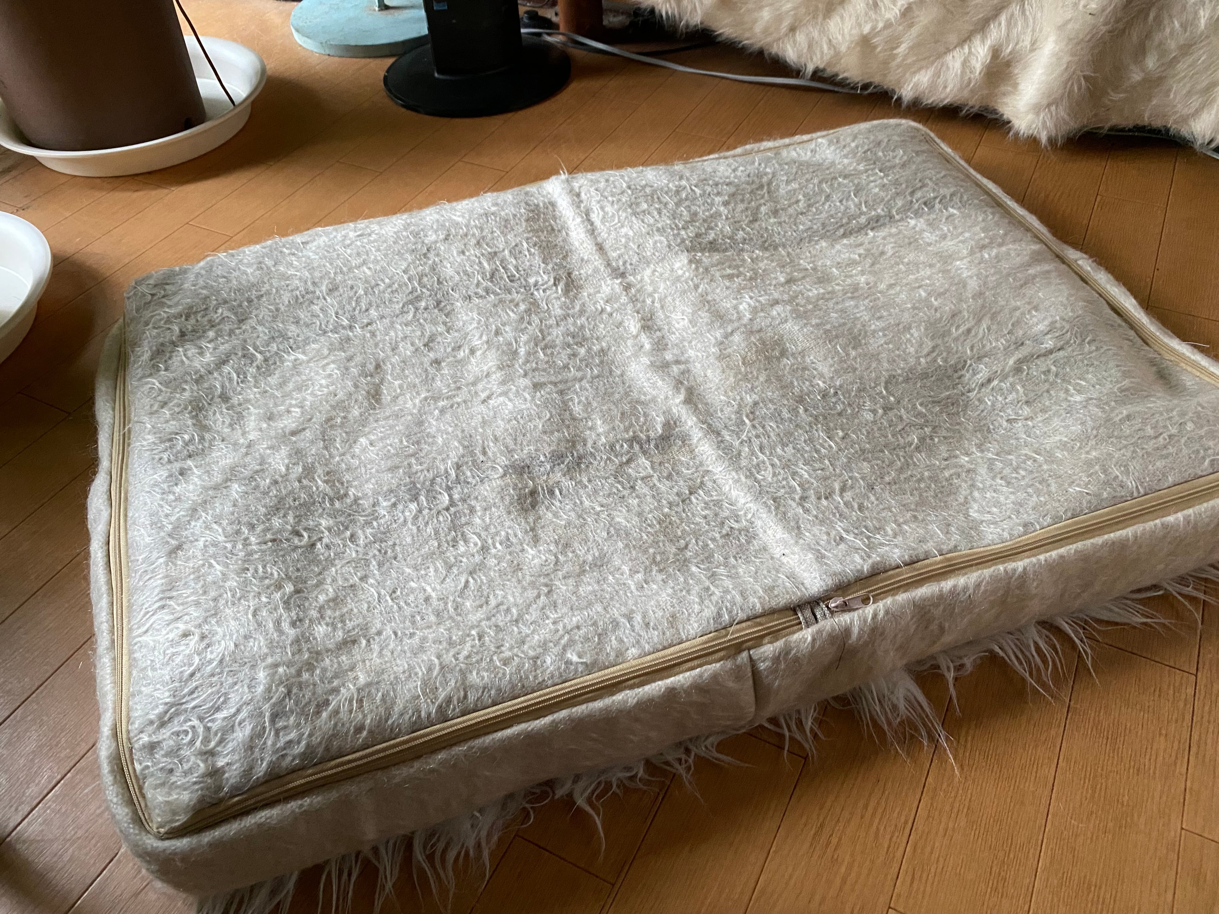 トルコ発羊の毛のラグTULUと山羊のモヘアで織られたシイルトバッタニイェを使った大判長方形のプフ!90×60!なかに毛布を入れたら気持ち良いペットのベッドに!大型犬も気持ちよく寝れます!一枚のみ試作品リーズナブルにご紹介!