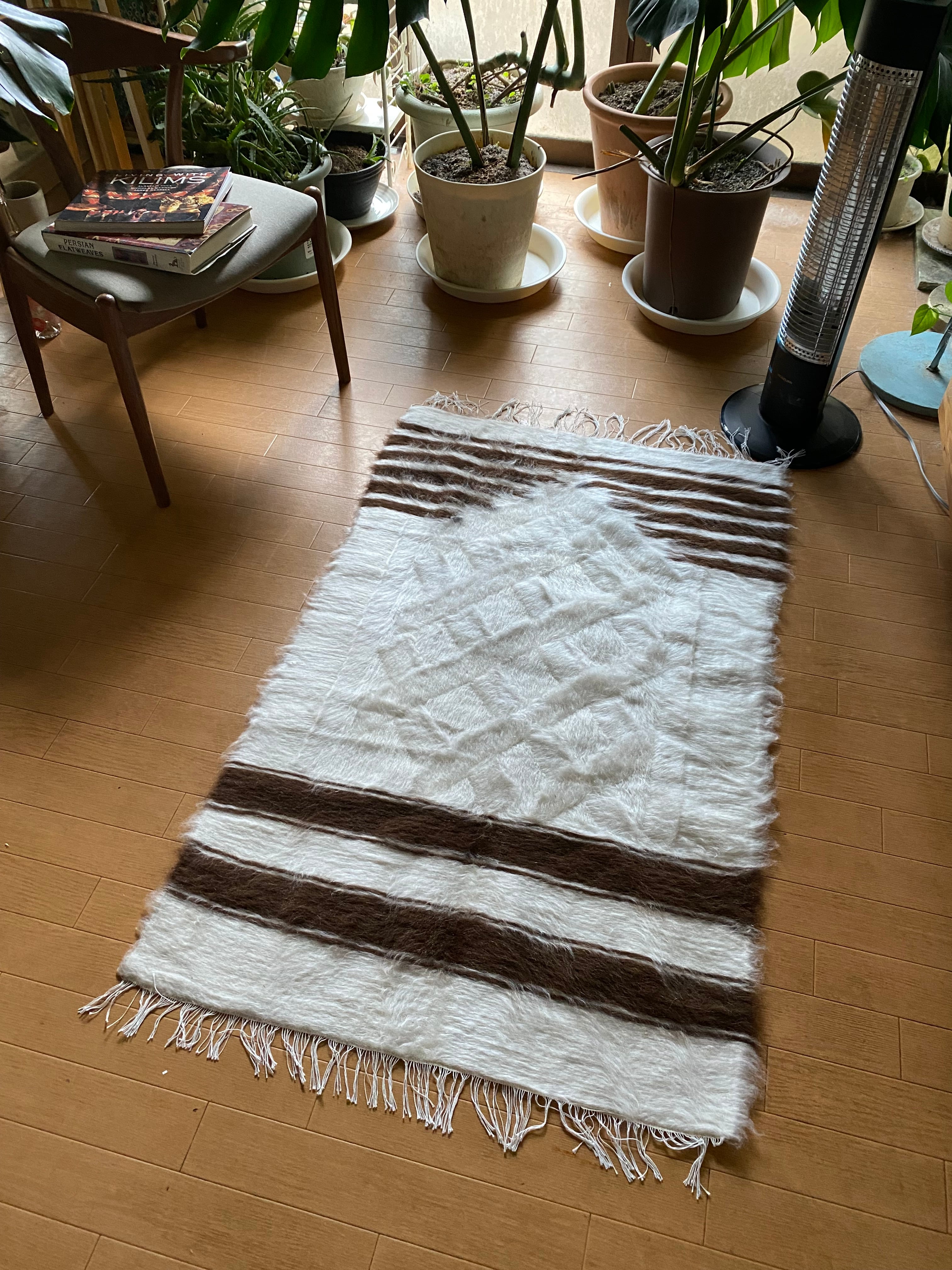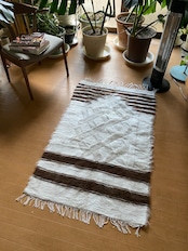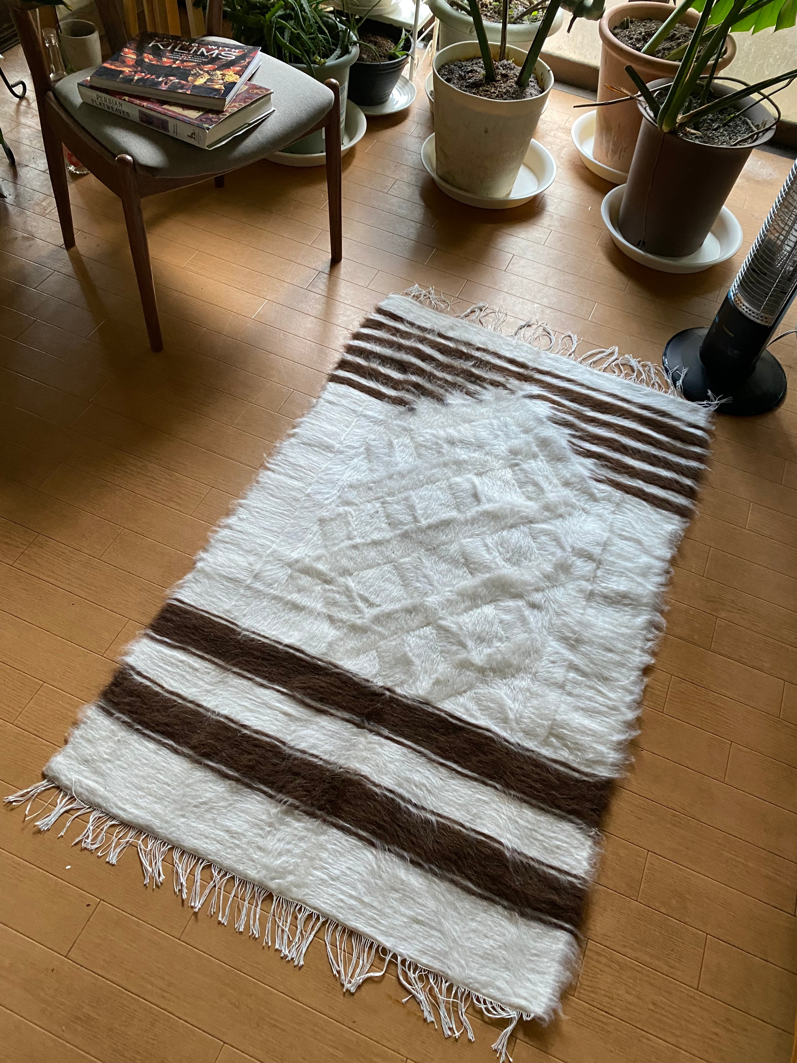 山羊ならではの模様をお楽しみください。 片面だけ毛が出ていて裏は毛がとってあるのだとおもいますので、裏面でお使いいただければ、普通のキリムとして も使えます。 冬は毛がある面で、夏は裏面でキリムとしてお使いいただける優れものです。 また毛のある表は毛をけばだたせて、模様も作っていますのでとてもおしゃれ度が高いです。 新品未使用品です。