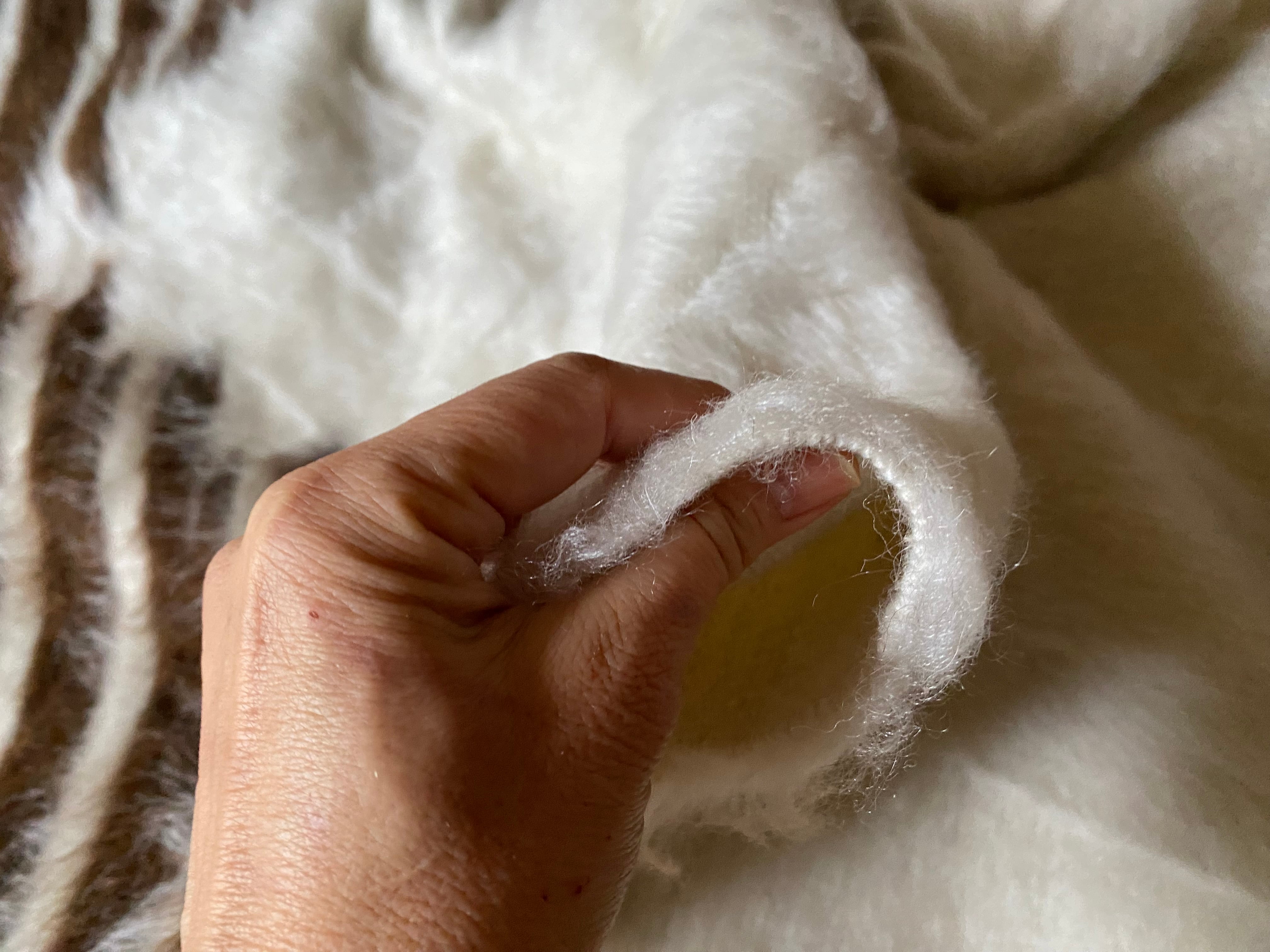 また、毛をけば立てて幾何学模様が入っておりますが、ウールではこのような毛羽立ちの模様はできないそうです。