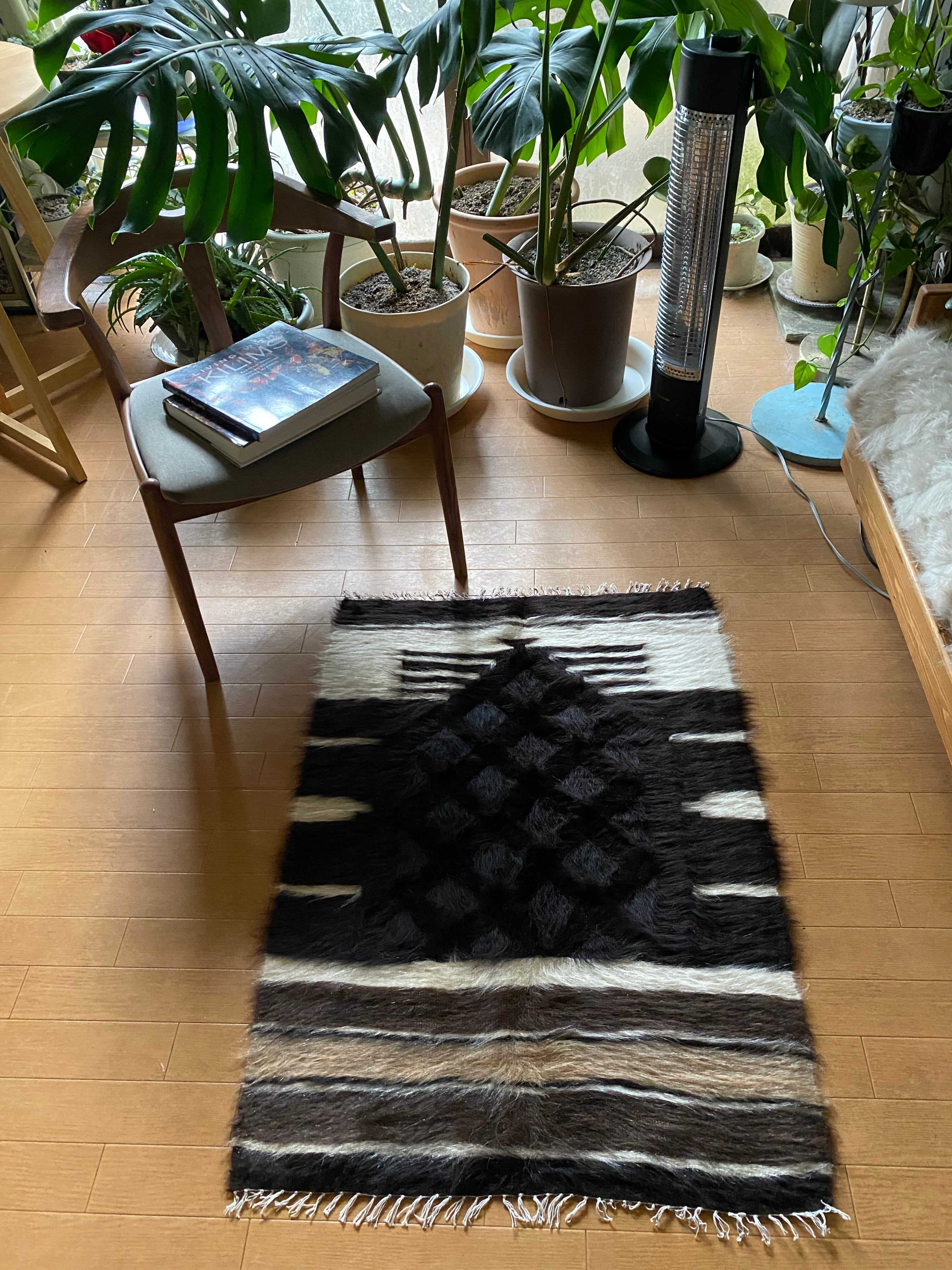 今の新しいものにくらべ、アンティークのバッタ二エと同じくらい密度が濃く、毛の艶がさらに良い山羊の毛で織られています。 未使用ですが、 ご覧いただけますように毛足も長めでつやつやです。30〜40年ほど前に織られていますが、ほぼ未使用のヴィンテージ未使用品になります。