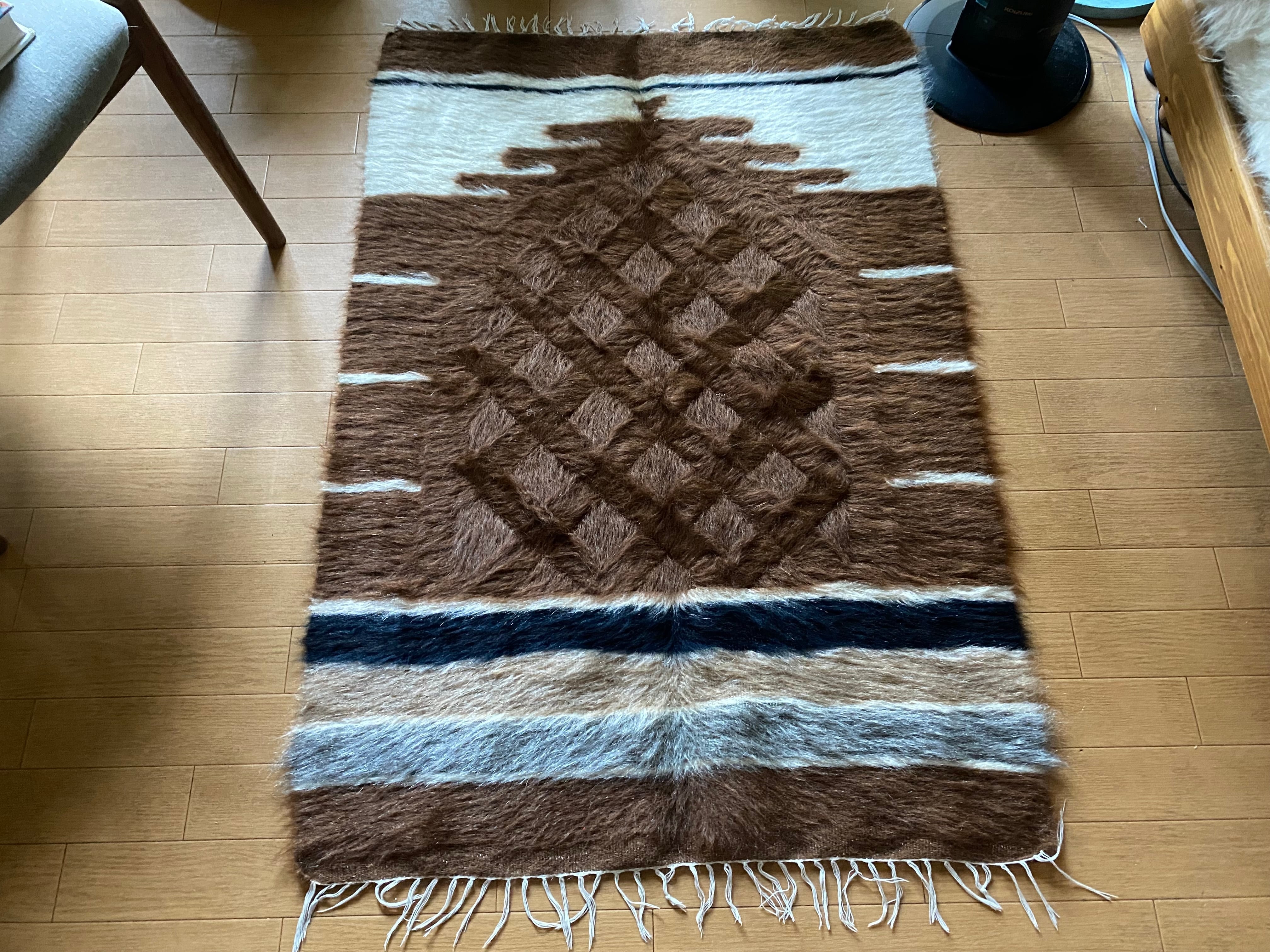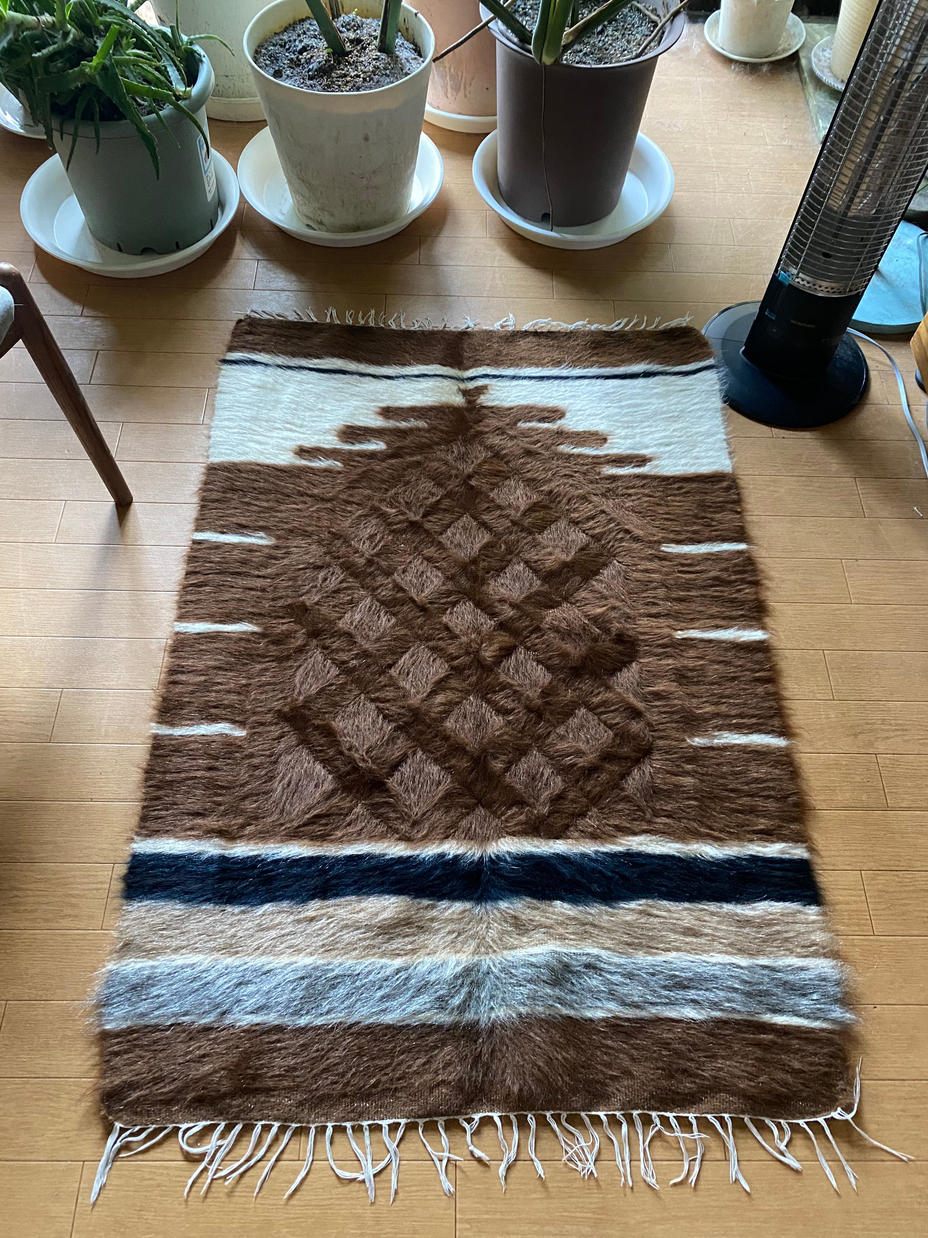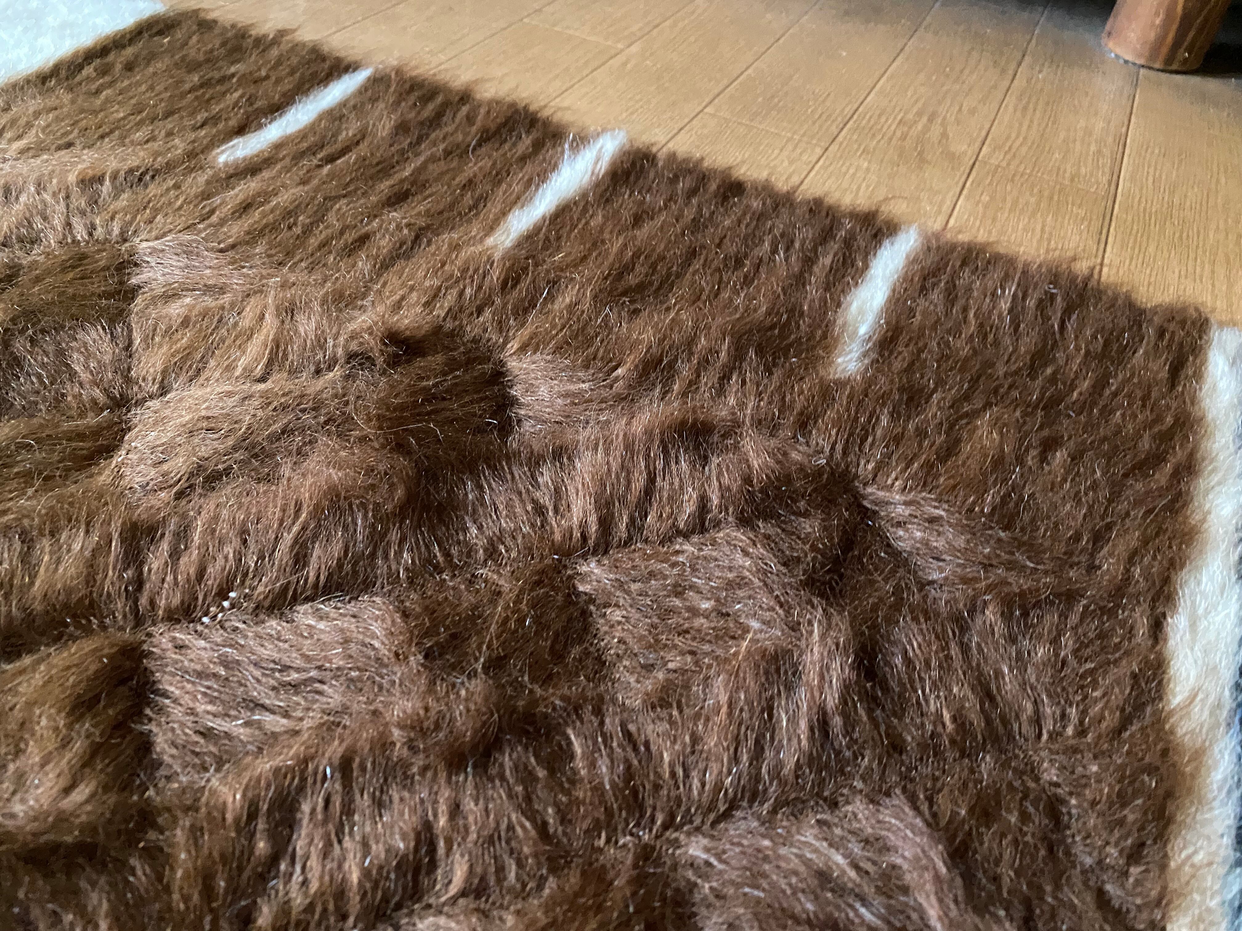 今の新しいものにくらべ、アンティークのバッタ二エと同じくらい密度が濃く、毛の艶がさらに良い山羊の毛で織られています。 未使用ですが、 ご覧いただけますように毛足も長めでつやつやです。30〜40年ほど前に織られていますが、ほぼ未使用のヴィンテージ未使用品になります。