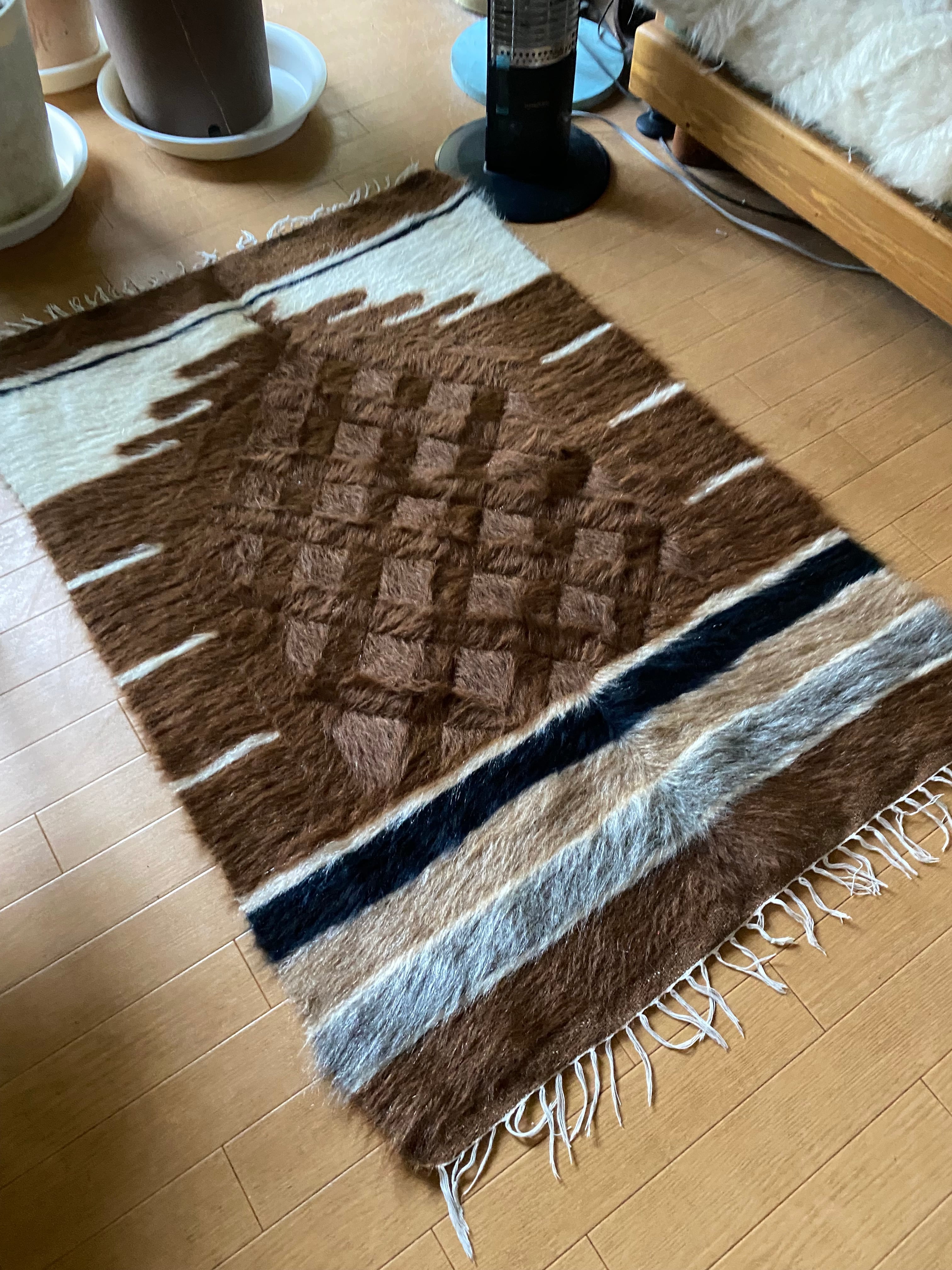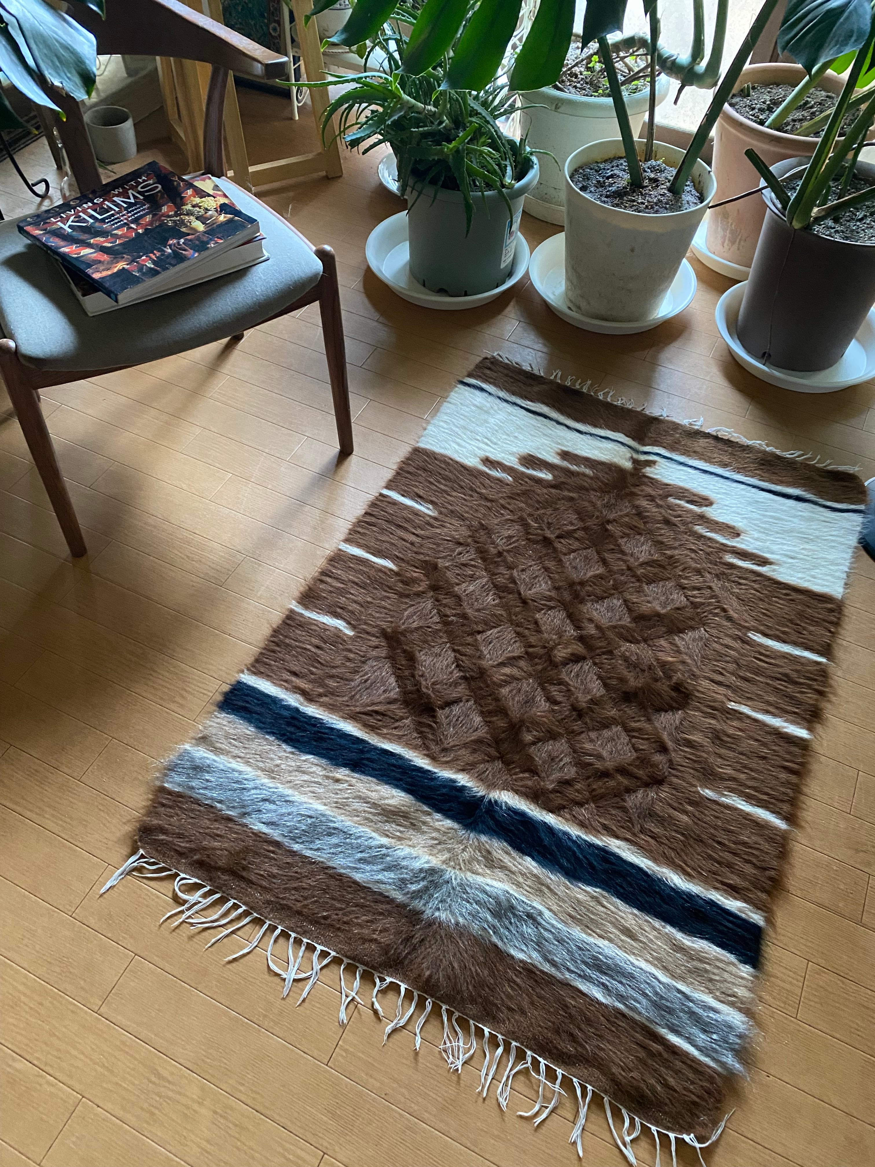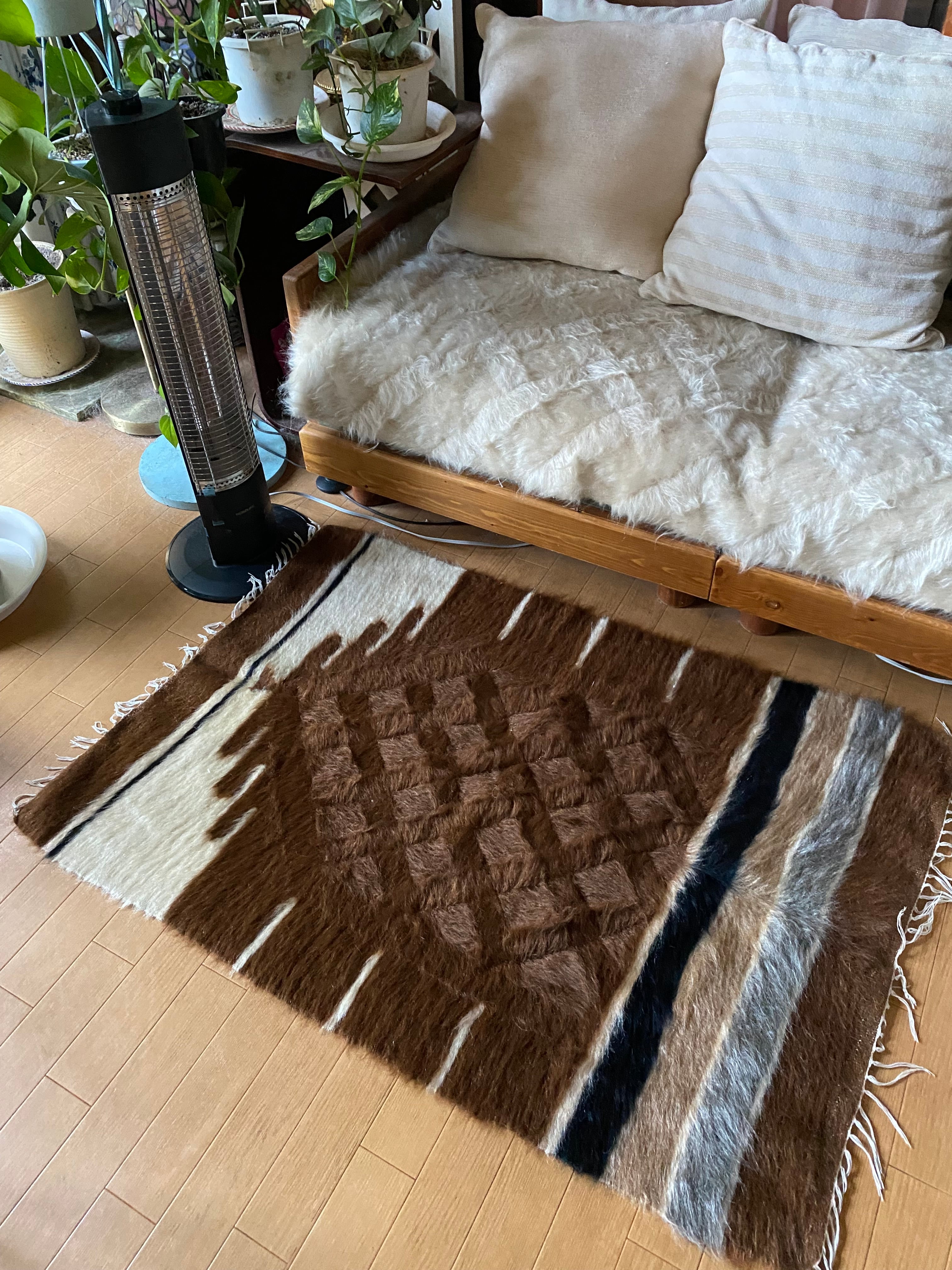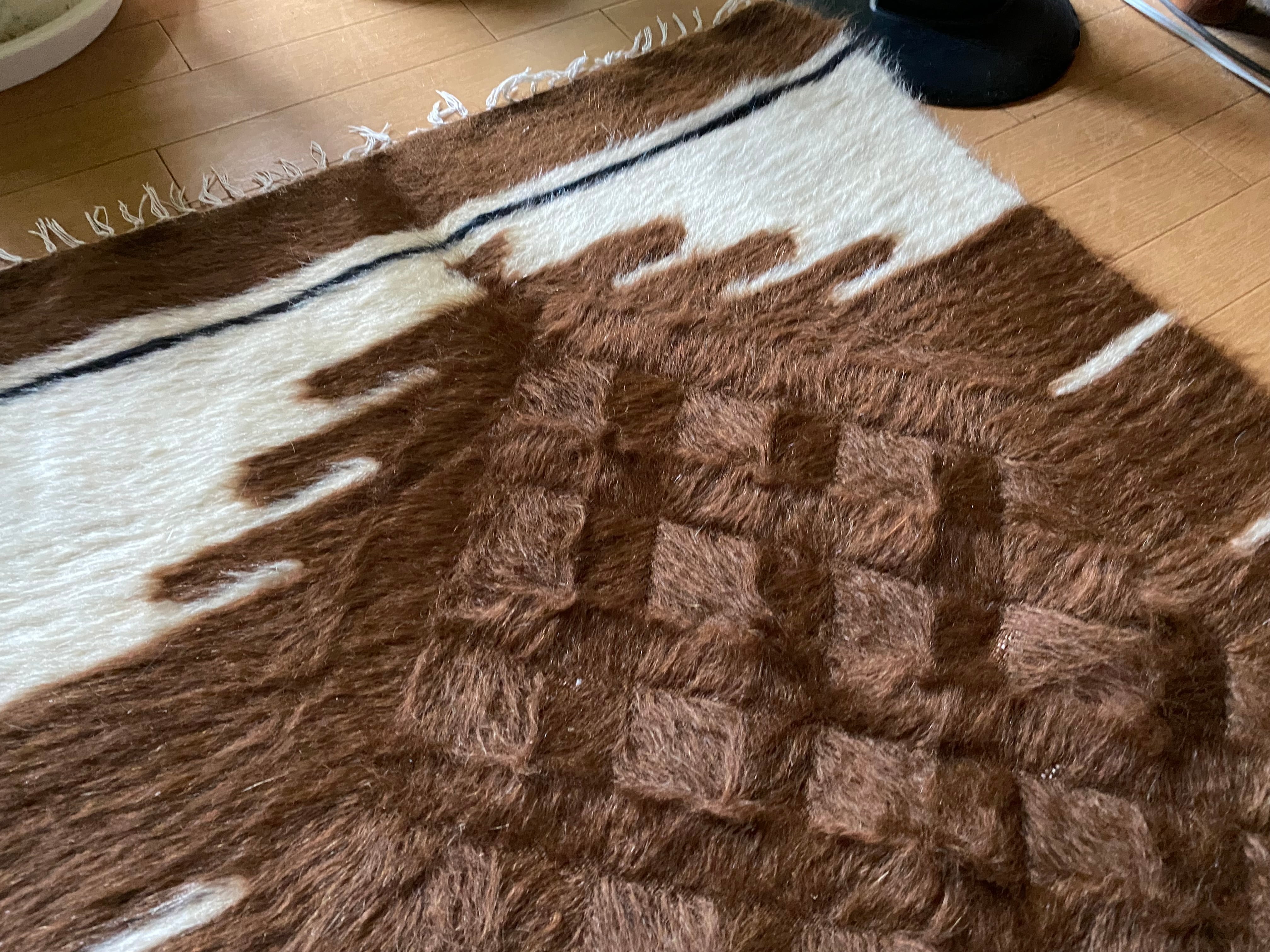 今の新しいものにくらべ、アンティークのバッタ二エと同じくらい密度が濃く、毛の艶がさらに良い山羊の毛で織られています。 未使用ですが、 ご覧いただけますように毛足も長めでつやつやです。30〜40年ほど前に織られていますが、ほぼ未使用のヴィンテージ未使用品になります。