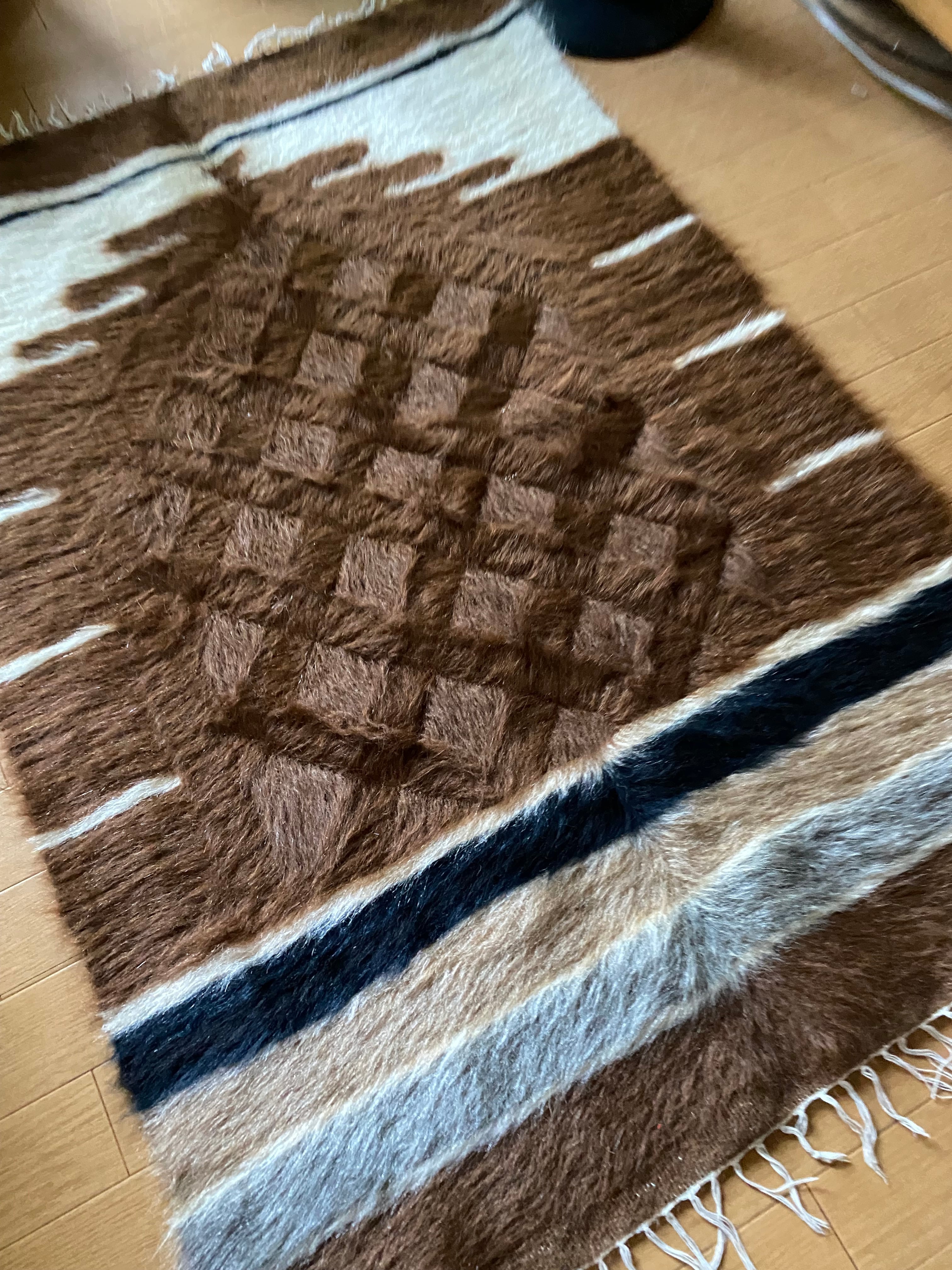 また、毛をけば立てて幾何学模様が入っておりますが、ウールではこのような毛羽立ちの模様はできないそうです。山羊ならではの模様をお楽しみください。 裏面でお使いいただければ、普通のキリムとして も使えます。