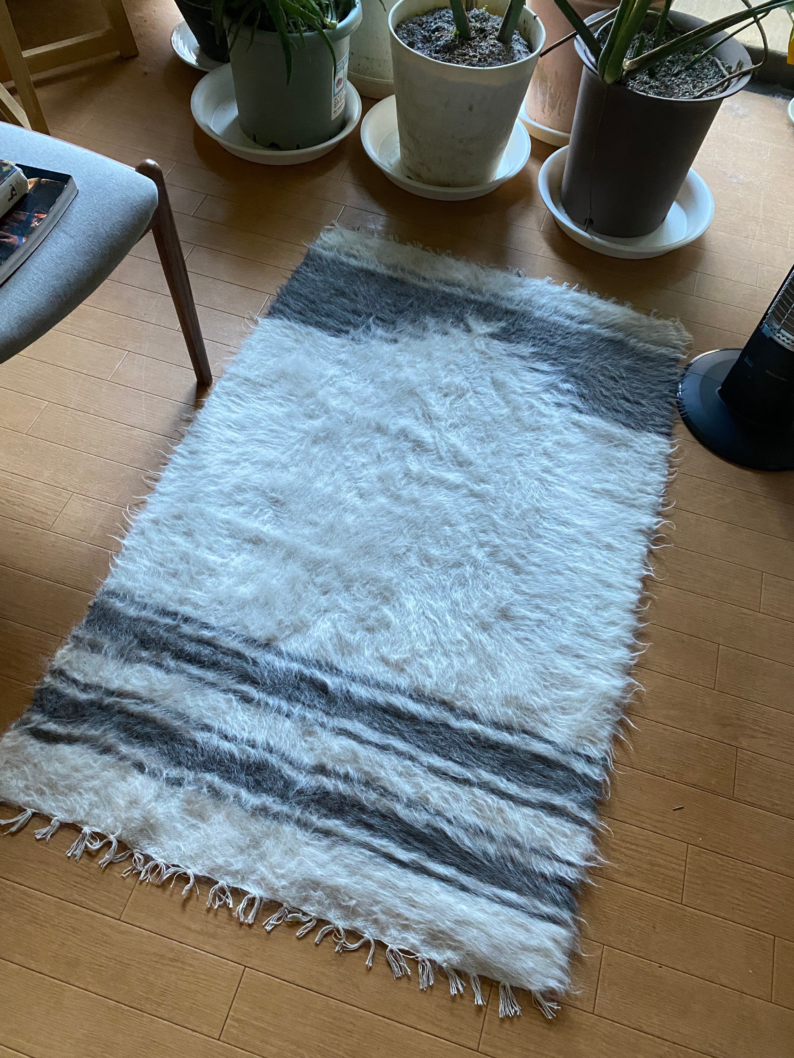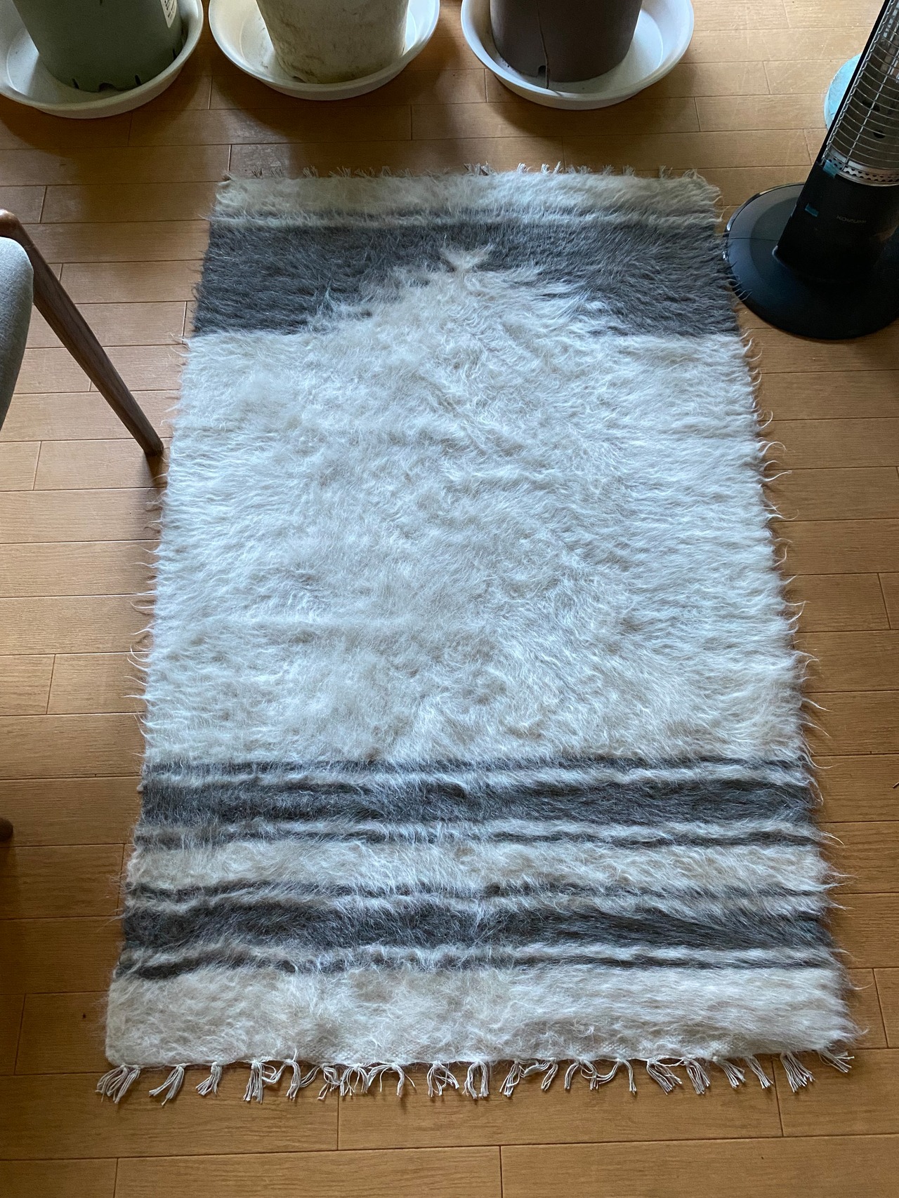 今の新しいものにくらべ、アンティークのバッタ二エと同じくらい密度が濃く、毛の艶がさらに良い山羊の毛で織られています。 未使用ですが、 ご覧いただけますように毛足も長めでつやつやです。30〜40年ほど前に織られていますが、ほぼ未使用のヴィンテージ未使用品になります。