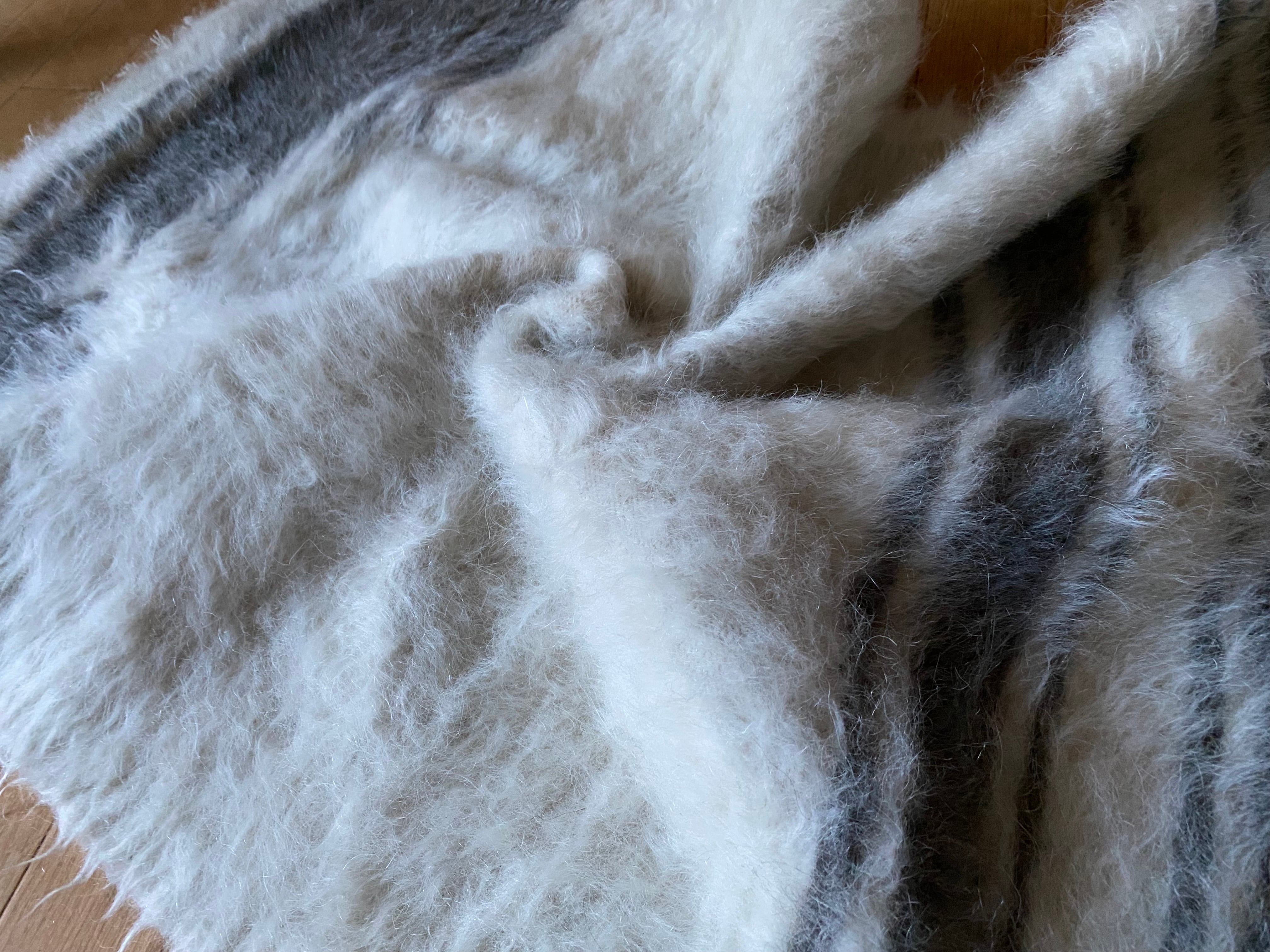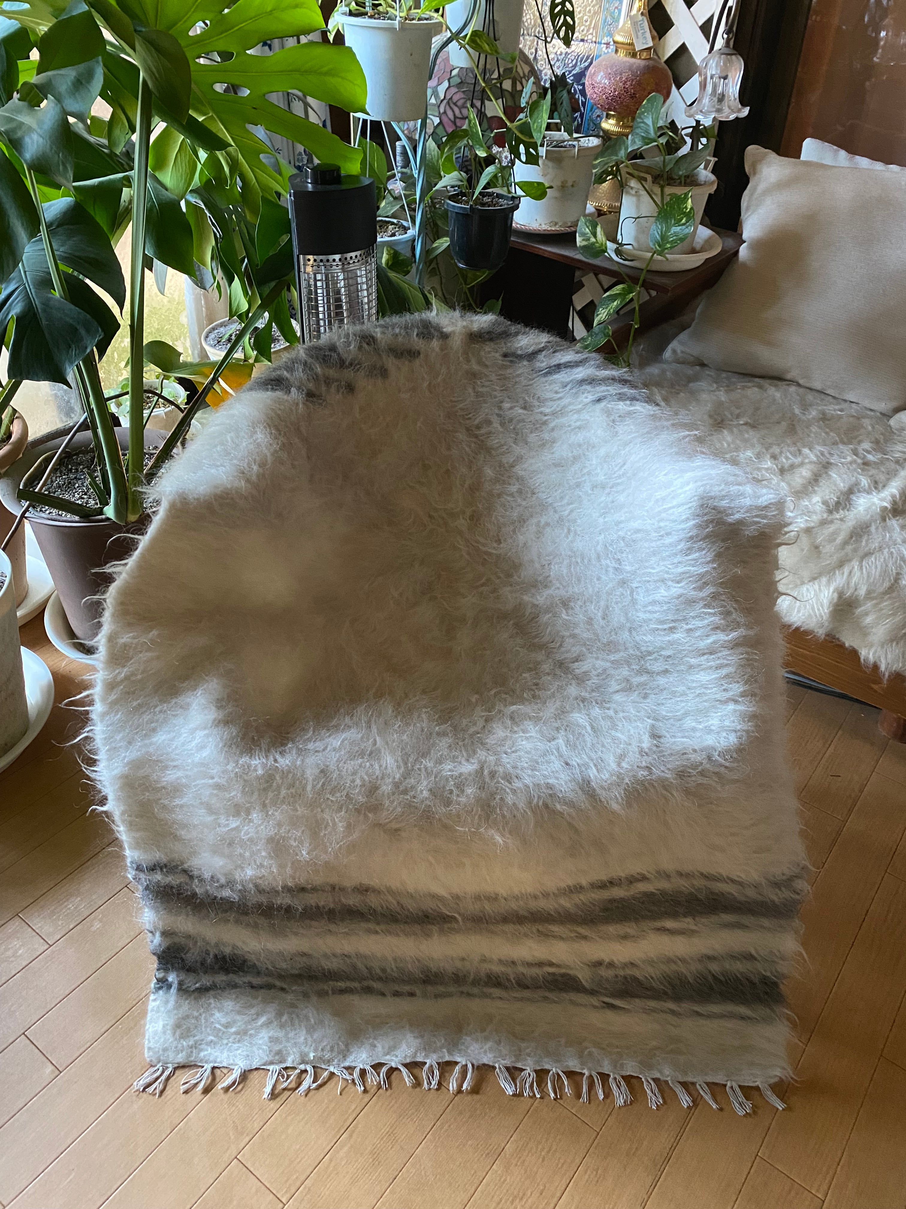 合わせやすい上品な色合いヴィンテージグレーと白のシイルトバッタニイェ!アンゴラヤギのモヘアのみで織られた暖かく、お洒落なトルコ遊牧民の生活の知恵!140年前から織られている人に動物にも優しい動物を傷つけないエコな織物ソファや椅子や車にも1枚あると大変便利な逸品