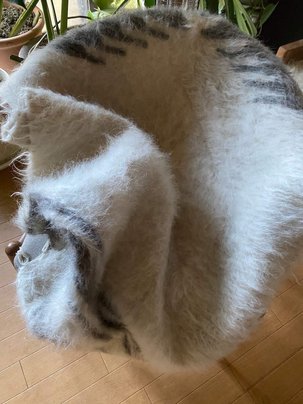 モヘアの毛糸はアクリル混のものでも、100グラムのものでも2500円~3000円ほどしますので こちらほど沢山のモヘアが使われおりますと、とてもお高いものになります。