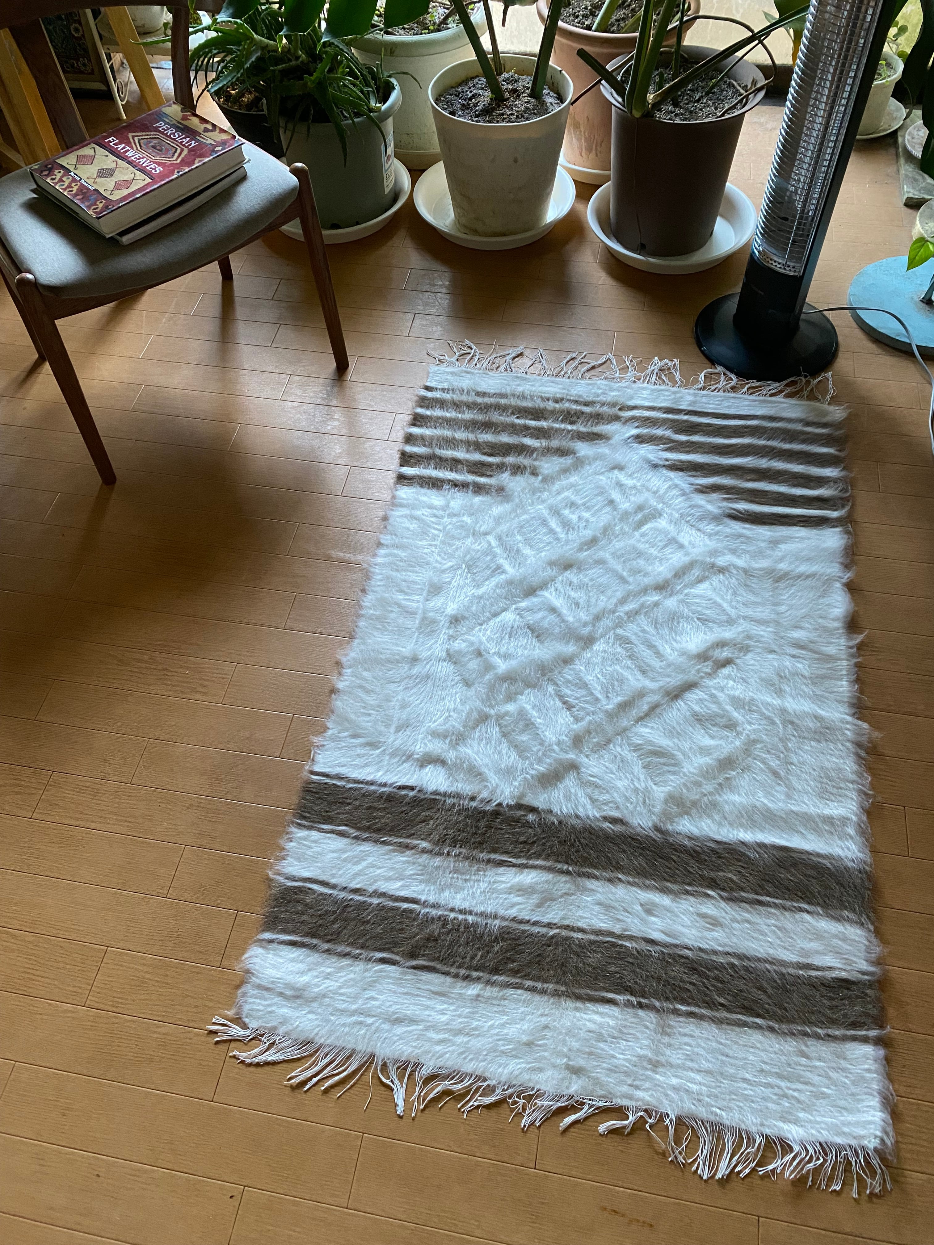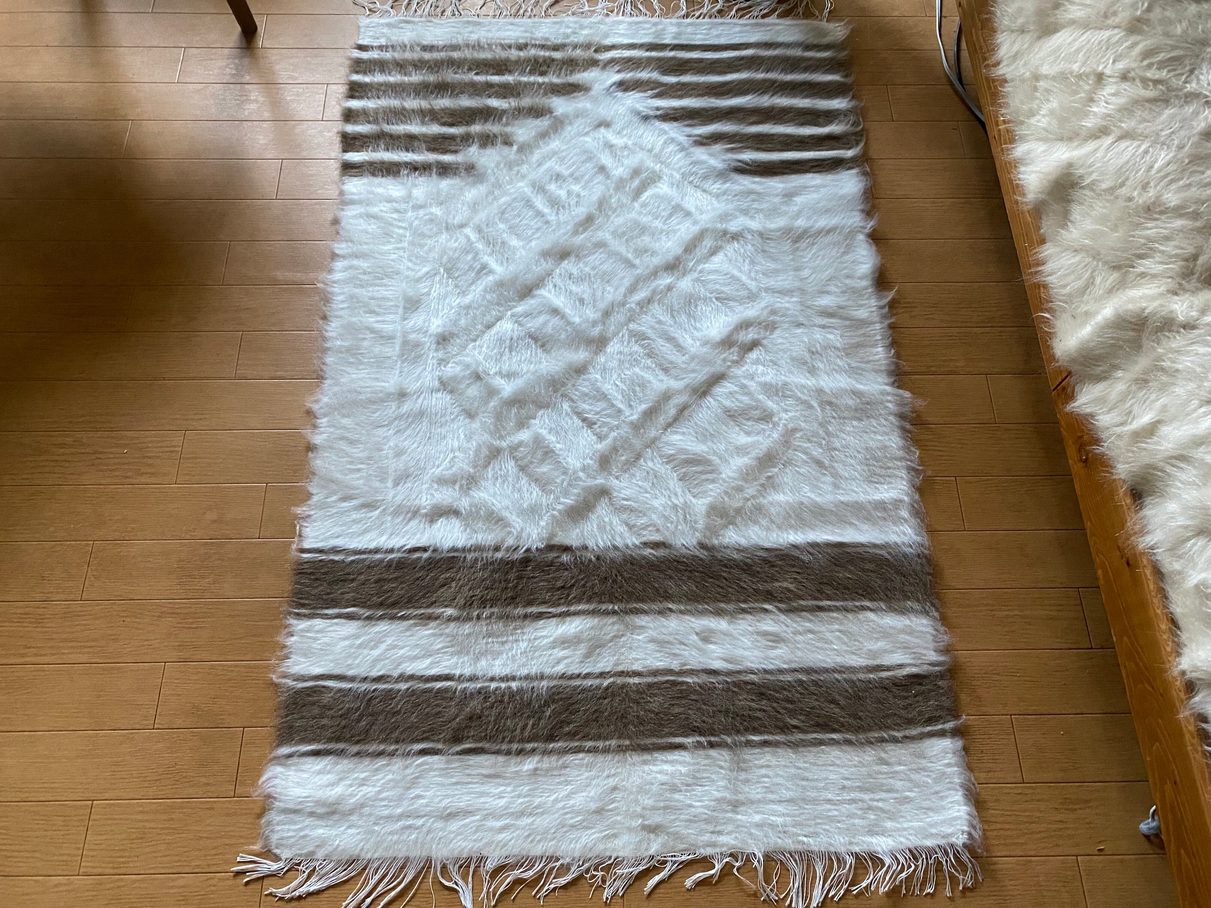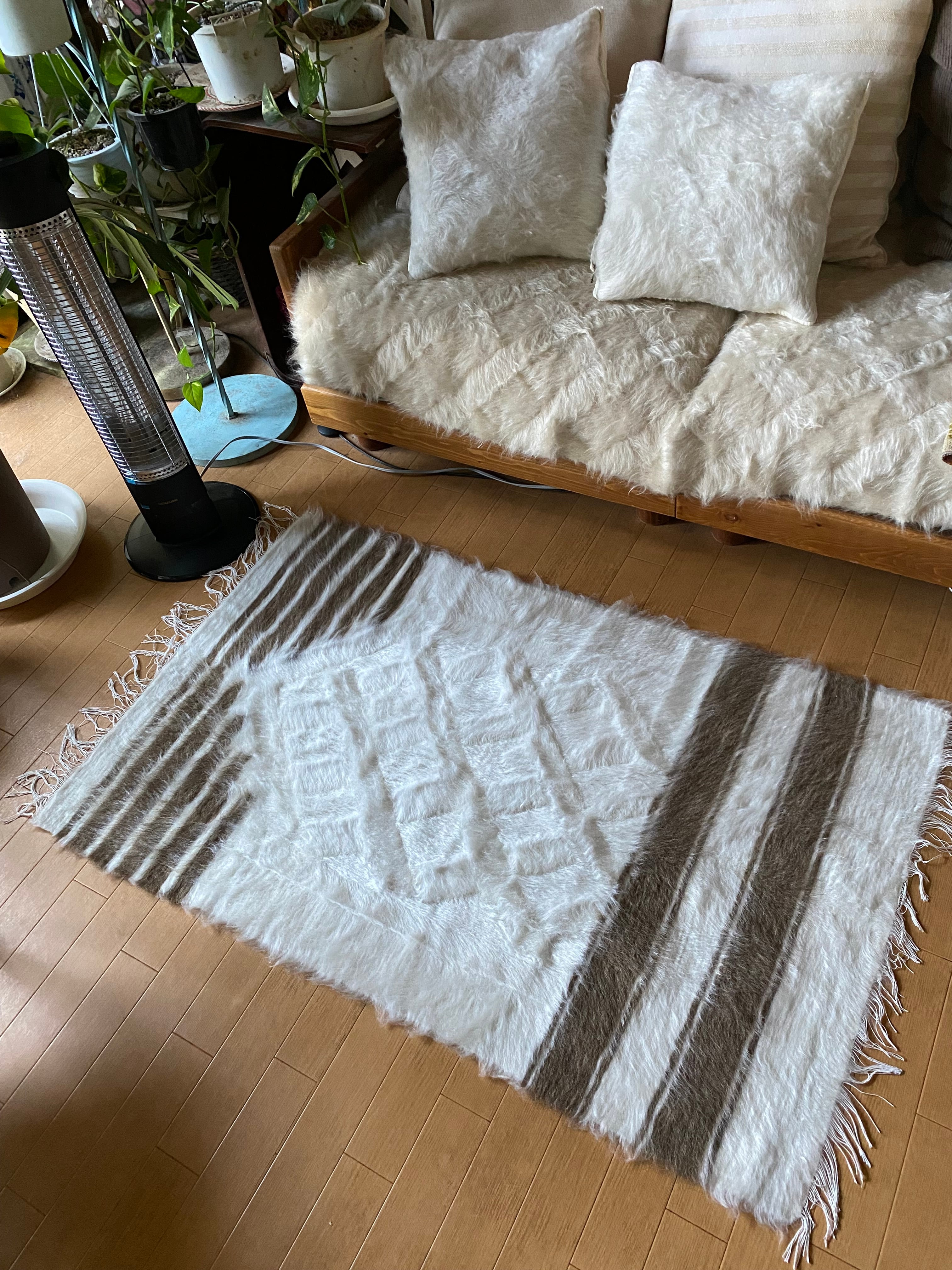 山羊ならではの模様をお楽しみください。 片面だけ毛が出ていて裏は毛がとってあるのだとおもいますので、裏面でお使いいただければ、普通のキリムとして も使えます。 冬は毛がある面で、夏は裏面でキリムとしてお使いいただける優れものです。 また毛のある表は毛をけばだたせて、模様も作っていますのでとてもおしゃれ度が高いです。 新品未使用品です。