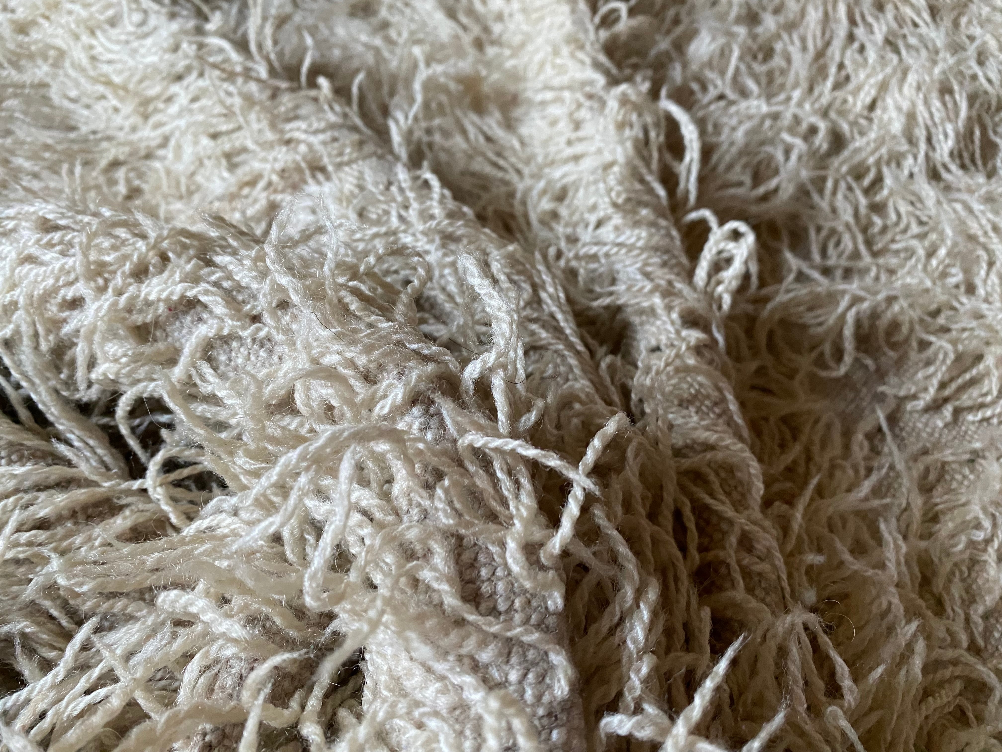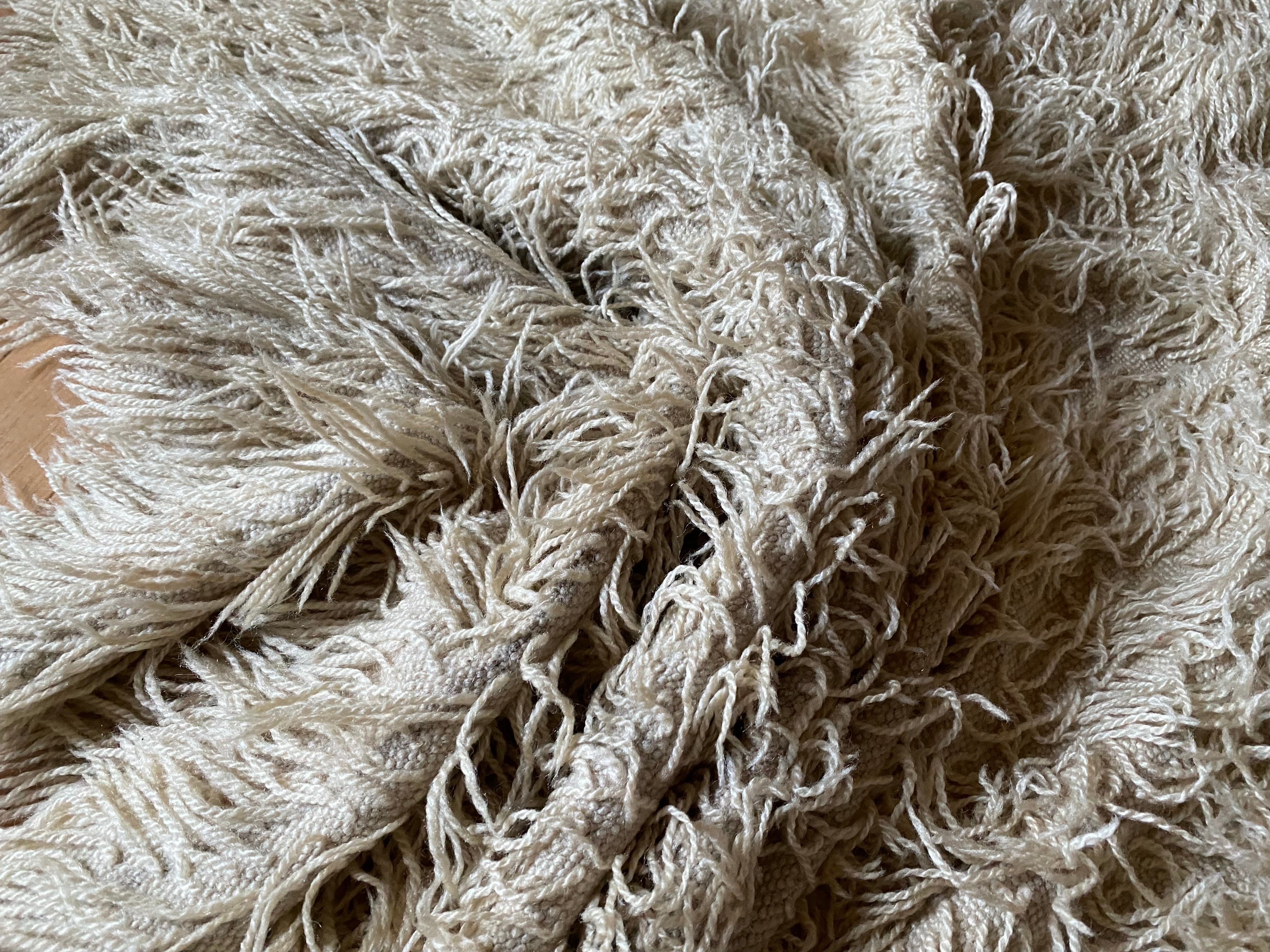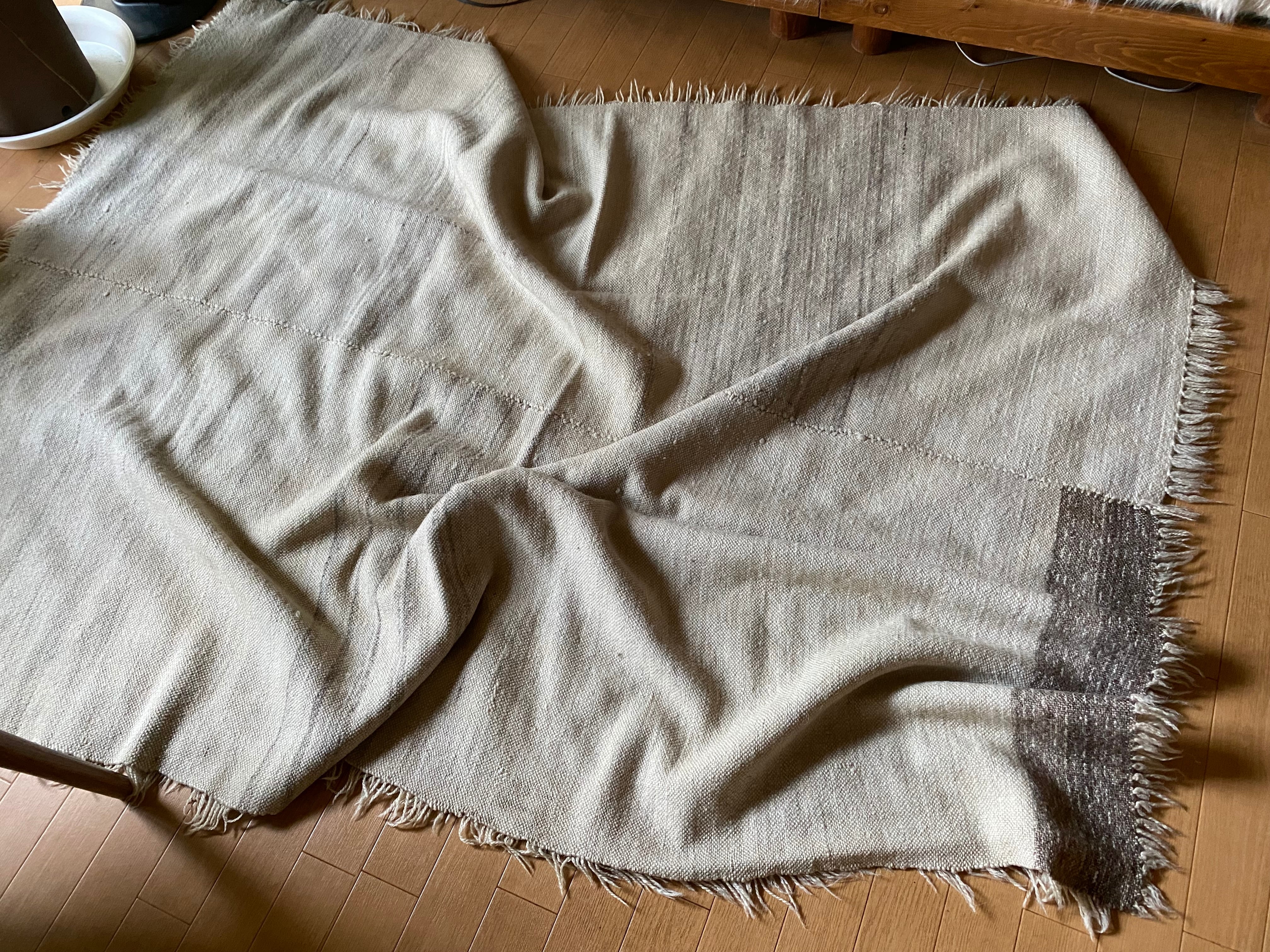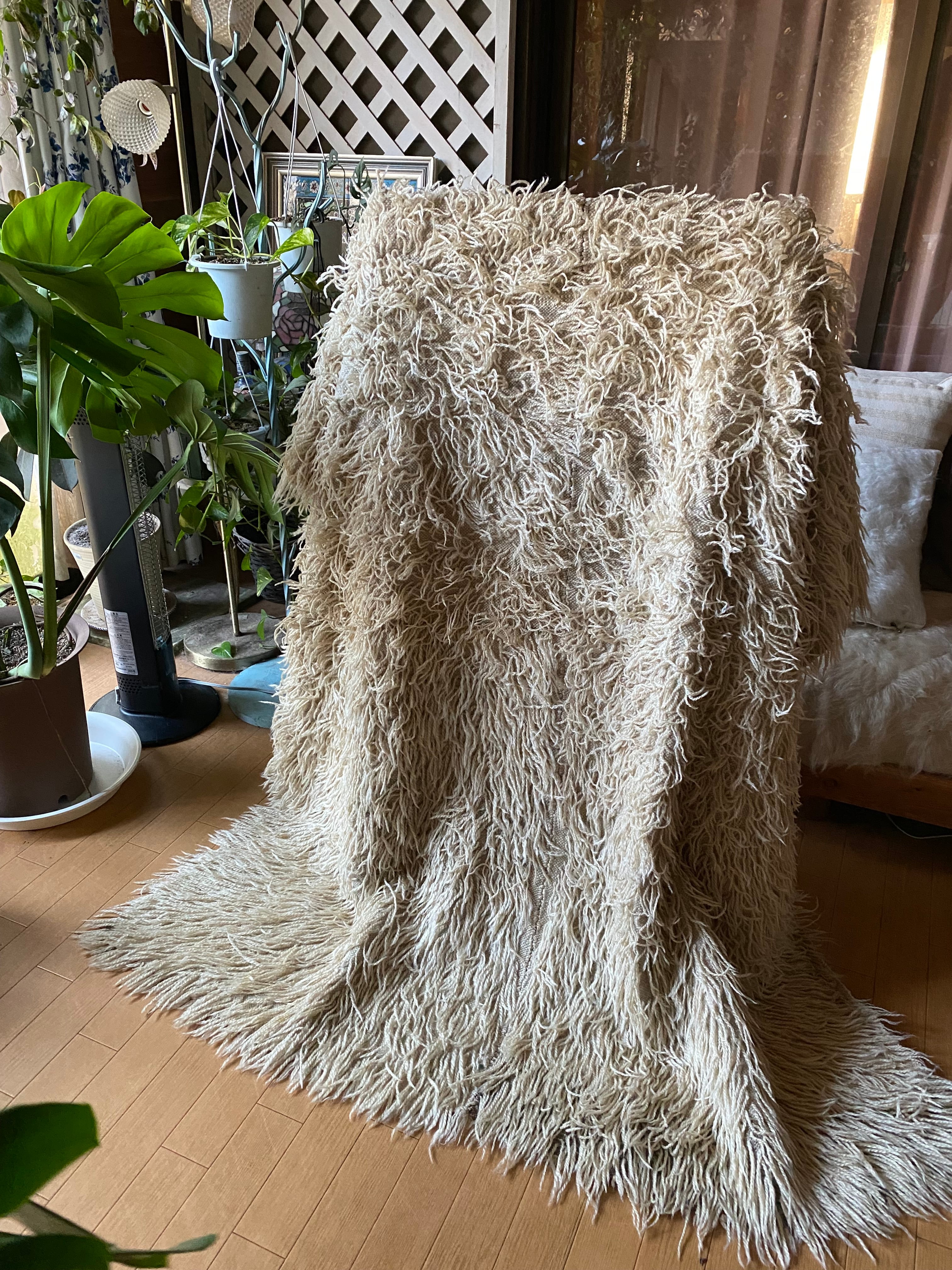 トルコのTULUを知っていますか?こちら大判大変レアなTULU! こちらはベージュがかった 細めの羊毛がびっしり! 撚った毛糸が使われています。 珍しい一枚! 裏は細かい織のキリムで夏場は裏でも!ソファに掛けてノマドみたいな使い方も素敵!羊さんを傷つけないTULU