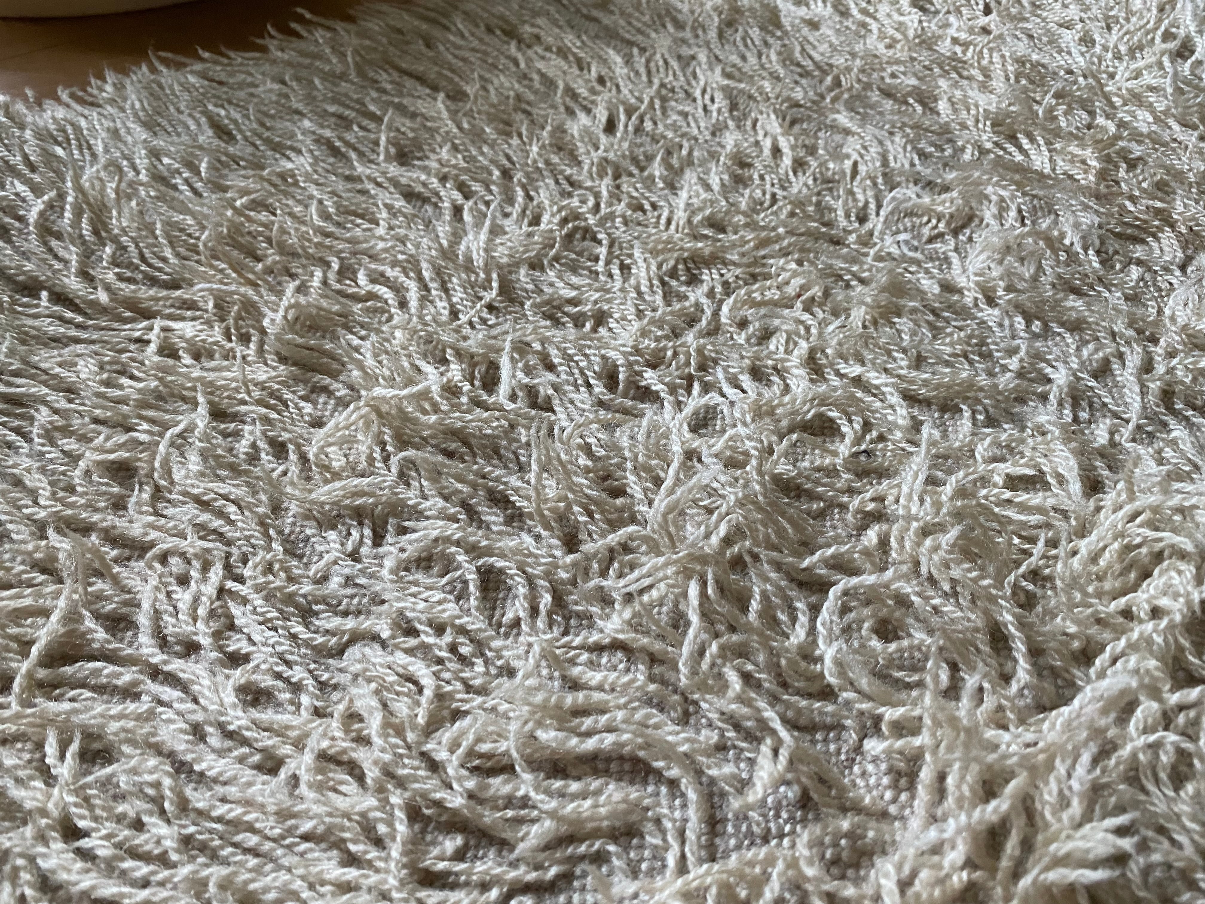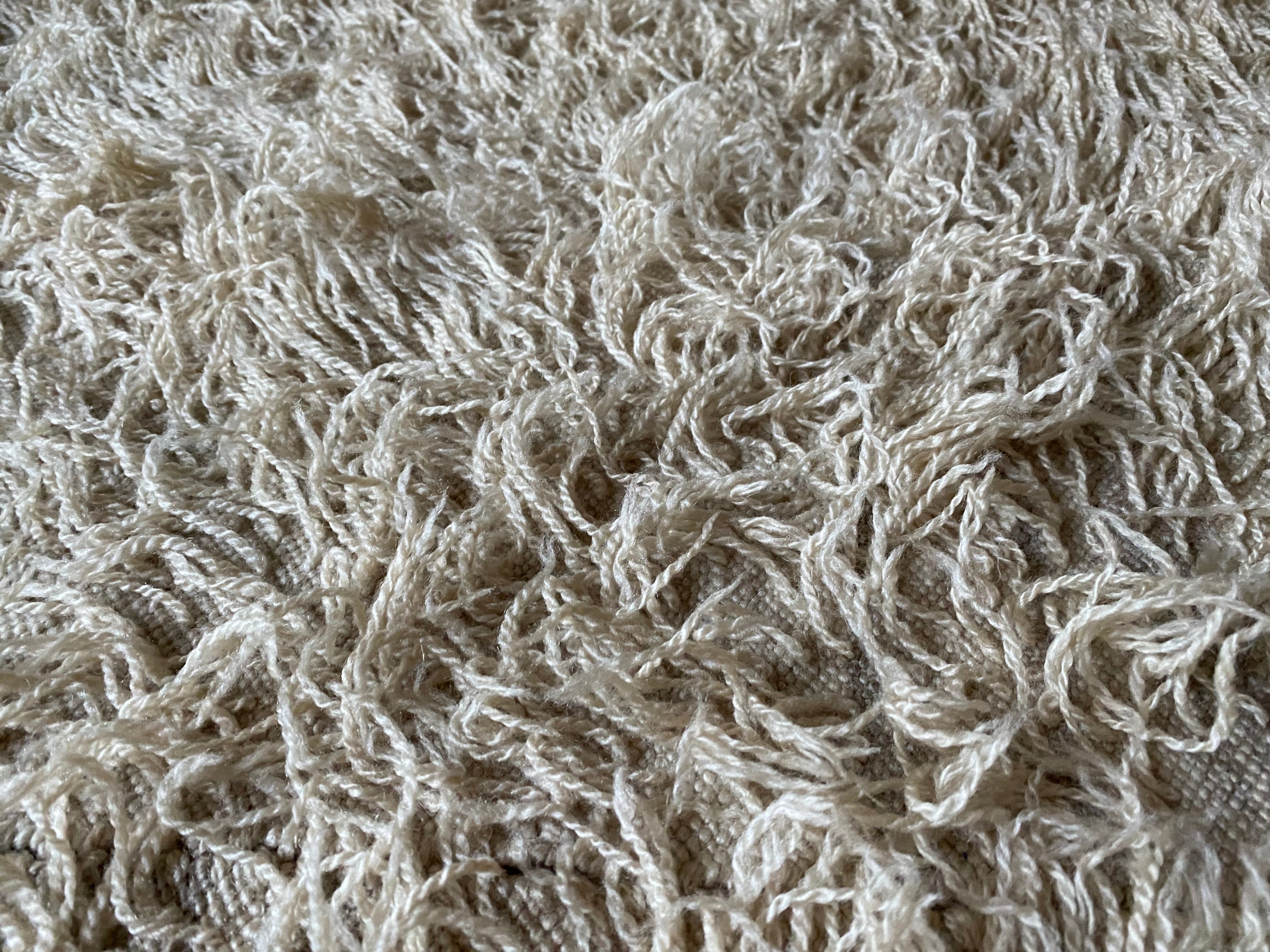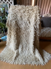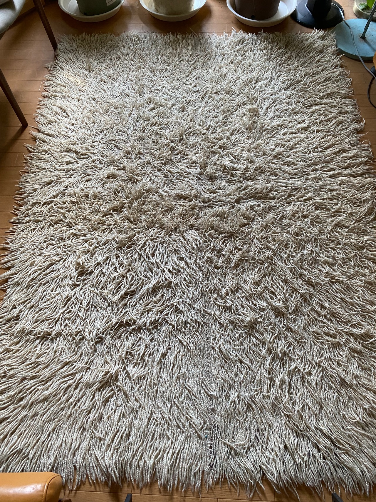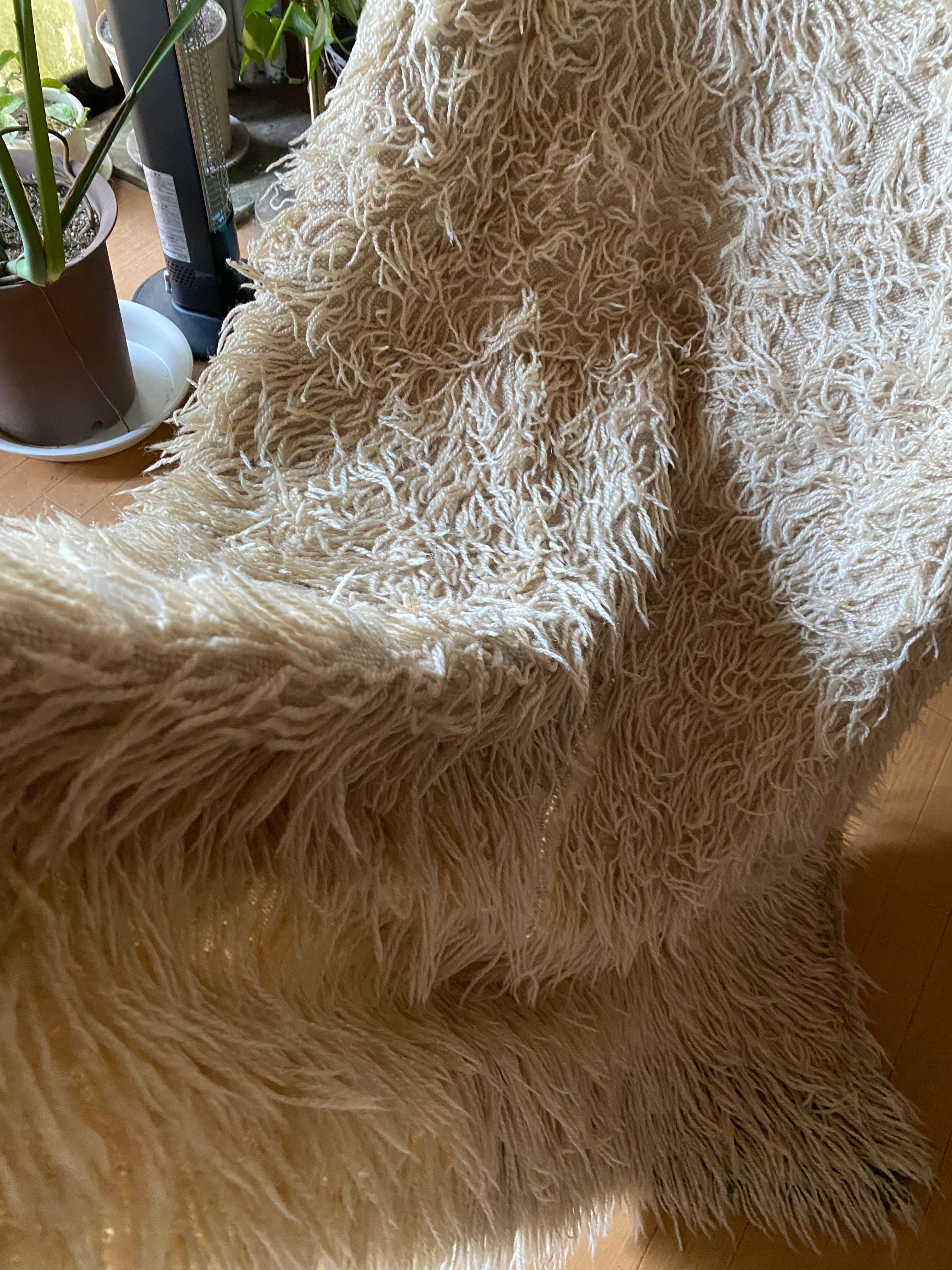 トルコのTULUを知っていますか?こちら大判大変レアなTULU! こちらはベージュがかった 細めの羊毛がびっしり! 撚った毛糸が使われています。 珍しい一枚! 裏は細かい織のキリムで夏場は裏でも!ソファに掛けてノマドみたいな使い方も素敵!羊さんを傷つけないTULU