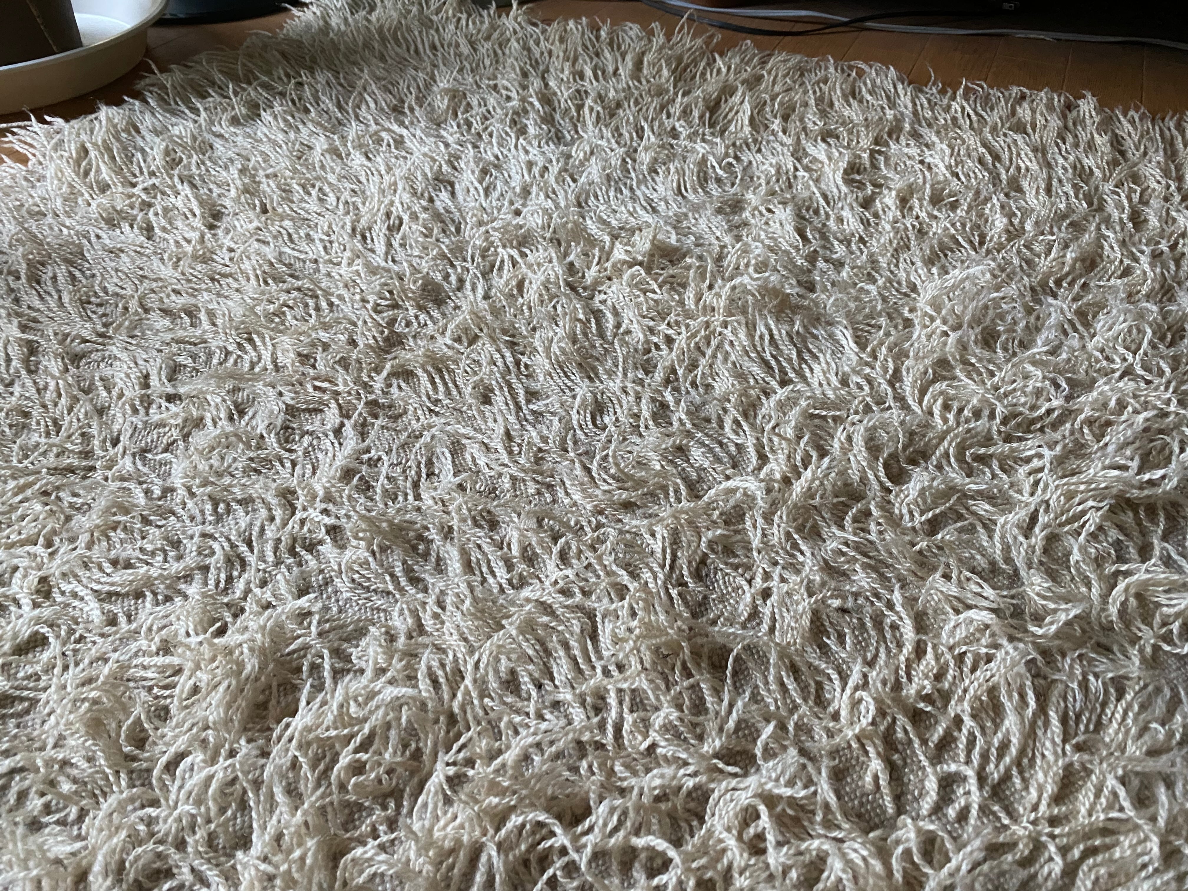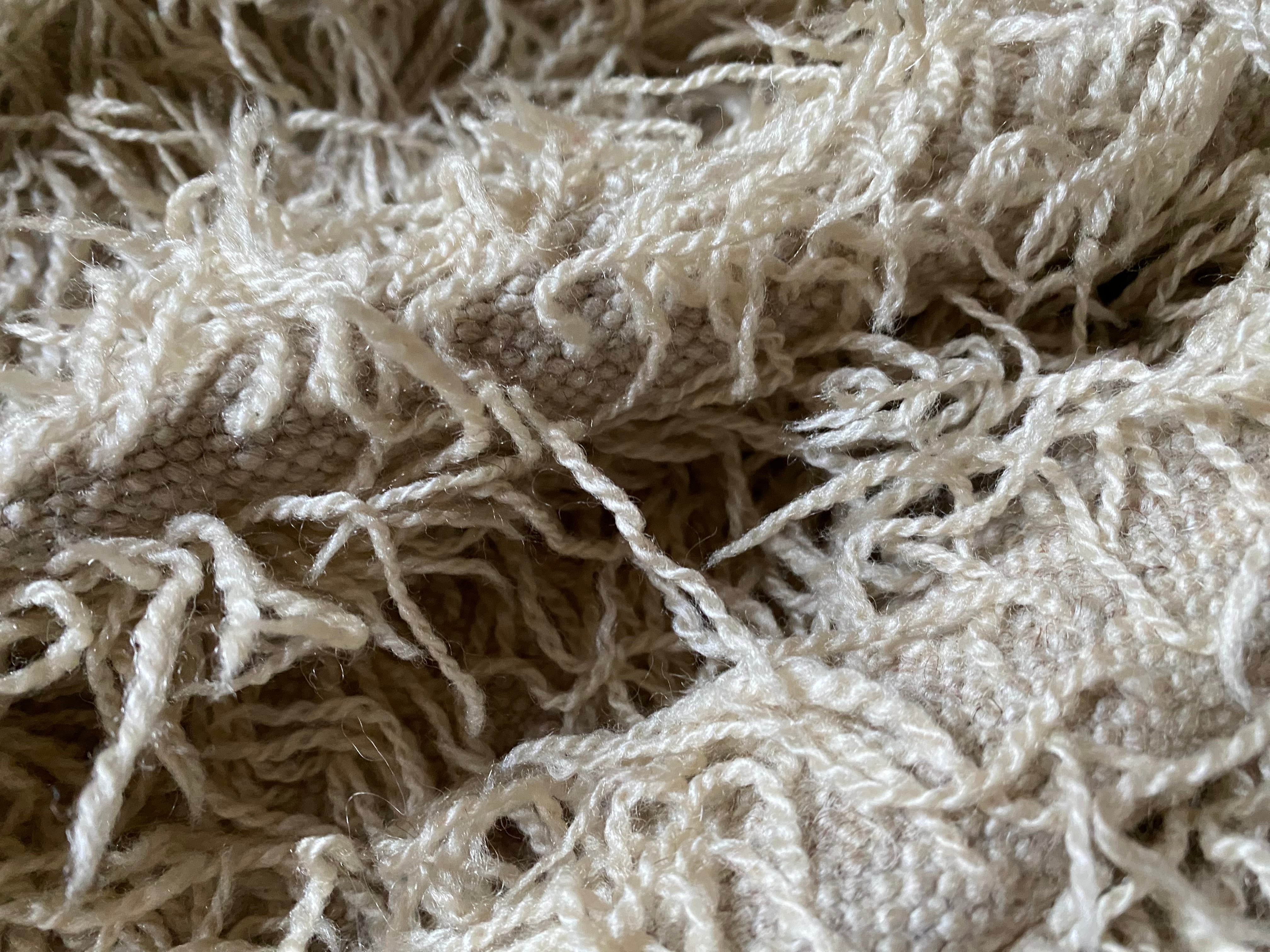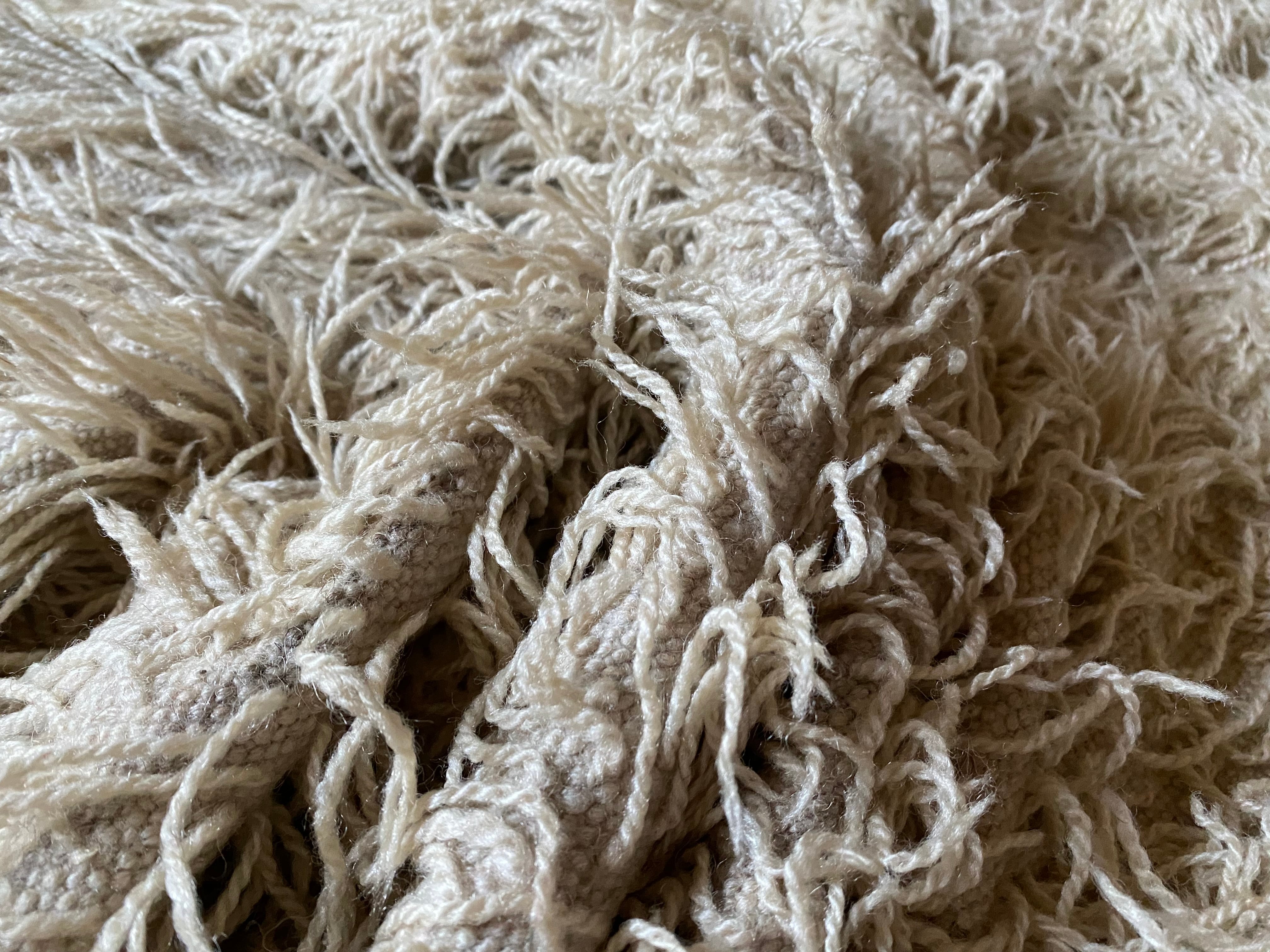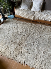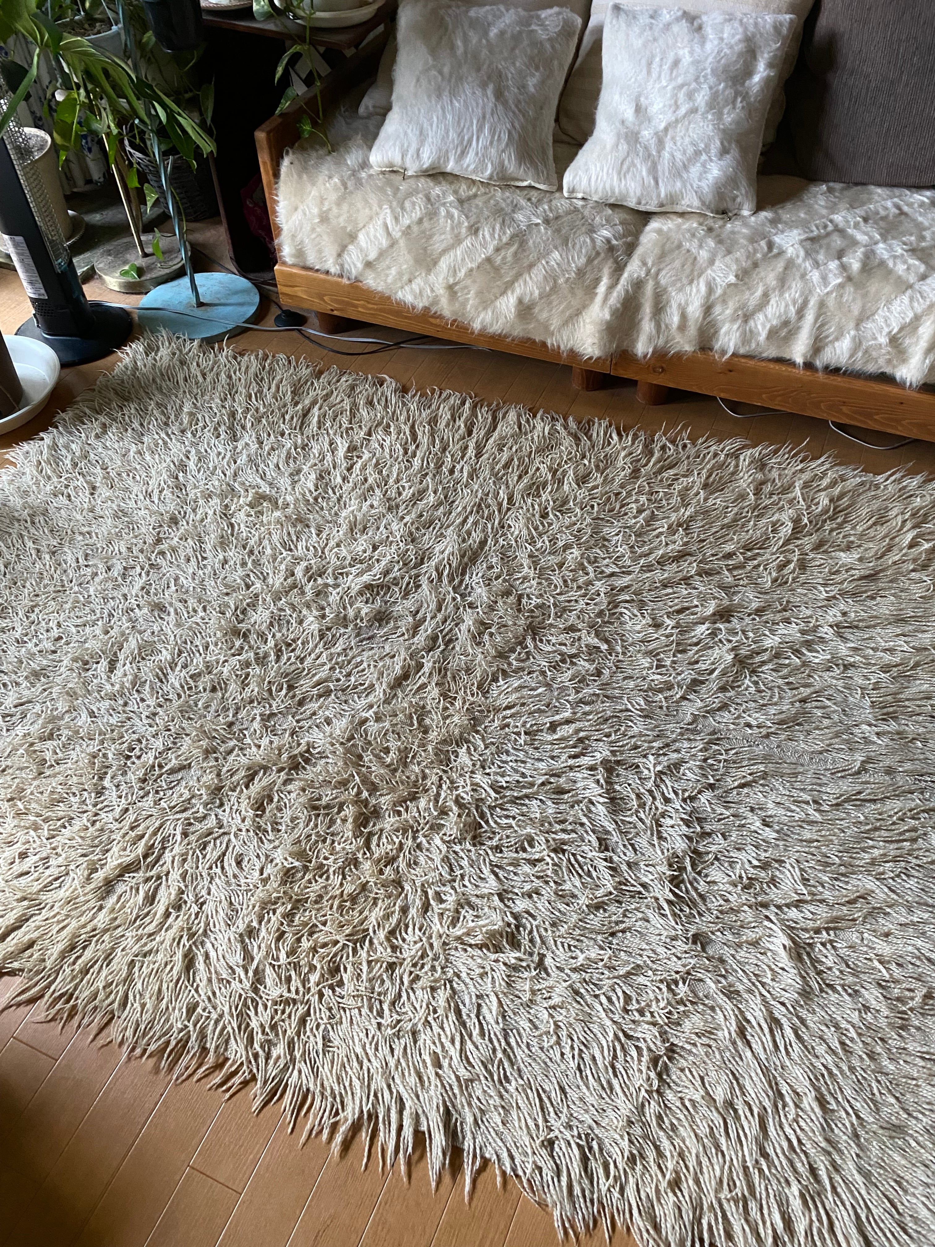 トルコのTULUを知っていますか?こちら大判大変レアなTULU! こちらはベージュがかった 細めの羊毛がびっしり! 撚った毛糸が使われています。 珍しい一枚! 裏は細かい織のキリムで夏場は裏でも!ソファに掛けてノマドみたいな使い方も素敵!羊さんを傷つけないTULU