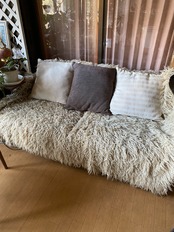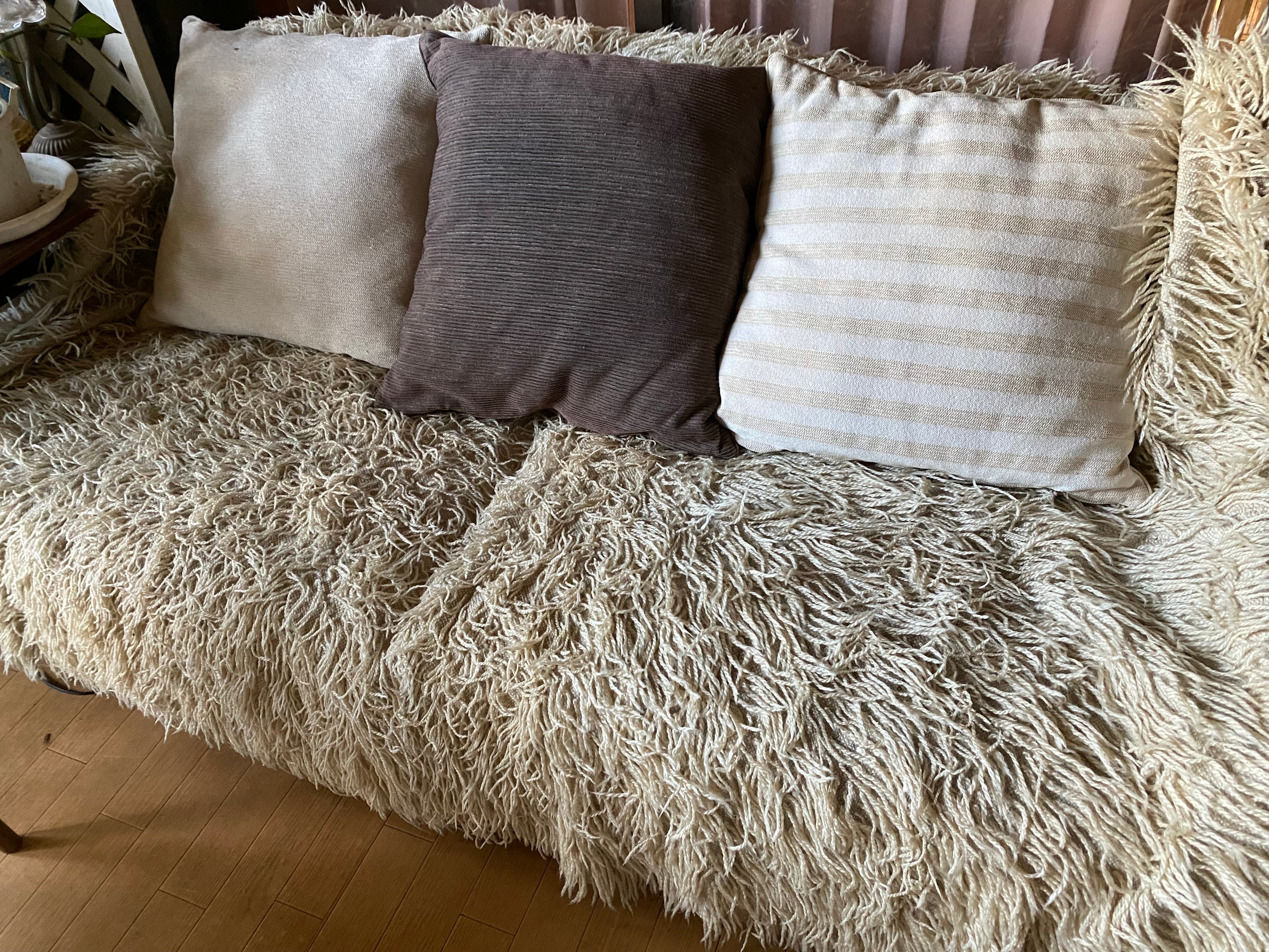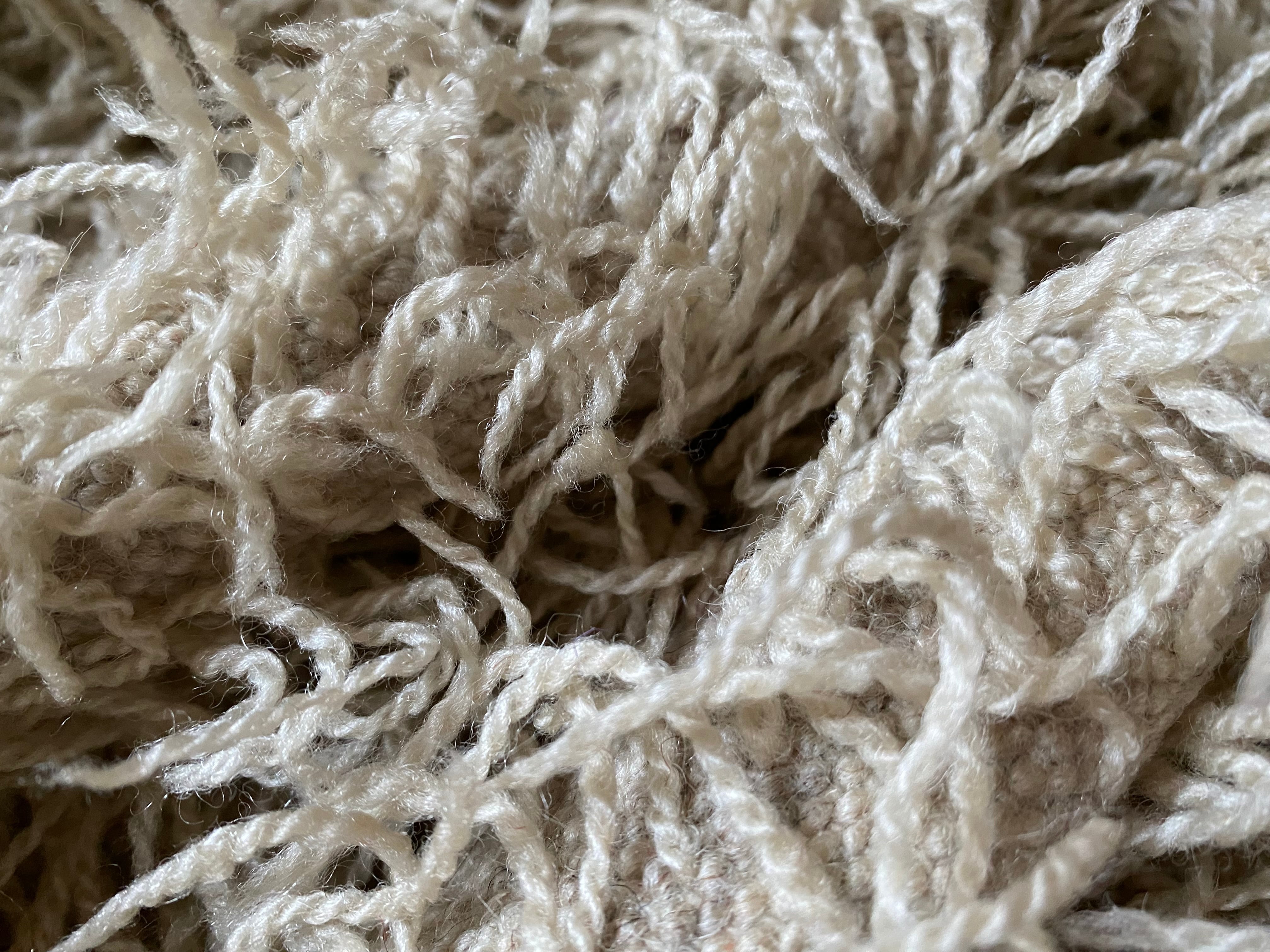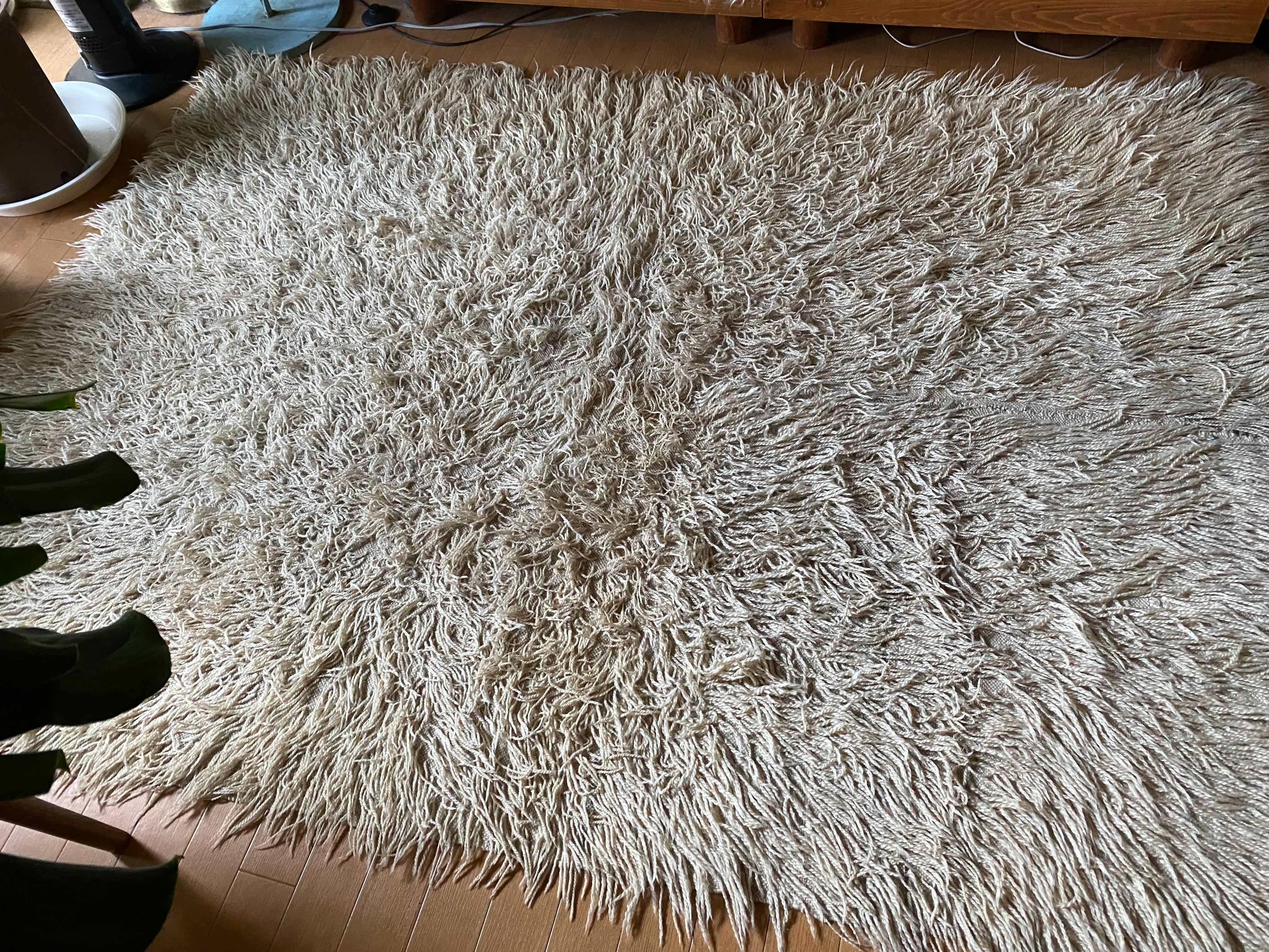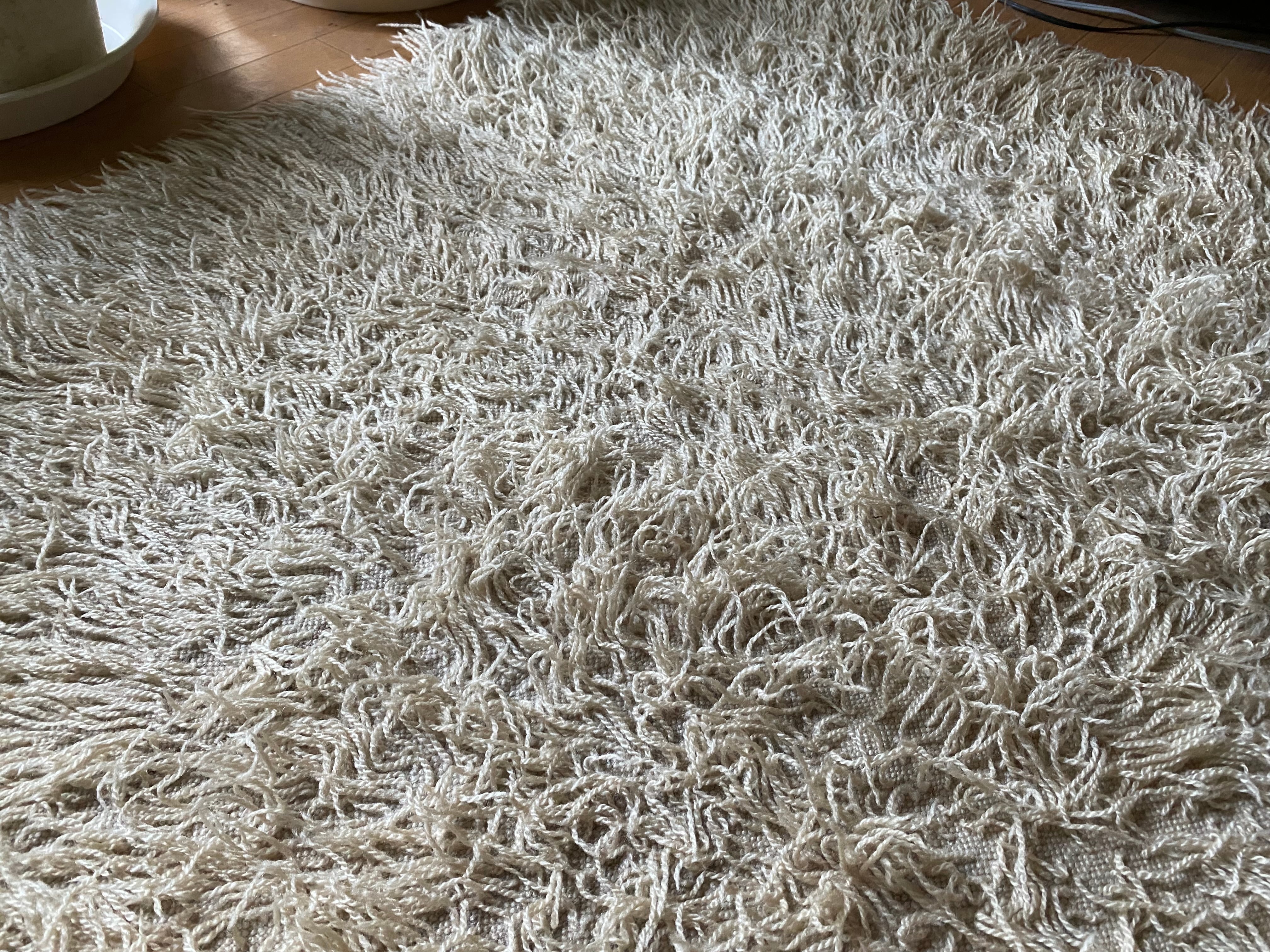 トルコのTULUを知っていますか?こちら大判大変レアなTULU! こちらはベージュがかった 細めの羊毛がびっしり! 撚った毛糸が使われています。 珍しい一枚! 裏は細かい織のキリムで夏場は裏でも!ソファに掛けてノマドみたいな使い方も素敵!羊さんを傷つけないTULU